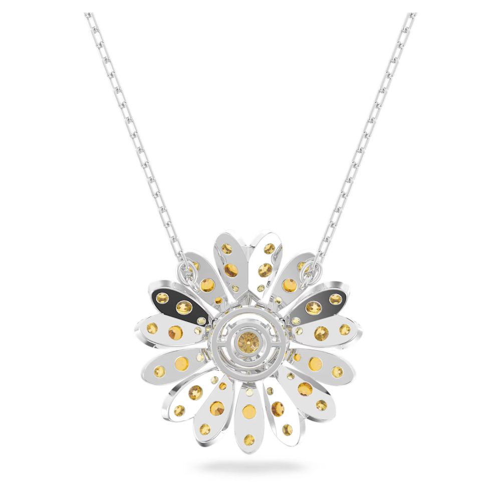 This stunning pendant by Swarovski is the perfect way to add a touch of glamour to any outfit. Inspired by the beauty of a daisy, the pendant features shimmering petals arranged around a single yellow stone, set in a sleek rhodium-plated setting. The pendant is sure to make a statement, whether you wear it with casual daywear or dress it up for an evening look. The delicate design and vibrant yellow stone will add a touch of sparkle to any ensemble. With its timeless beauty, this pendant is sure to become a treasured piece in your jewelry collection. SPECIFICATIONS: