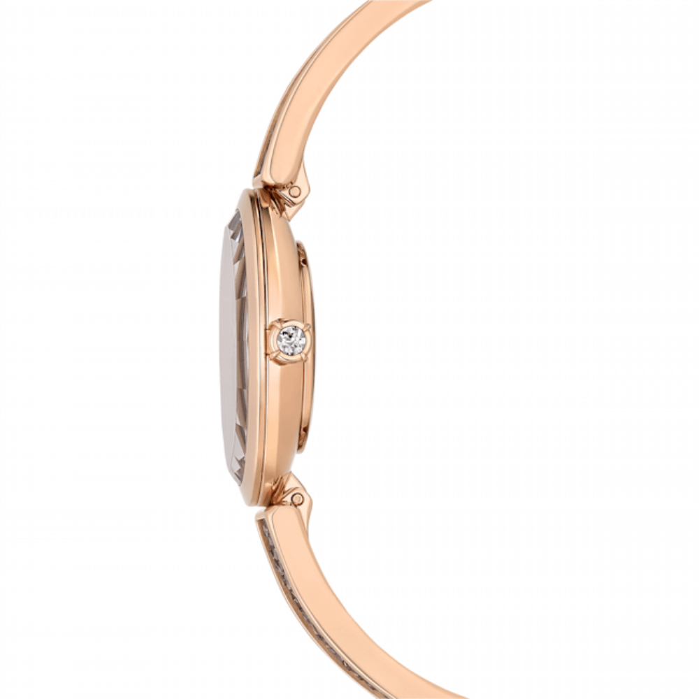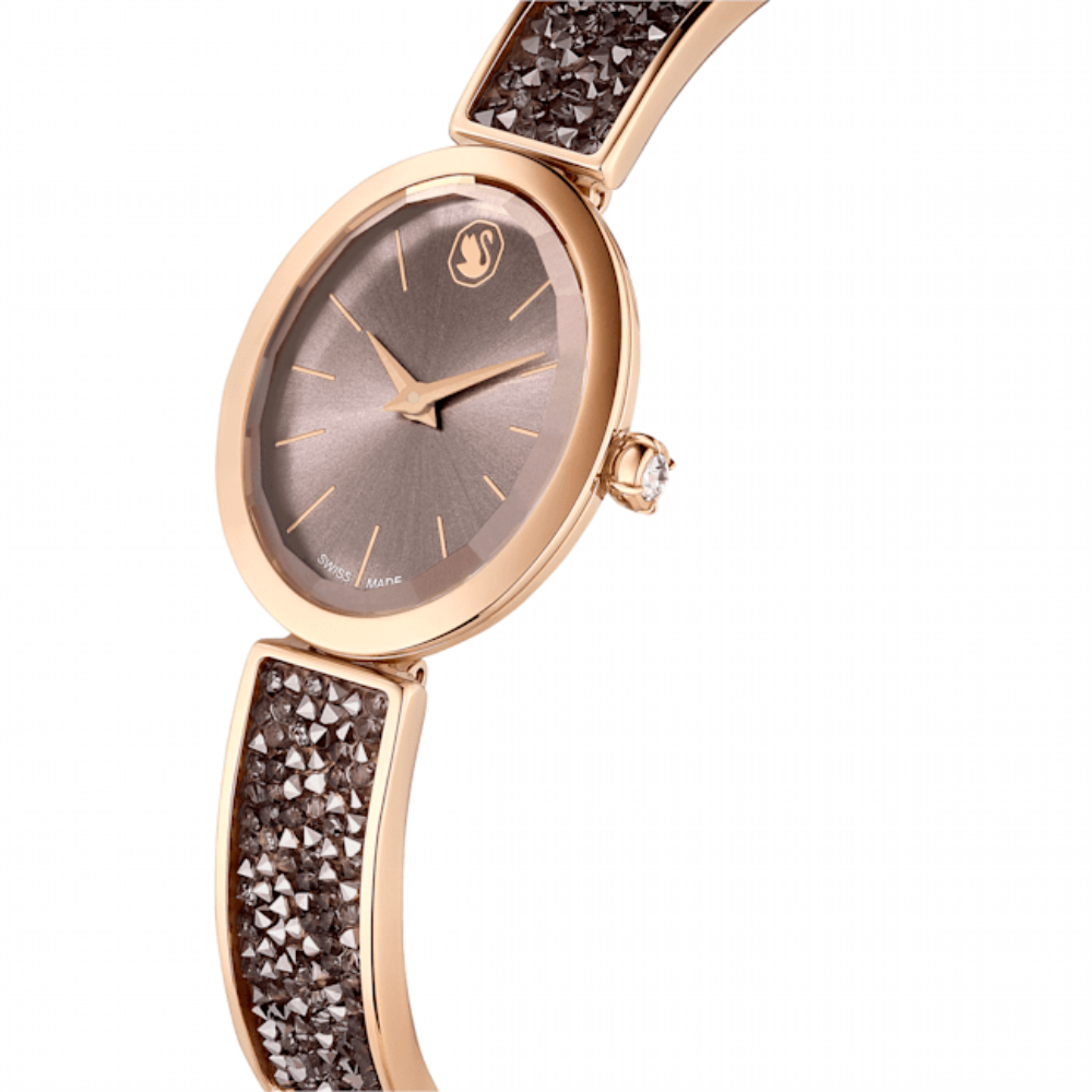 | Swarovski Crystal Rock Oval watch, Swiss Made, Metal bracelet, Black, Rose gold-tone finish. This Crystal Rock Oval watch was designed for stunning glamour. The exquisite oval case measures 26mm x 29mm and has a stunning rose gold-tone finish. A sunray greige dial with the Swarovski swan at 12 o'clock sits behind the faceted glass, and the watch's crown is set with a single stone. The case is mounted on an adjustable metal bracelet studded with around 232 Ultra Fine Crystal Rocks in greige, creating a stunning shimmering appearance. This Swiss-made watch is water-resistant to 50 meters and is designed to keep you on time for everyday situations while also adding a touch of sophistication that will carry you from day to night with ease. SPECIFICATIONS