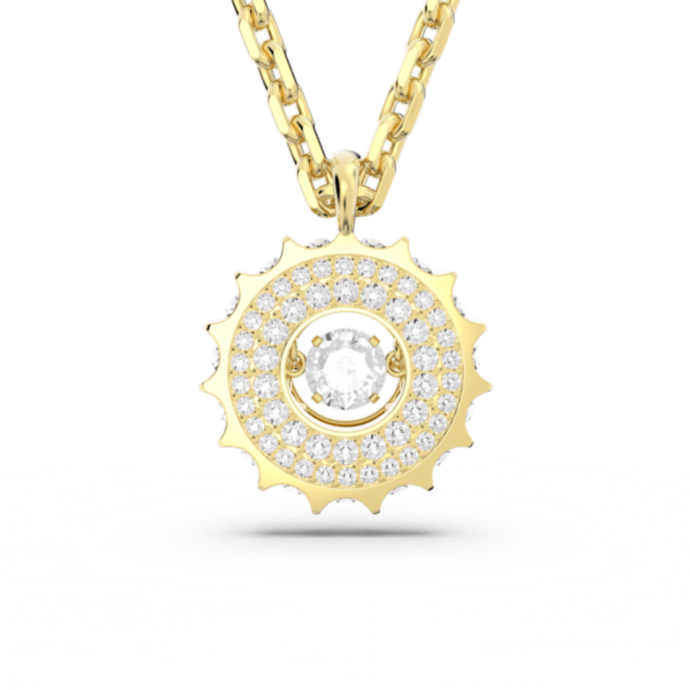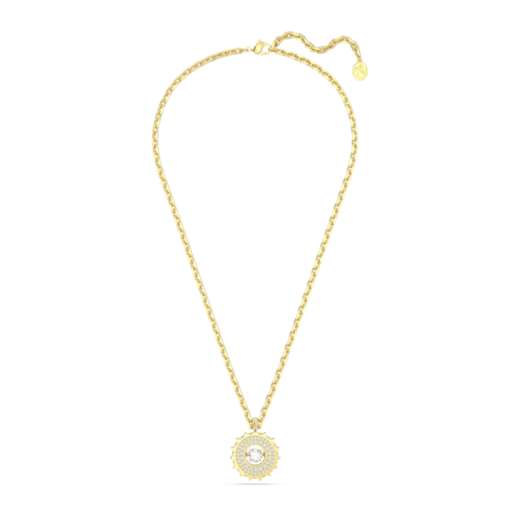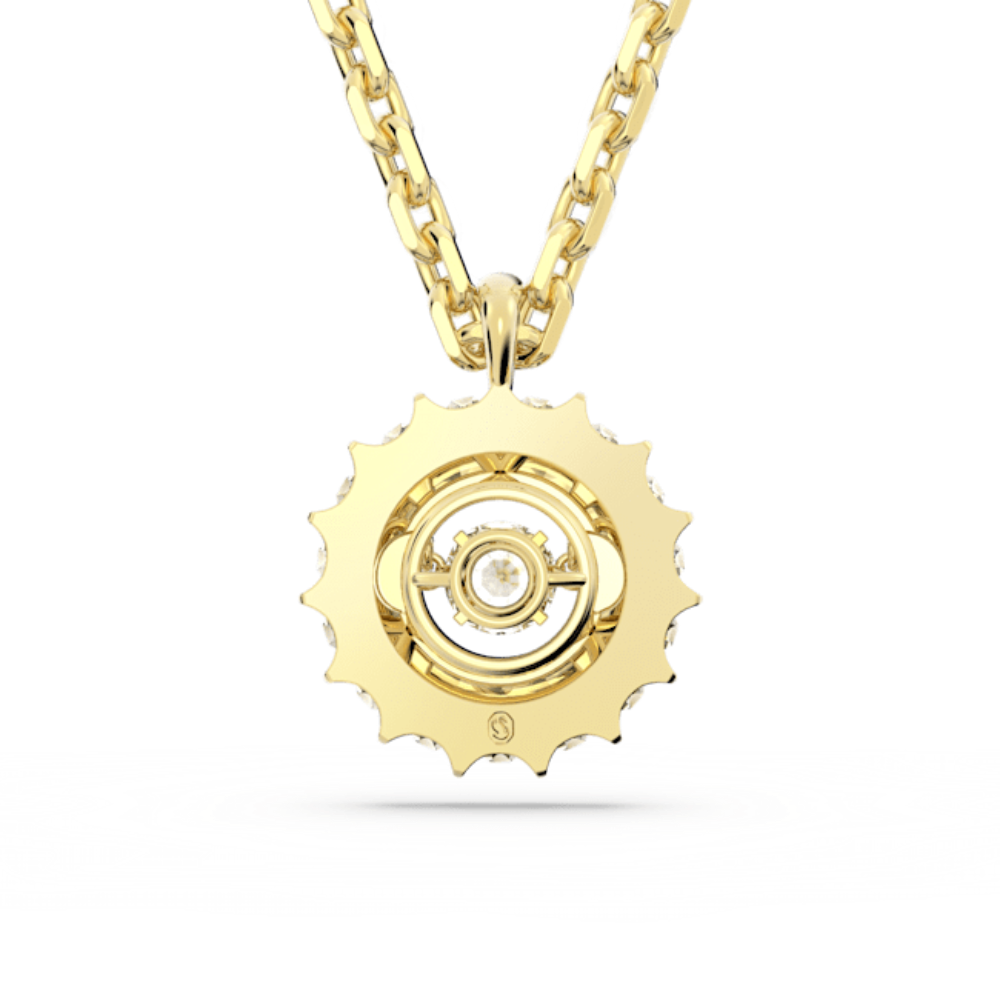| Swarovski Rota Pendant Mixed round cuts, White, Gold-tone plated, The forward-thinking Rota family values stylistic velocity, and this pendant is a signature piece. The pendant, crafted in dazzling gold-tone plating, is inspired by a gear-like form with captivating rings of clear pavé on the front and a clear dancing stone in the center. To catch light, intricate baguette-cut stones are inserted between each ridge. This garment is ideal for casual wear, particularly with tough denim and basic white t-shirts. SPECIFICATIONS