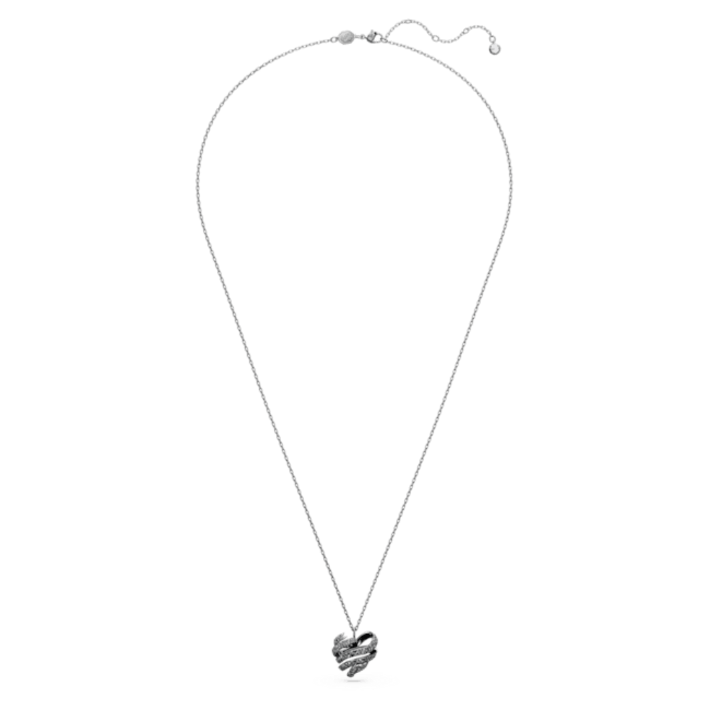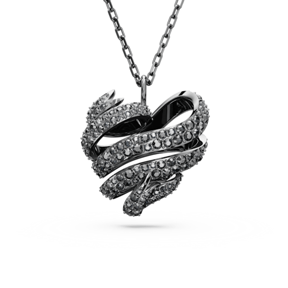 | Swarovski Volta Necklace Heart, Small, Black, Ruthenium Plated. This deep-colored Volta pendant is both edgy and lovely, with a little flowing heart pattern. The ribbon-inspired necklace, worn on a chain, is plated in ruthenium graphite and features a whirling pavé of black crystals. This is the one to go with if you want a mysterious and dark piece of jewelry that sparkles in the light. A fantastic gift for a romantic occasion. SPECIFICATIONS