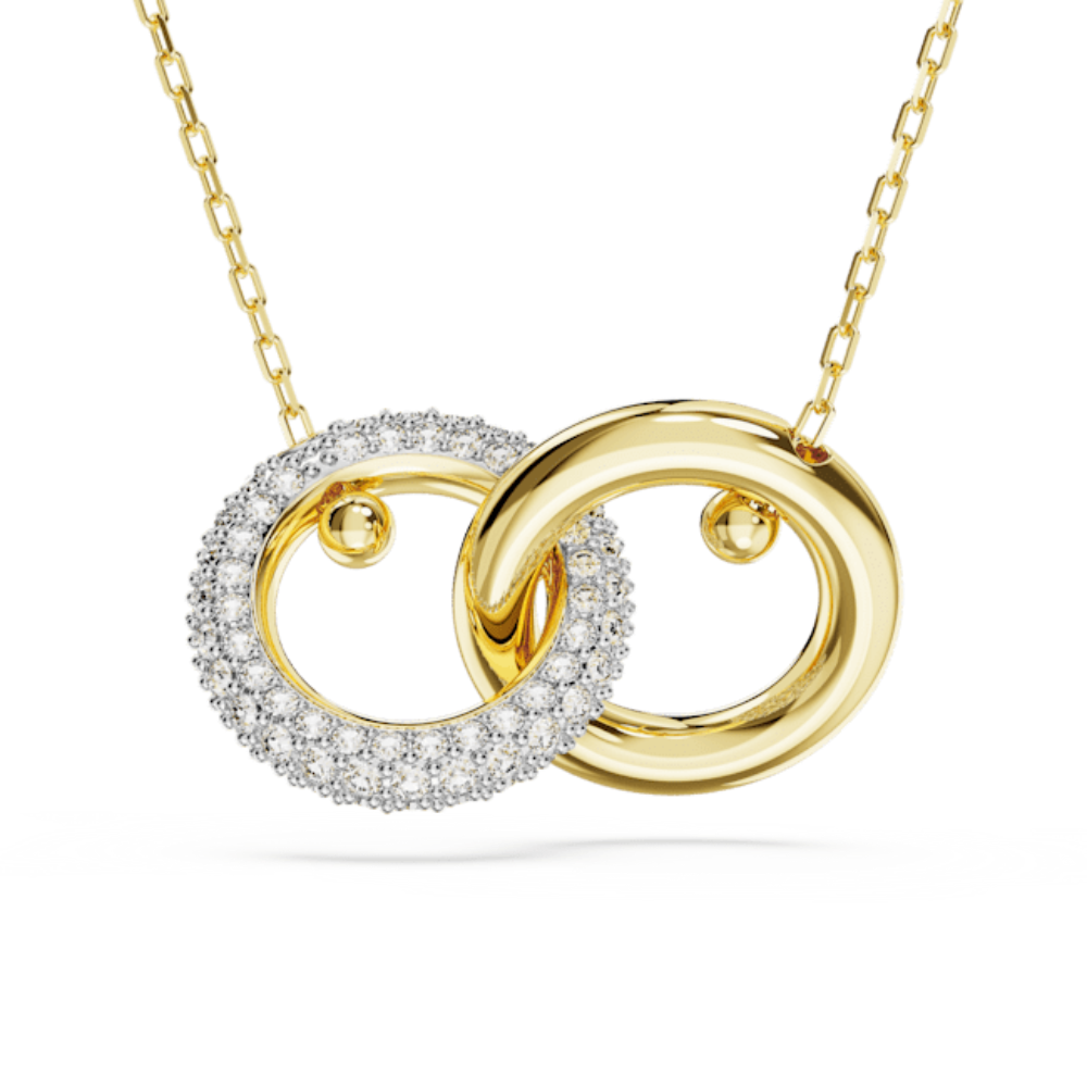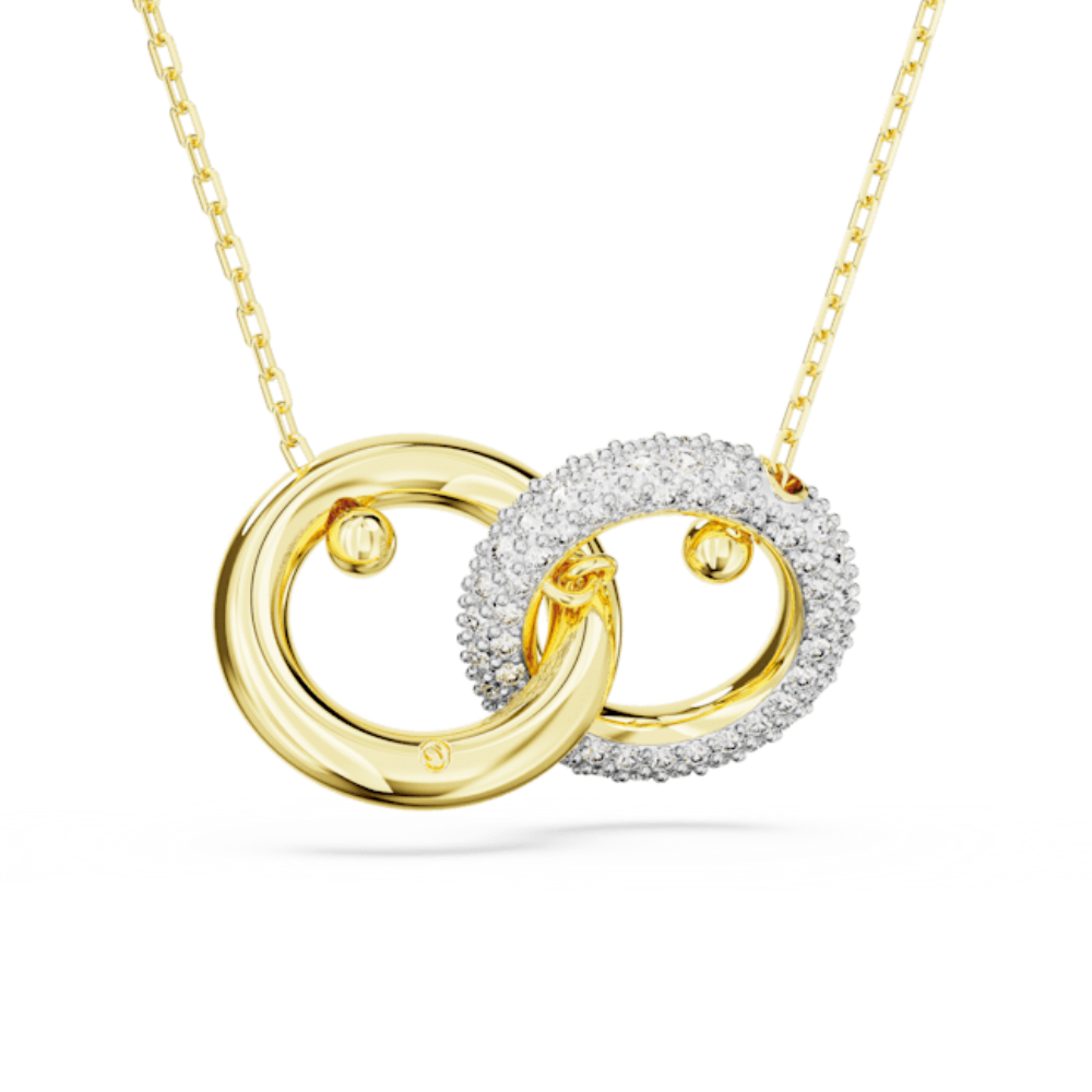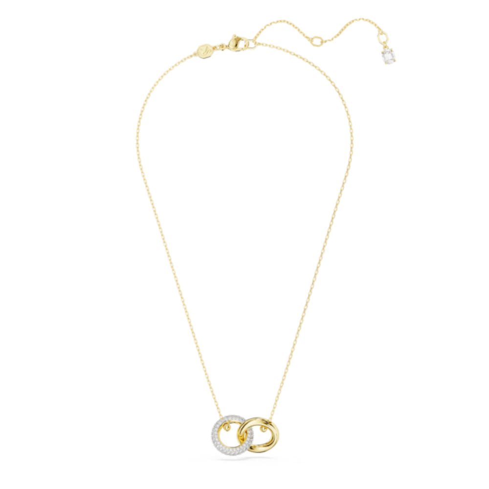 Embrace the spirit of unity with this pendant from the Dextera family. The gold-tone plated design features two interlinked tubular rings, one shimmering with all-over pavé. The delicate chain includes a single Swarovski Zirconia adorning the end for added luxury. Combining bold shapes with radiant clear crystals, this spellbinding piece will maximize your style. Length (minimum - maximum): 38 - 45 cm, Motif size: 1.7 x 2.7 cm
