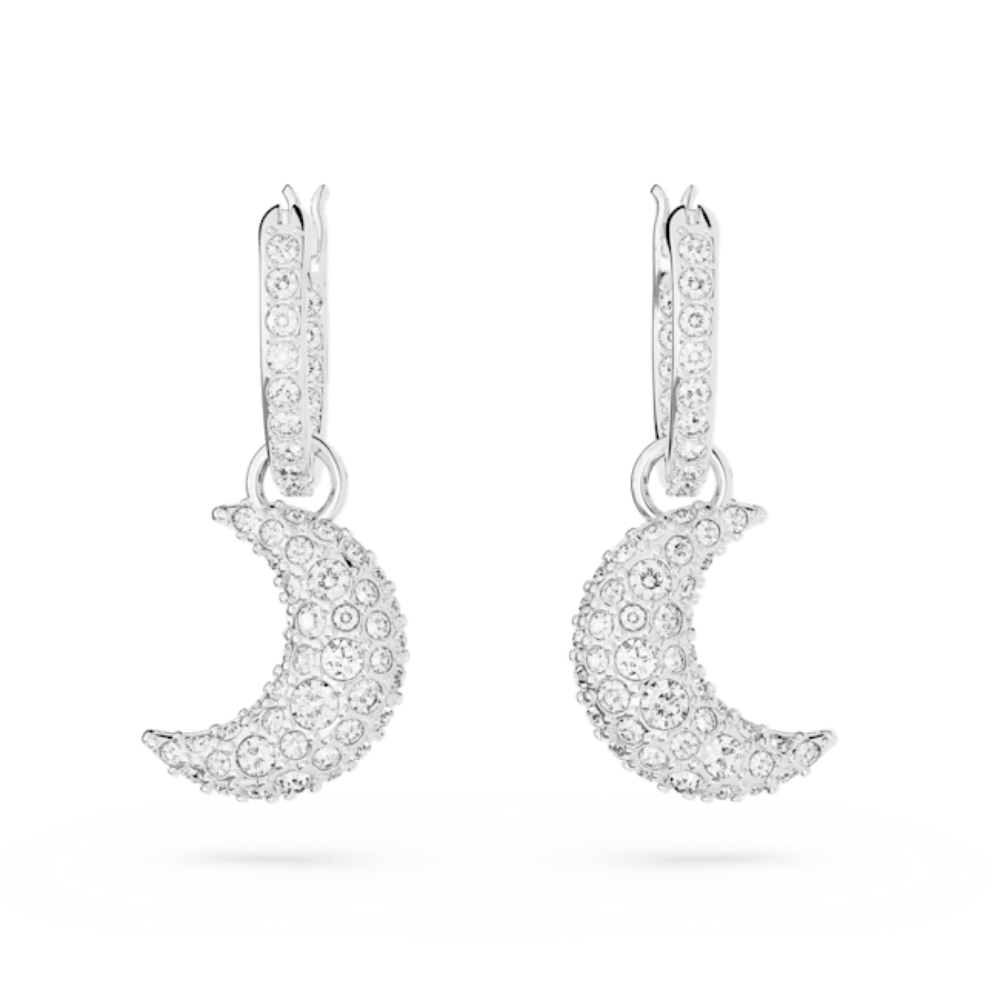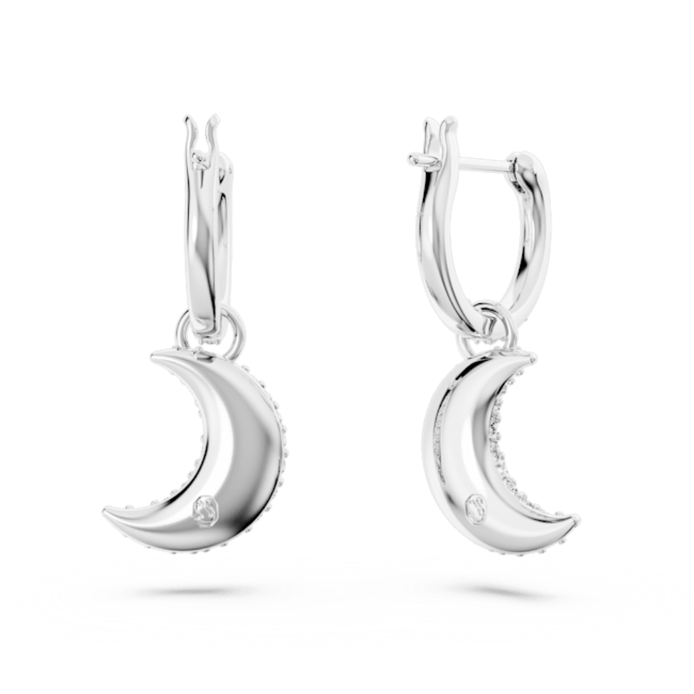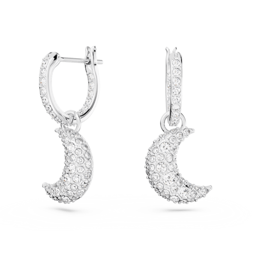 | Swarovski's Luna drop earrings Moon, White, Rhodium plated, Style soars with the Luna family's small hoop earrings. The rhodium-plated design includes an exquisite pair of crescent moons, each adorned with five distinct crystal sizes for a delicate pavé impression. A simple way to add some mystical spirit to any outfit. SPECIFICATIONS