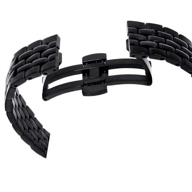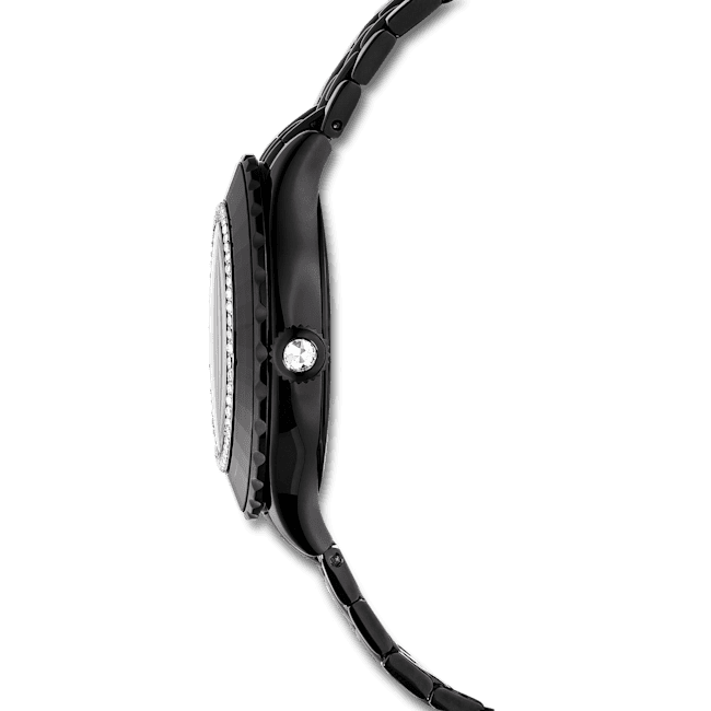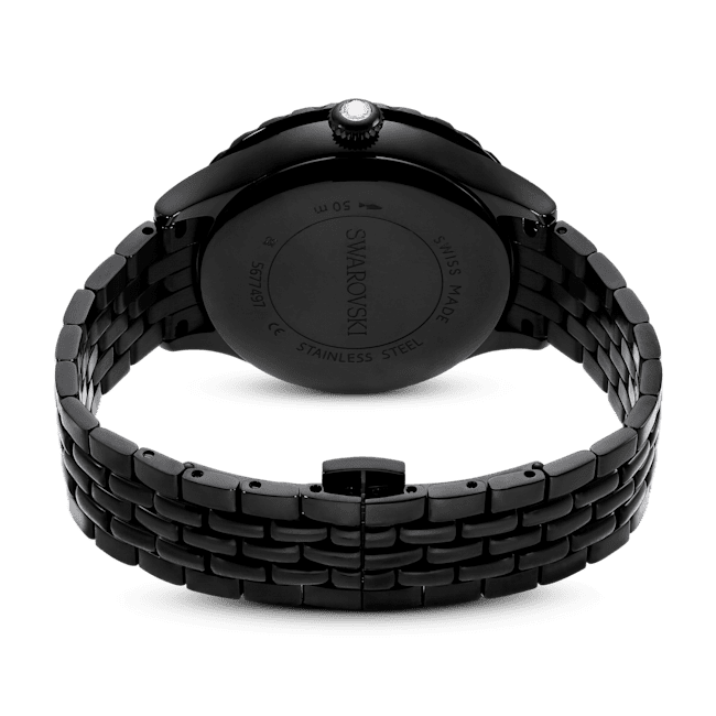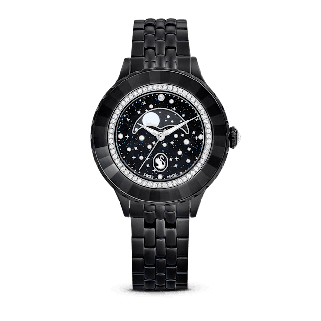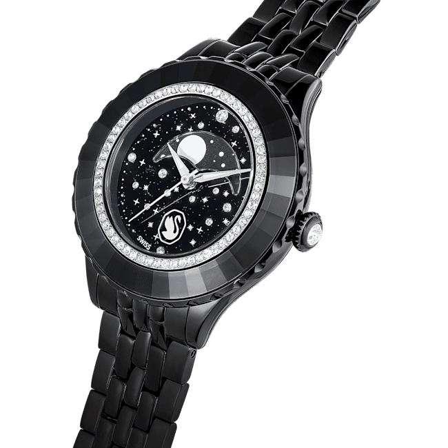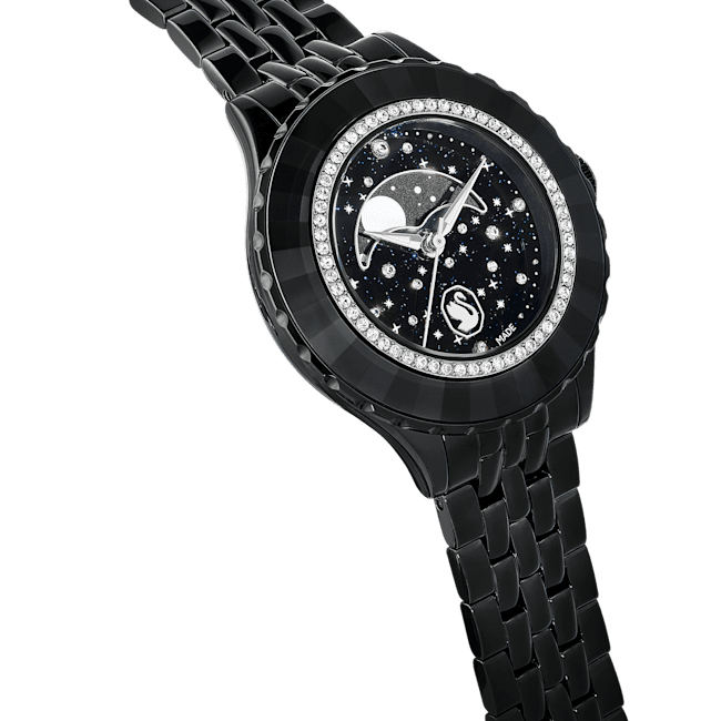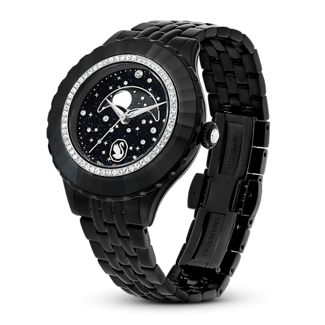 | The Swarovski Octea Moon Black Metal bracelet watch is a stunning timepiece that pays homage to the 55th anniversary of the first moon landing. It features a 37mm metallic case with a sleek black finish and a faceted bezel adorned with black crystals, as well as an inner ring encrusted with shimmering pavé crystals. The dial of the watch is a beautiful black color, adorned with 11 round-cut crystals that represent a starry sky, with an additional four crystals serving as quarter-hour markers. At 6 o’clock, the watch displays a unique moon phase function, showcasing the lunar cycle. The iconic swan logo of Swarovski is also featured on the dial. This watch is worn on a multilinked bracelet with a black finish, completing the overall sophisticated look. As a Swiss made timepiece, it is highly reliable and water resistant to 50 meters. With its celestial design and high-quality craftsmanship, the Swarovski Octea Moon Black Metal bracelet watch is a show-stopping piece that adds a touch of intergalactic charm to any outfit. SPECIFICATIONS • Brand: Swarovski • Gender: Unisex • Collection: Octea Moon • Case size: 42.6 mm x 37 mm • Watch strap length: 16.5 cm • Material: Crystals, Black PVD • Color: Black • Clasp type: Butterfly clasp • Strap material: Metal • Made in: Switzerland • Mechanism: Quartz Care & Maintenance • Store your jewelry in the original packaging or a soft pouch to avoid scratches. • Avoid contact with water. • Remove jewelry before washing hands, swimming, and/or applying products (e.g. perfume, hairspray, soap, or lotion), as this could harm the metal and reduce the life of the plating. • Avoid hard contact (i.e. knocking against objects) that can scratch or chip the crystal. |