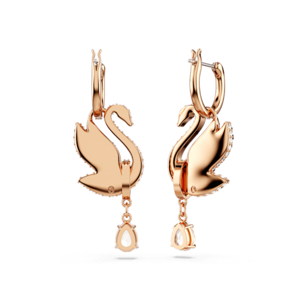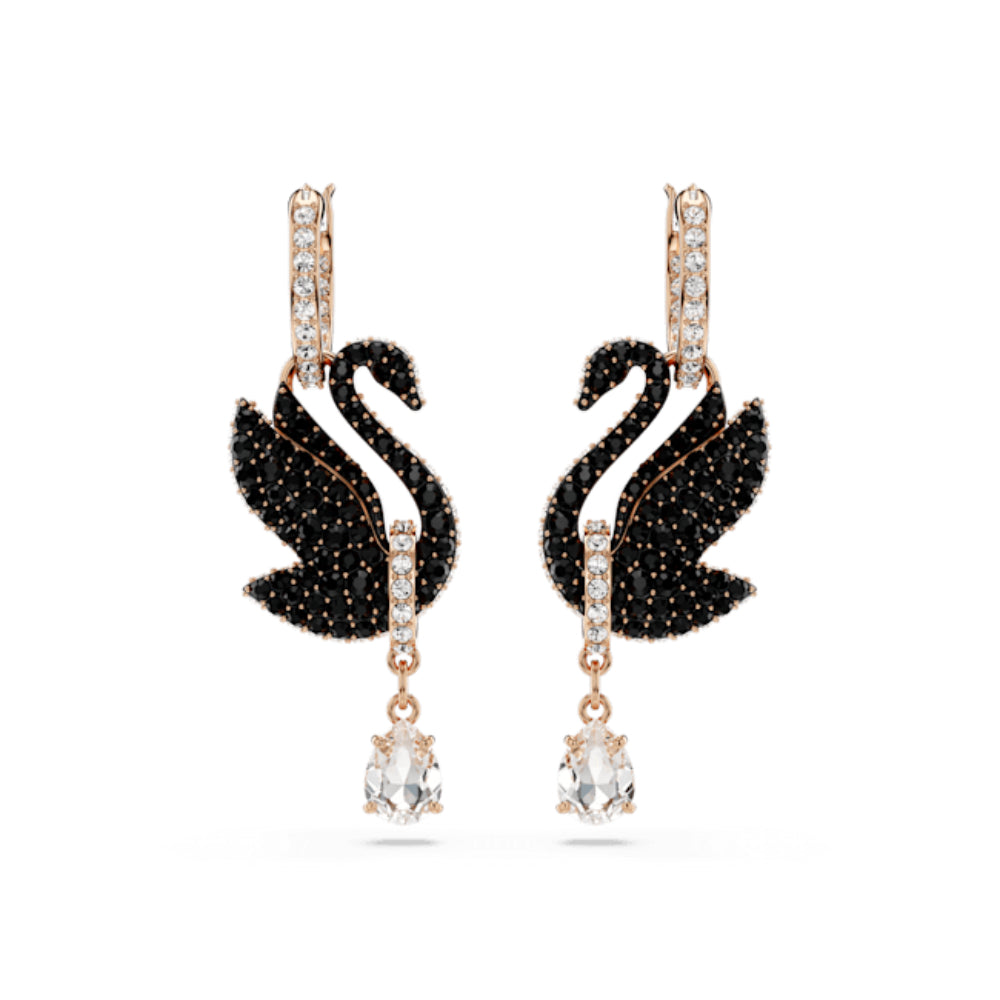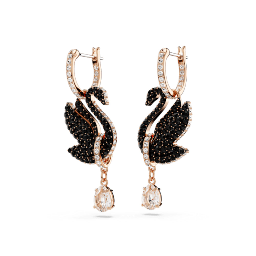 | Swarovski Swan Drop Earrings. Swan, black, rose gold-plated, These eye-catching earrings are a stunning representation of Swarovski's distinctive logo. Connected to small hoops, each rose gold-tone plated piece boasts a beautiful swan motif, expertly adorned with jet black Swarovski ReCreated™ crystals. A transparent, pear-cut Swarovski Zirconia hangs softly beneath a rose gold-tone link. Wear these earrings to enhance your own look, or give them as a radiant gift to a loved one. SPECIFICATIONS