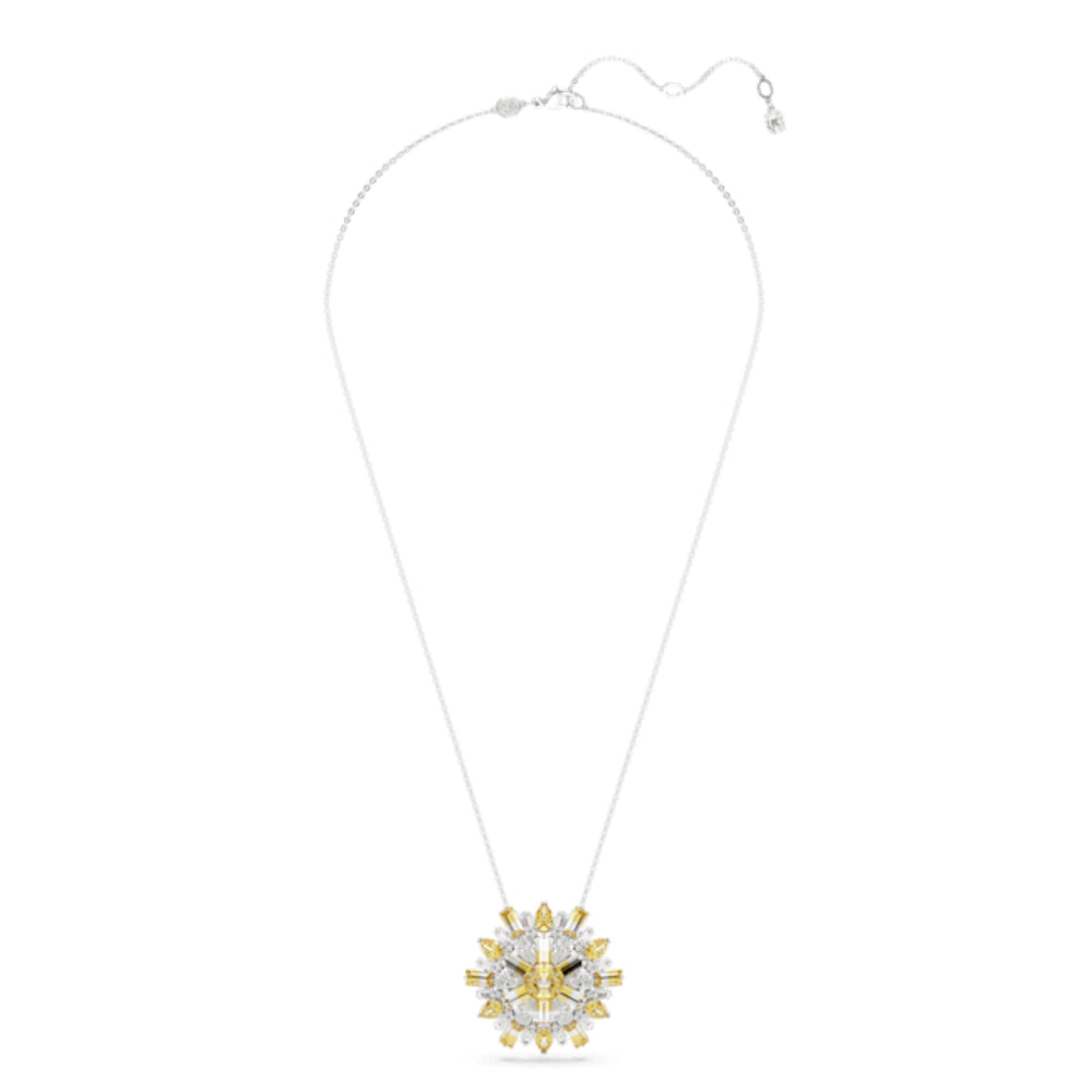| Swarovski Idyllia Pendant and Brooch Flower Necklace, Long, Yellow, Rhodium plated. This vibrant and adaptable Idyllia jewelry, made with great craftsmanship, can be worn as a gorgeous pendant or a brooch. The rhodium-plated design contains a brilliant flower motif made exactly from yellow and clear Swarovski Zirconia, as well as a complicated arrangement and gradient effect that captures the inner radiance. It can be worn as a radiant statement pendant on the long chain or as a brooch by removing the motif. SPECIFICATIONS