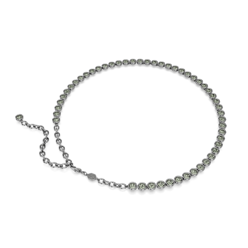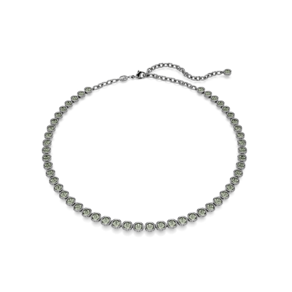 | Swarovski Imber Tennis Necklace Round cut, gray, ruthenium-plated, This intriguing Imber tennis bracelet features deep tones and superb faceting. The ruthenium-plated design includes a strand of black round-cut crystals in a puffy bezel setting, as well as a lobster closure. An excellent choice for casual style or elevating an evening appearance. SPECIFICATIONS