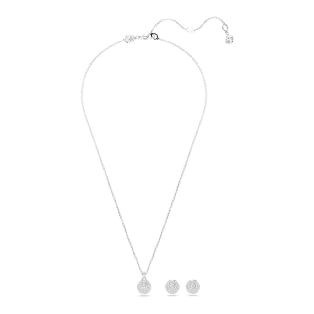Swarovski Meteora Set (necklace and earrings) White, Rhodium-plated. This rhodium-plated jewelry set mixes celestial influence with Swarovski craftsmanship. The radiant pendant is worn on a delicate chain with a lobster clasp and features a domed meteor design wonderfully embellished with a snow pavé of clear round crystals in various sizes. The pierced studs have the same sparkling pattern and come with a shiny ball clasp. A fantastic gift for a loved one or for your own eye-catching look.