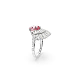 | Swarovski Idyllia Cocktail Ring: Mixed Cuts Shell Pink Rhodium Plated, This appealing ring is inspired by serene and beautiful days by the sea, with a shell-like motif that will improve any outfit. The design is rhodium plated and has an assortment of transparent Swarovski Zirconia and a bright pink central crystal. Wear it every day to add a bit of fun and refinement. SPECIFICATIONS