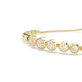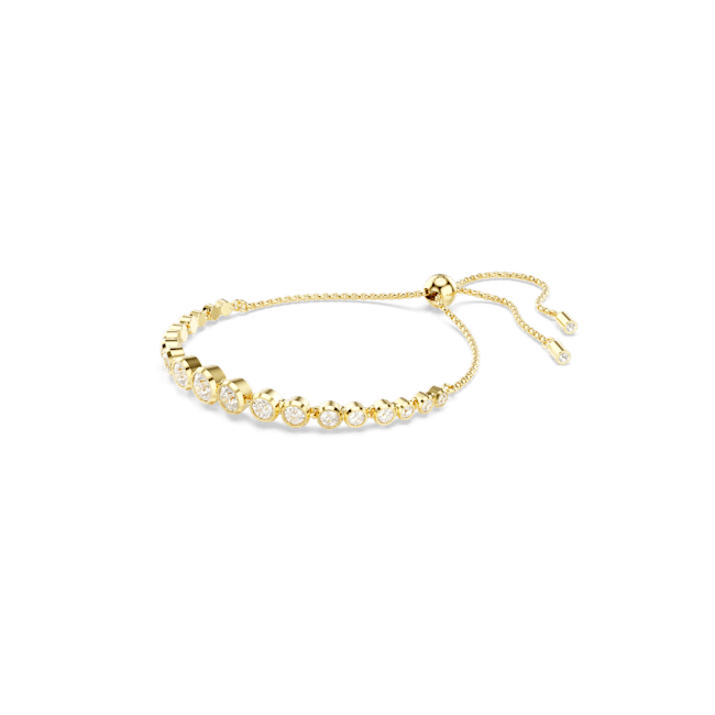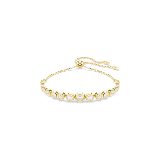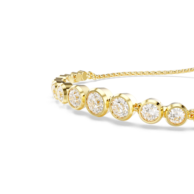Made for everyday elegance, this gold-tone plated bracelet exudes the simplicity of the Imber family. The design features a gradient of clear round-cut crystals, each placed in a modern bezel setting on a soft chain, with a sliding closure for easy wearability. Each delicate drop provides glowing sophistication for your wrist, giving you a go-to piece of jewelry that can be playfully stacked with other styles.