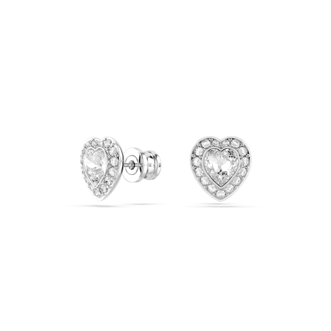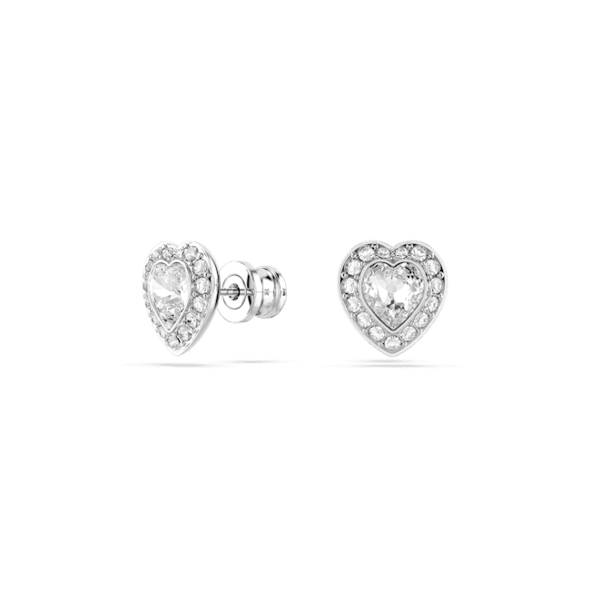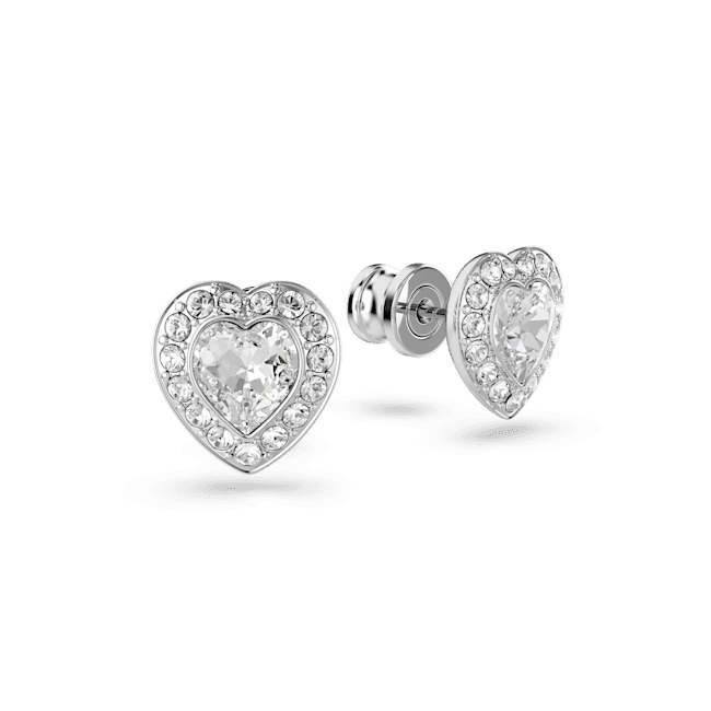 Swarovski Ariana Grande × Swarovski stud earrings Mixed cuts. Heart White Rhodium plated, this joyous pair of Swarovski pierced earrings combines two hearts into one. Each rhodium-plated piece includes a heart-shaped crystal encircled by a sparkling halo of clear pavé. Combine them with the matching pendant to create a brilliant gift of love.