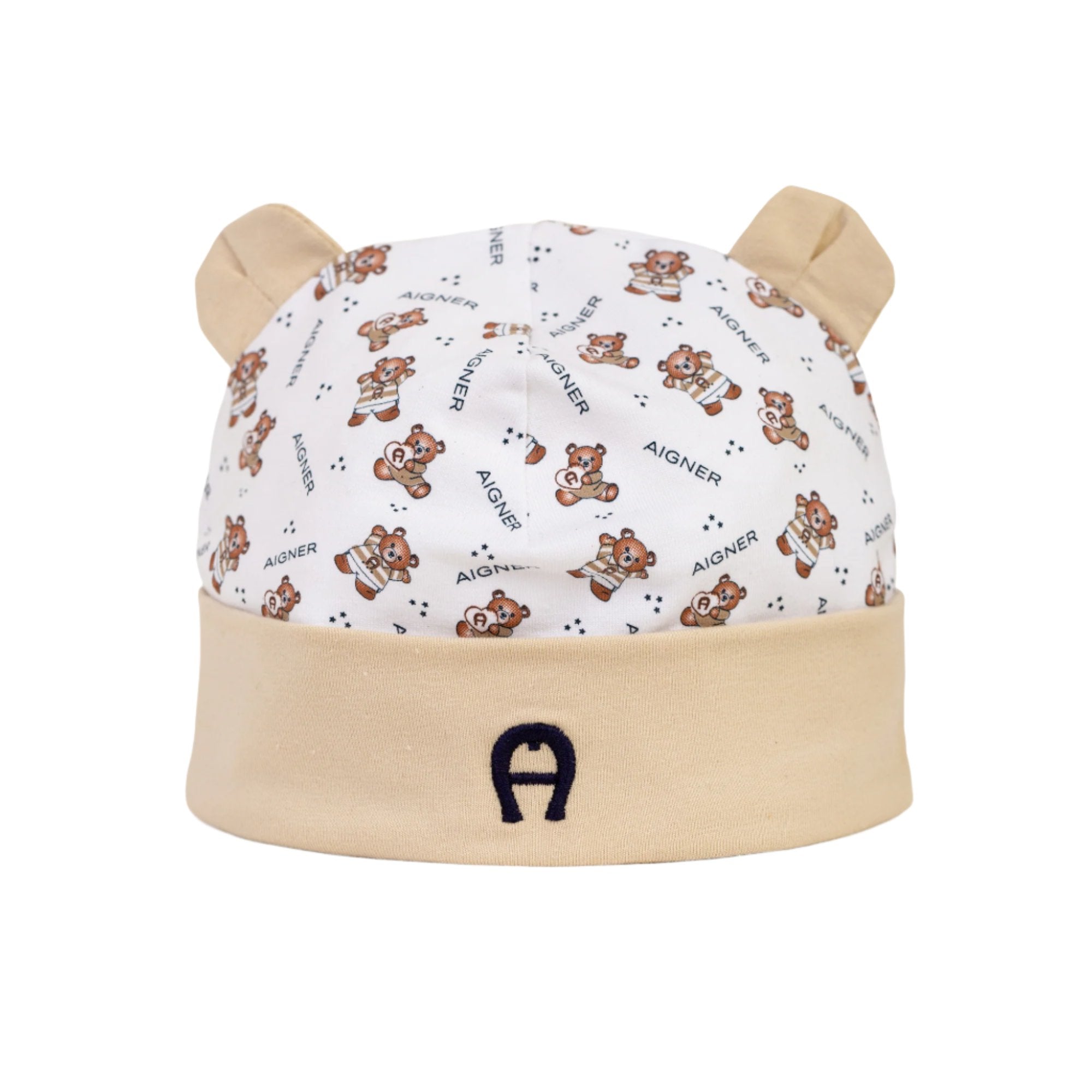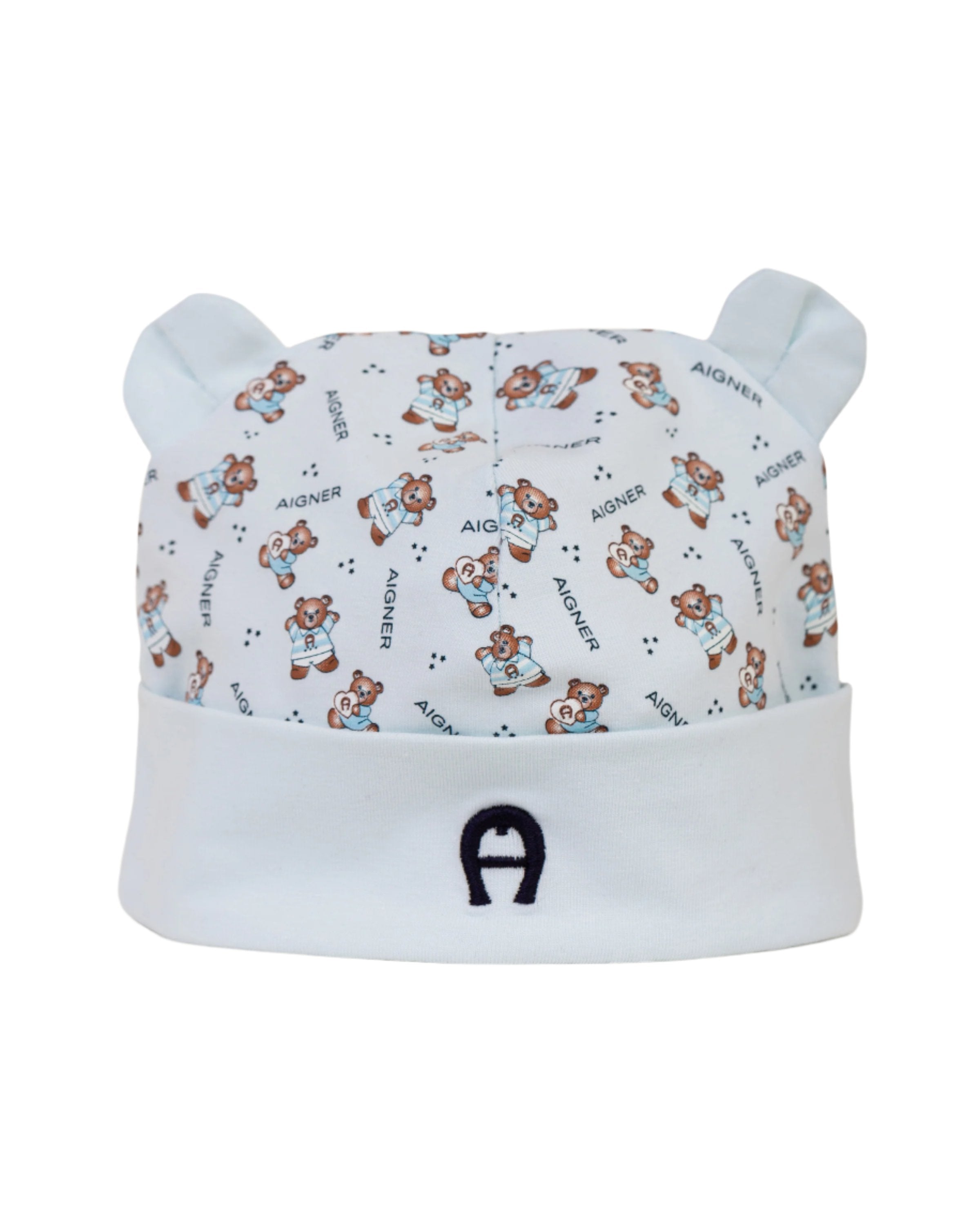The Aigner Kids New Born Set of Sleepsuit, Bib, and Hat is the perfect addition to any new baby's wardrobe. Made from soft cotton, this set is gentle and comfortable on delicate newborn skin. The set includes a sleepsuit, bib, and hat, all featuring the brand's iconic teddy bear applique and embroidered logo. The sleepsuit is designed for easy dressing with popper fastenings at the back and between the legs. The front of the sleepsuit features the brand's iconic teddy bear applique and embroidered logo, adding a charming touch to the set. The matching hat also features an adorable ear applique and the brand's iconic horseshoe logo embroidered on the front. Both the sleepsuit and the hat also have the brand's logo and teddy bear logo printed pattern, making them instantly recognizable as Aigner Kids products. The set is not only stylish but also practical, as the soft cotton material is gentle on delicate newborn skin. It is the perfect set for a cozy and comfortable sleep or a day out and about.