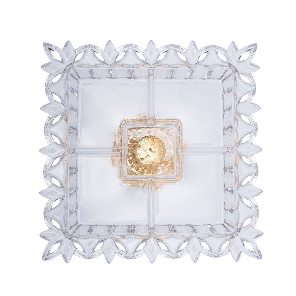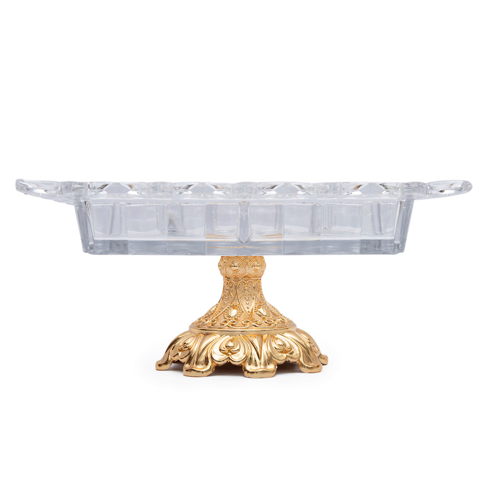 The Cristal De Paris Pickle Dish 5 Parts On Gold Metal Base 35x35x11 Cm is a luxurious piece of handmade crystal art. The elegant gold metal base provides a striking contrast and frames the five part pickle dish. The five unique sections make this exquisite centerpiece perfect for serving a variety of dishes or as an impressive stand alone decor statement. Each of the five parts has been hand cut for intricate detail in the pattern.The light reflecting off the crystal creates a beautiful sparkling display. Whether sitting atop your table or displayed in a buffet line, this pickle dish is sure to make a bold and sophisticated statement at your next event. The combination of gold and crystal make for a stunning and timeless accent piece in any home. This pickle dish makes a striking and memorable statement and is great for all occasions. It can be used as a serving tray or for display in brilliant light. The dish’s dimensions of 35x35x11 cm make it ideal for a variety of uses. Quality craftsmanship makes the pickle dish a luxurious and eye-catching piece of art that can be passed down through generations. SPECIFICATIONS