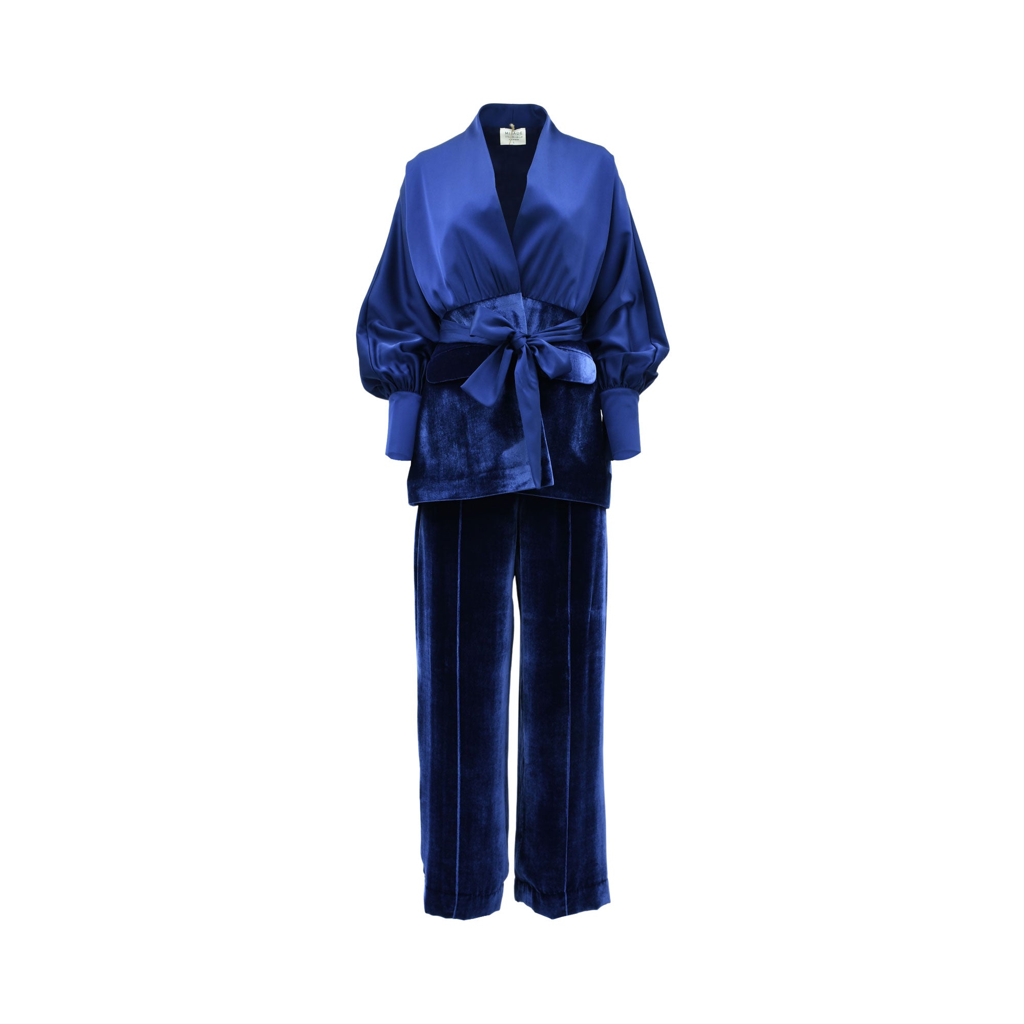 This Mijade Fashion blazer and trouser set is the perfect addition to any stylish woman's wardrobe. The blazer comes in a beautiful royal blue color that adds a touch of sophistication to any outfit. It features long cuff sleeves, giving it a chic and modern look. The blazer also has a belt fastening, which helps to cinch in the waist for a more flattering silhouette. This feature also allows for customizable fit and adds a stylish detail to the outfit. The front of the blazer has two pockets, making it practical and functional for everyday wear. The fabric used for this blazer is a mix of velvet and silk, giving it a luxurious and elegant feel. This combination of fabrics not only adds a touch of glamour, but it also makes the blazer soft and comfortable to wear. This Mijade Fashion blazer and trouser set is a versatile and fashionable choice for any occasion. It can be dressed up for a formal event or dressed down for a more casual look, making it a must-have for any stylish woman. SPECIFICATIONS