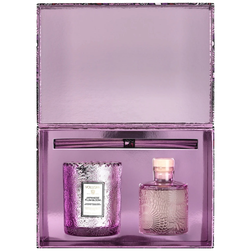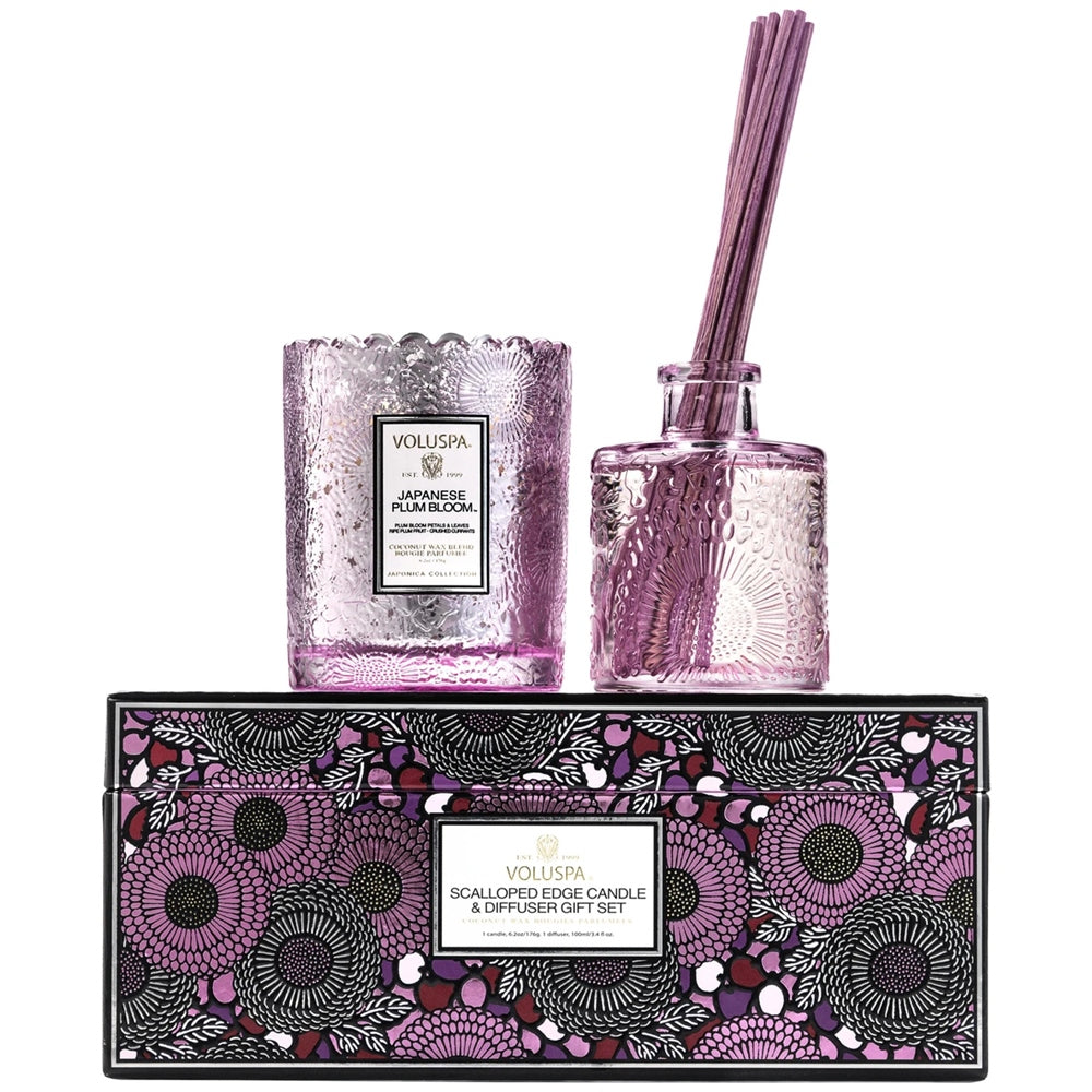 Voluspa Japanese Plum Bloom- Scalloped Edge Candle And Diffuser Gift Set-