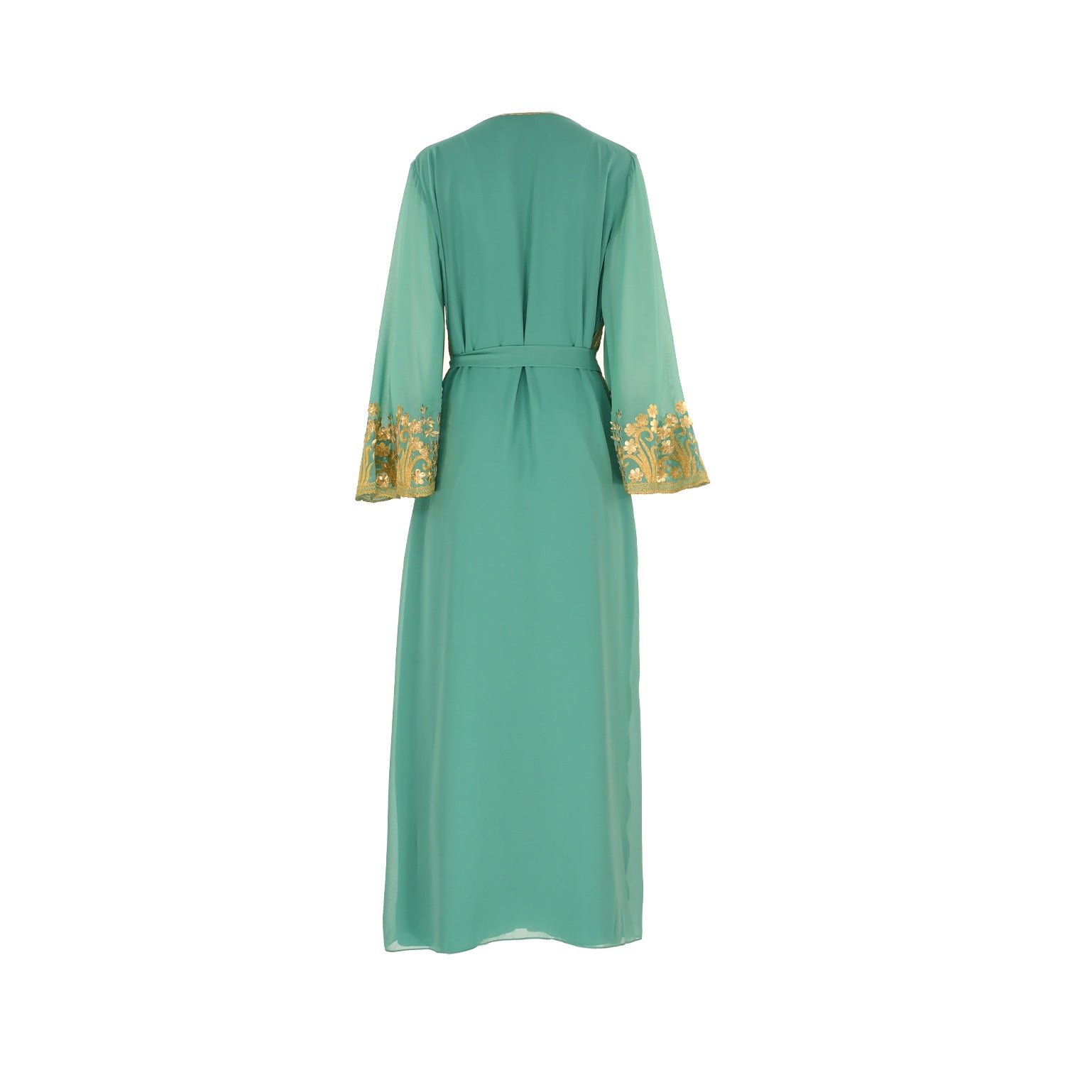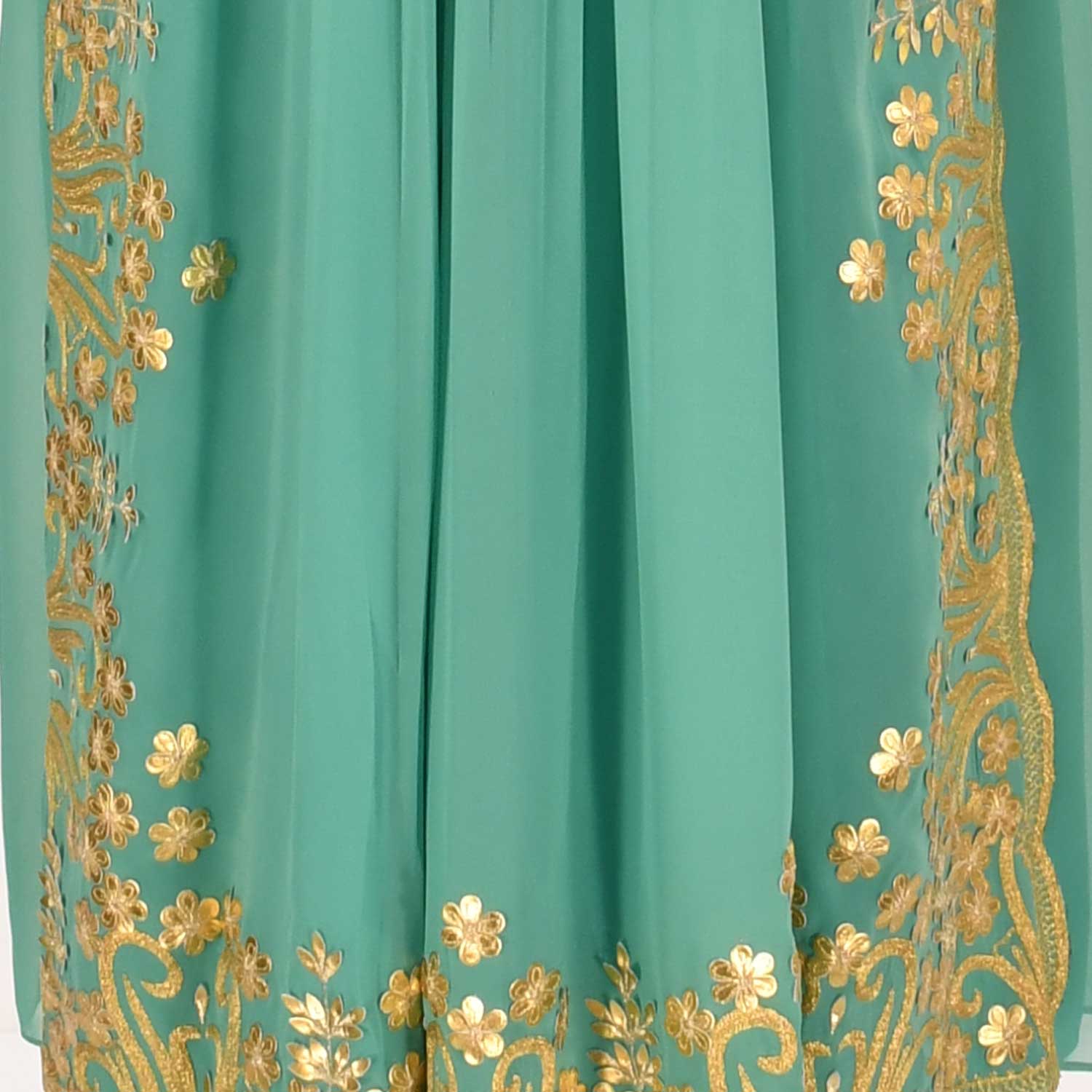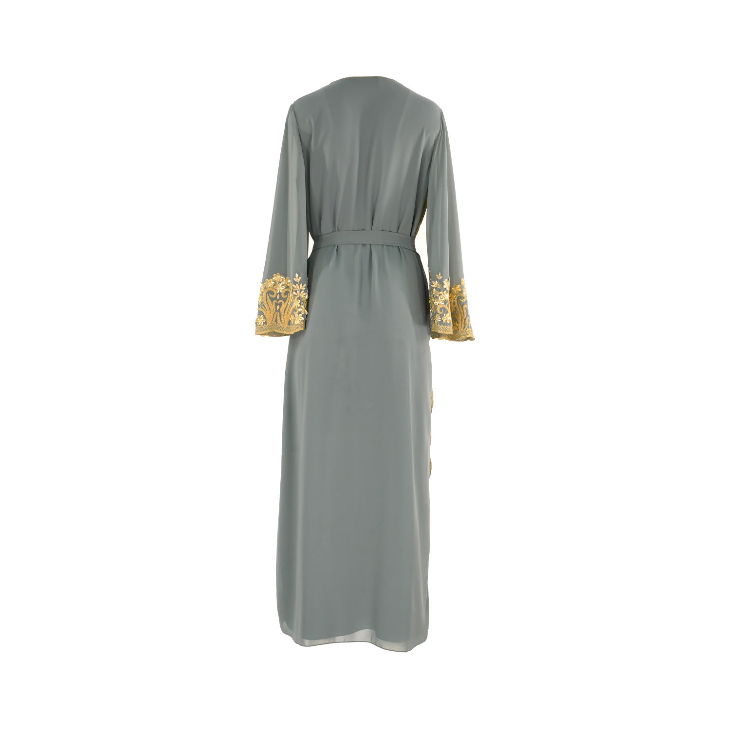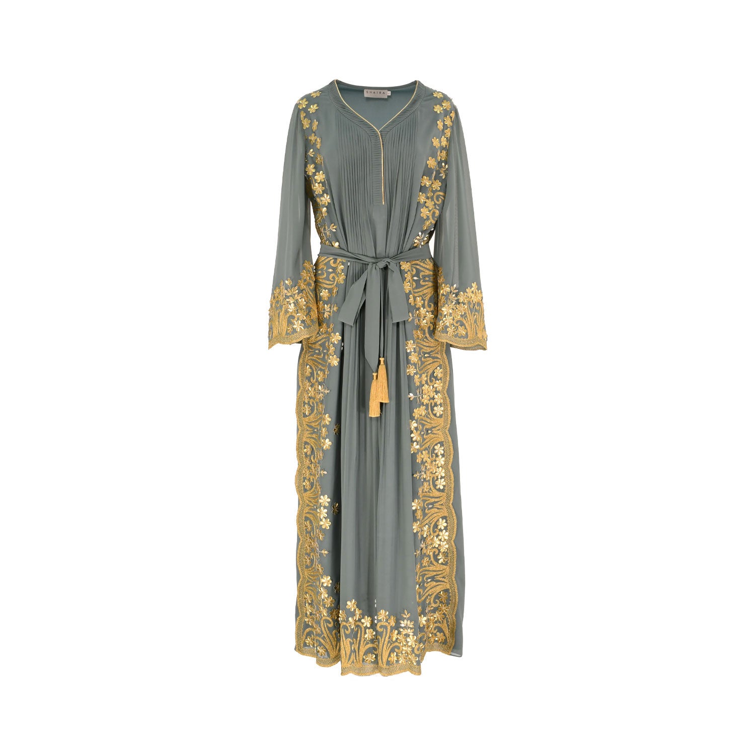 The Shaira Women's Jalabiya is a beautiful and elegant garment that is perfect for any special occasion. It features a golden scallop embroidery to the front and sleeves, a v-neckline, long sleeves, and a waist tie-up belt with tassels. The fabric is made of chiffon and it has a full length with a pleated design to the front. This jalabiya is sure to make you look stunning and will be sure to turn heads. The fabric is lightweight and comfortable, making it perfect for any season. The waist tie-up belt with tassels adds a touch of sophistication and elegance to the look. This jalabiya is sure to make you look and feel beautiful. SPECIFICATIONS: