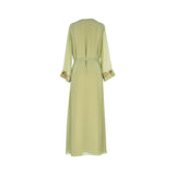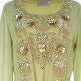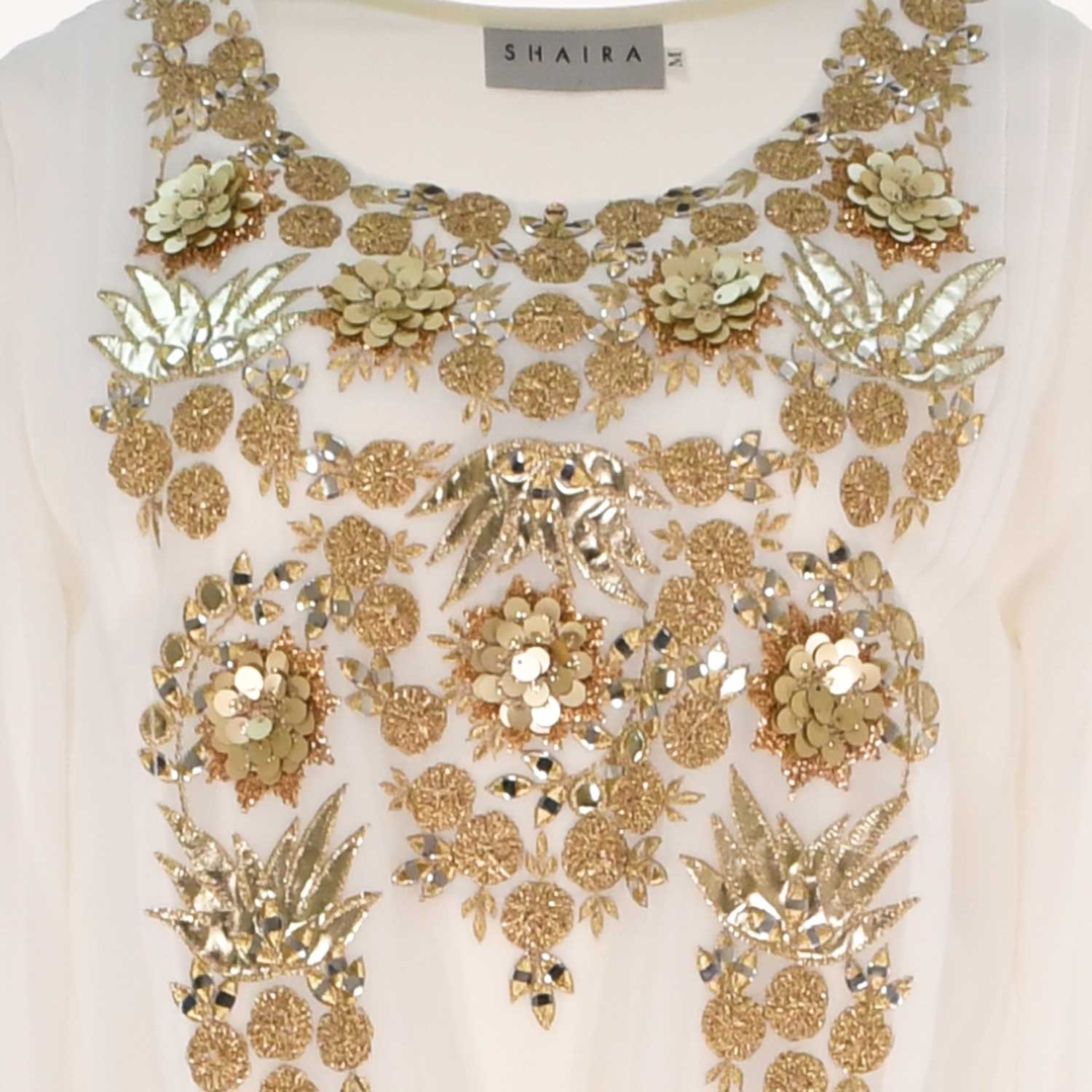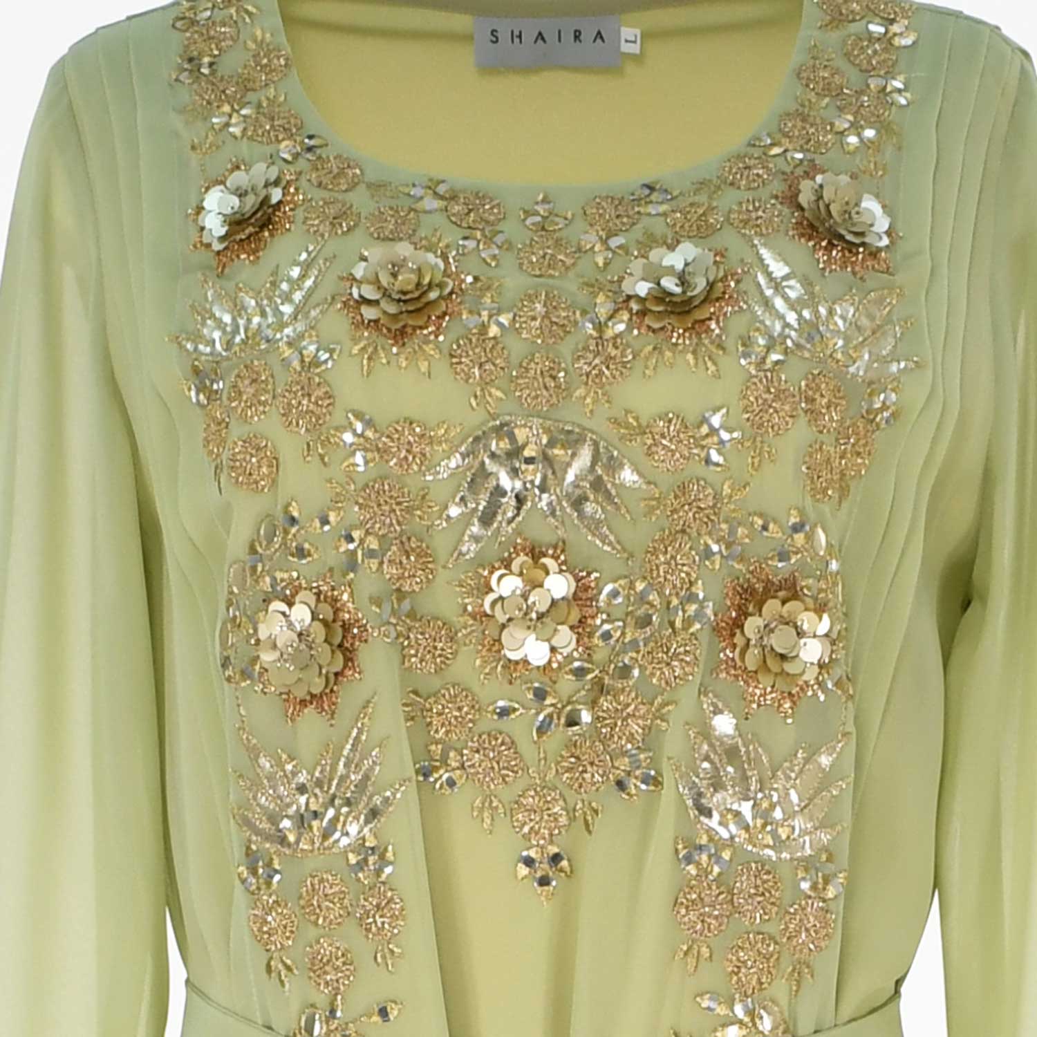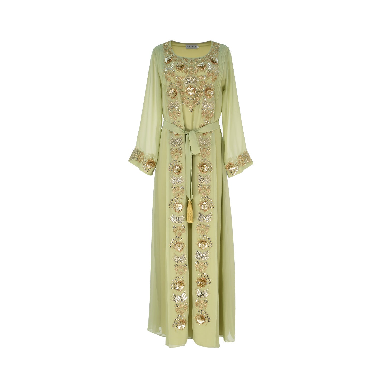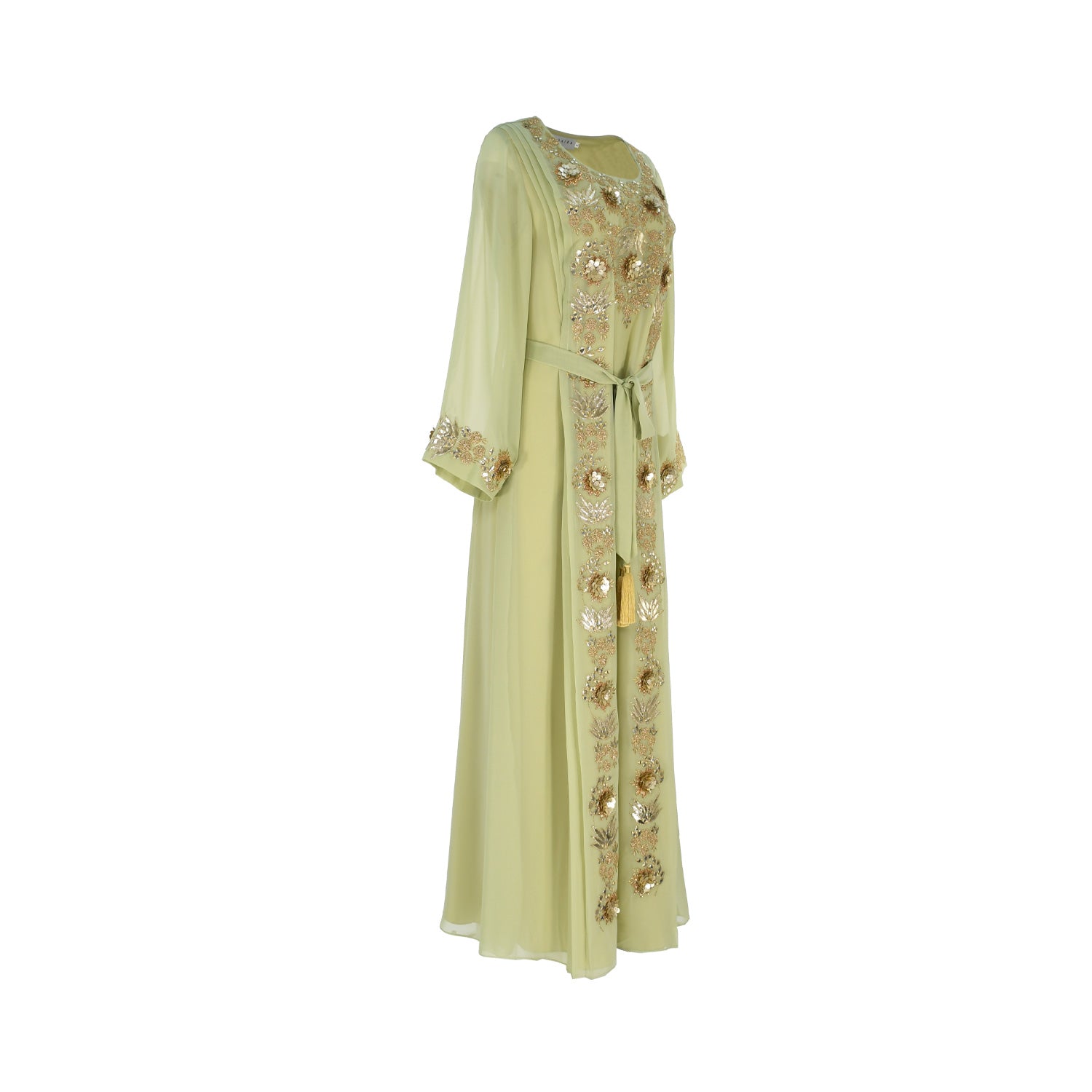 The Shaira Women's Jalabiya is a stunning and elegant piece of clothing that is perfect for any special occasion. This jalabiya features 3D sequins embroidery to the front and sleeves, a round neckline, long sleeves, and a waist tie-up belt with tassel. It is made from chiffon and is full length, with a golden applique adding a touch of glamour. The intricate embroidery and the luxurious fabric make this jalabiya a must-have for any wardrobe. The waist tie-up belt with tassel ensures a perfect fit, while the full length of the jalabiya ensures that you look elegant and stylish. Whether you are attending a special event or just want to look your best, the Shaira Women's Jalabiya is the perfect choice. SPECIFICATIONS: