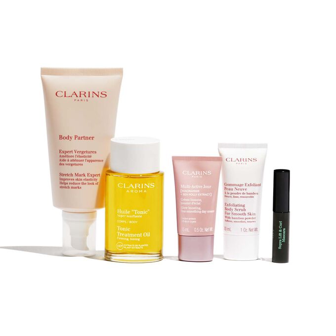 The Clarins Maternity Kit is a specially designed collection to support expecting mothers throughout their pregnancy. It includes a range of products that focus on nourishing, hydrating, and caring for the skin as it undergoes changes. The kit features a Stretch Mark Control cream that helps improve skin elasticity and minimize the appearance of stretch marks, while the Toning Lotion gently firms and tones the skin, leaving it refreshed. The Relaxing Body Cream soothes and alleviates discomfort, providing a sense of relaxation, and the Nourishing Body Oil deeply hydrates the skin, promoting suppleness and a healthy glow. Each product is crafted with gentle, safe ingredients, offering comfort and care during this important time. The Clarins Maternity Kit is ideal for daily use, helping maintain skin health and offering a moment of relaxation.