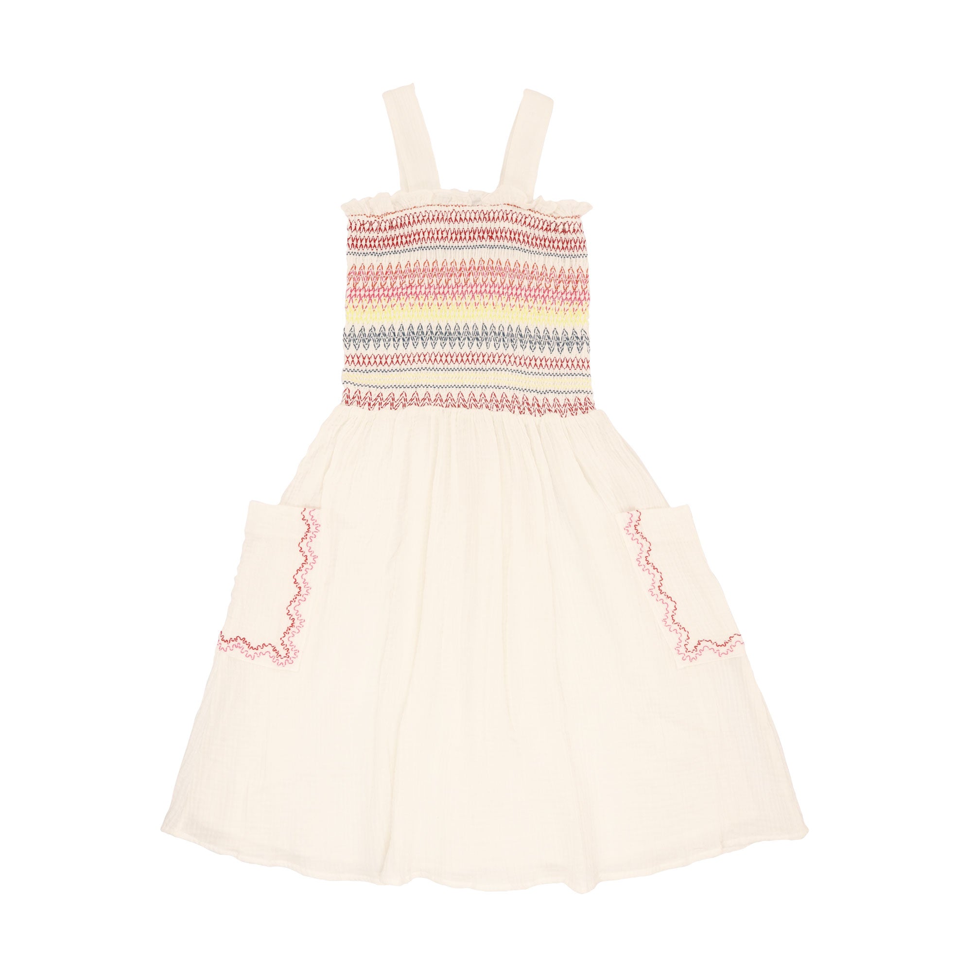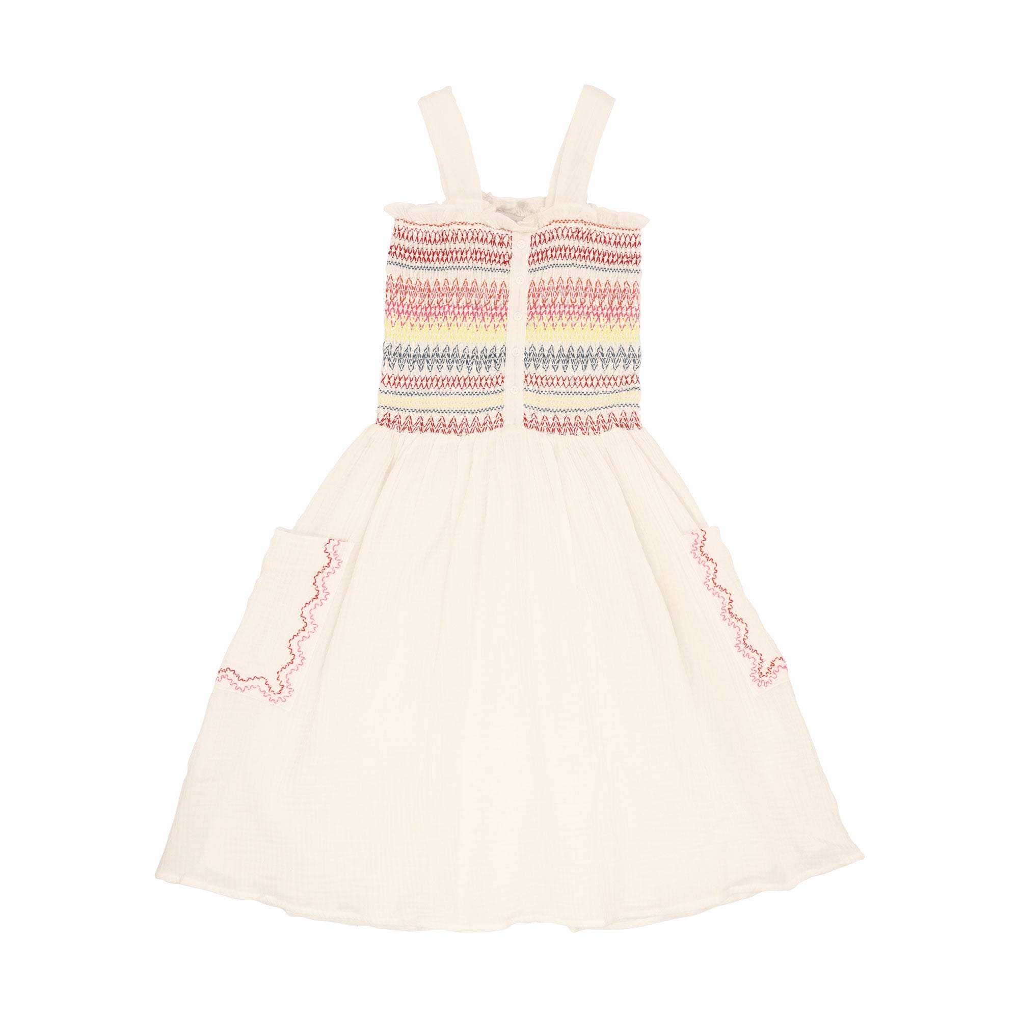 | Woven smock-detail dress by STELLA MCCARTNEY KIDS for children and teenagers. Dress without sleeves, lined, smoked with multicolored embroidery on the top with lining, decorative buttons on the front, and embroidery details on the two pockets. SPECIFICATION :