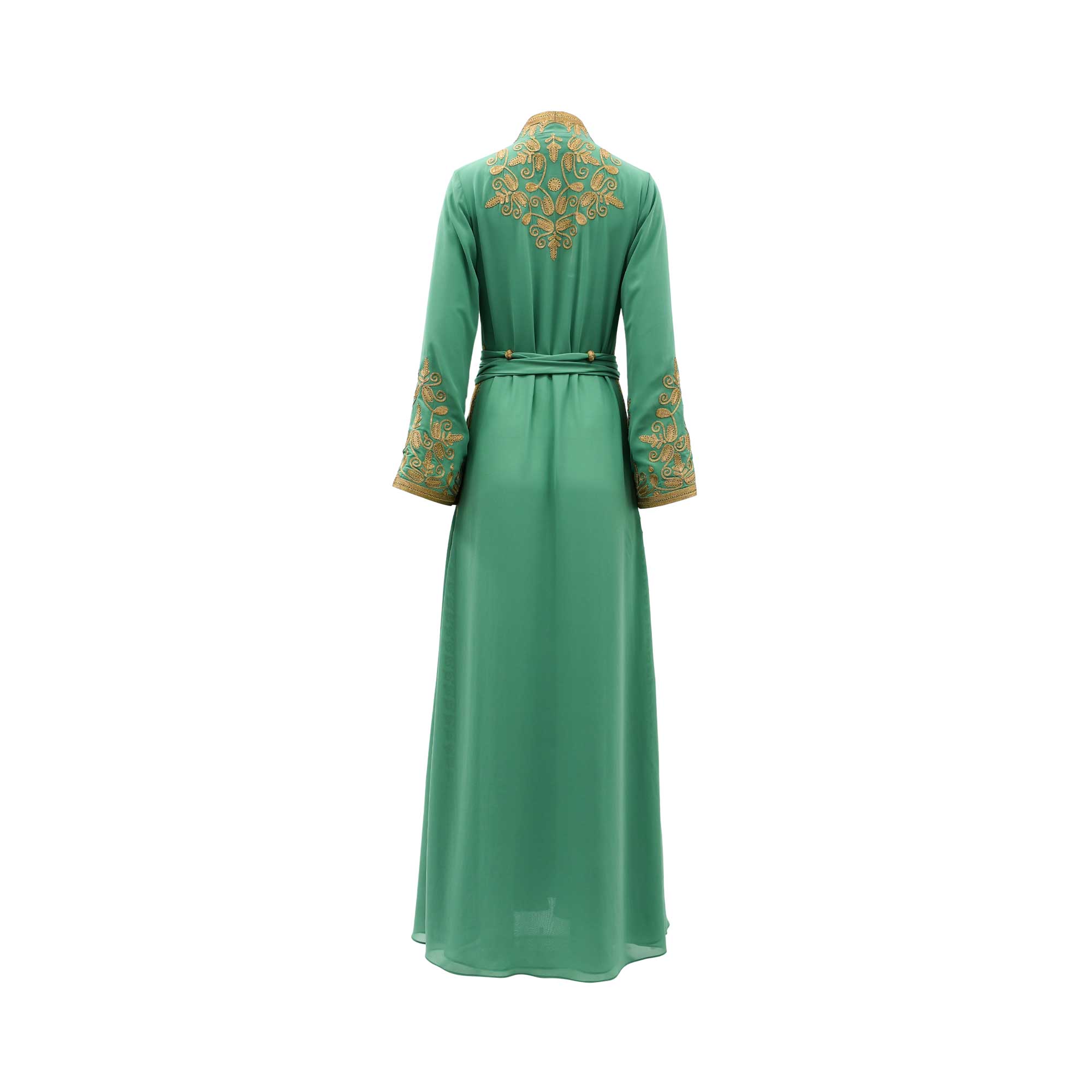 Designed for special occasions, this kaftan includes a coordinating fabric belt with a stunning gold braided centerpiece to cinched the waist and define the figure. With its traditional Moroccan-inspired detailing and modern fit, it’s a timeless choice for galas, weddings, or high-end evening events.