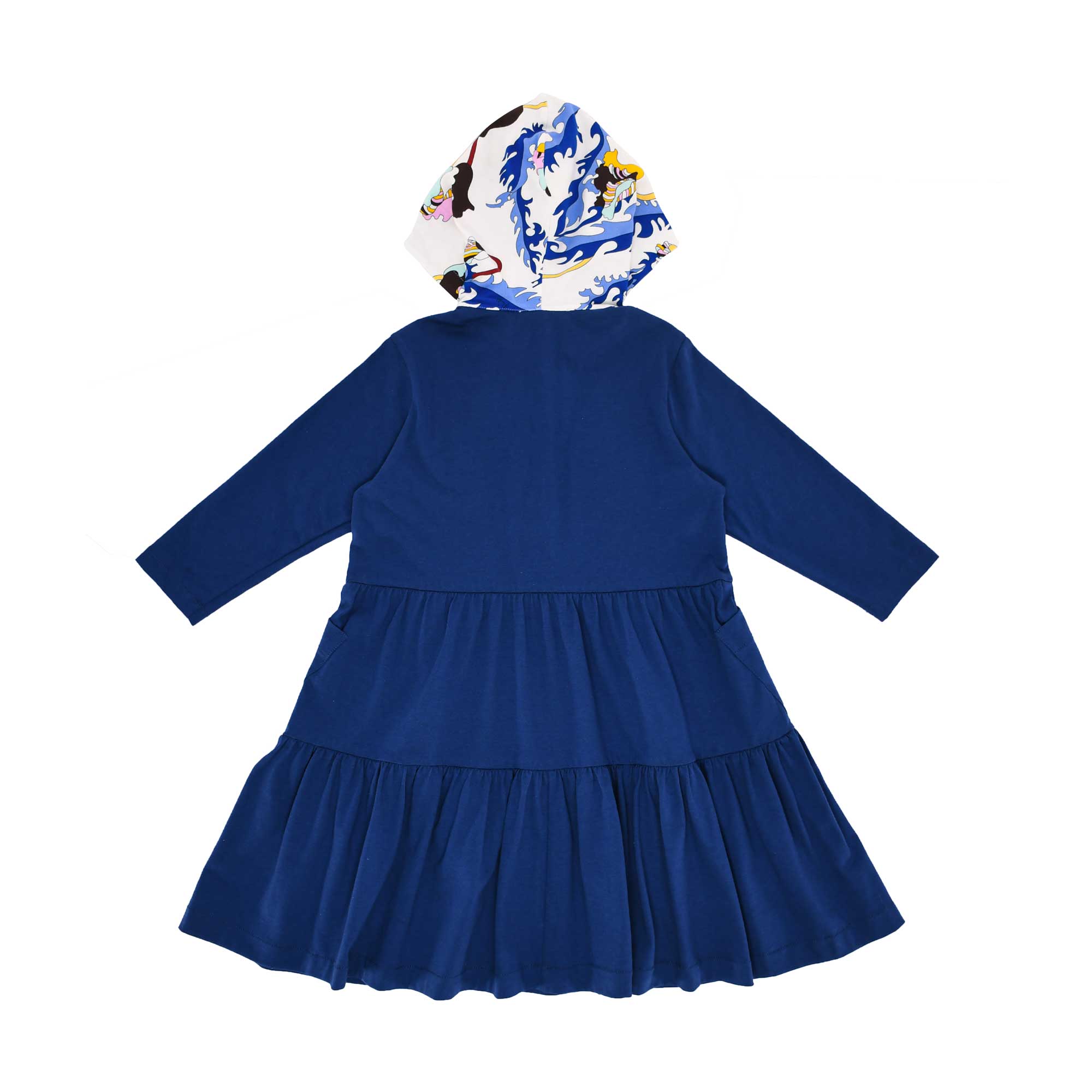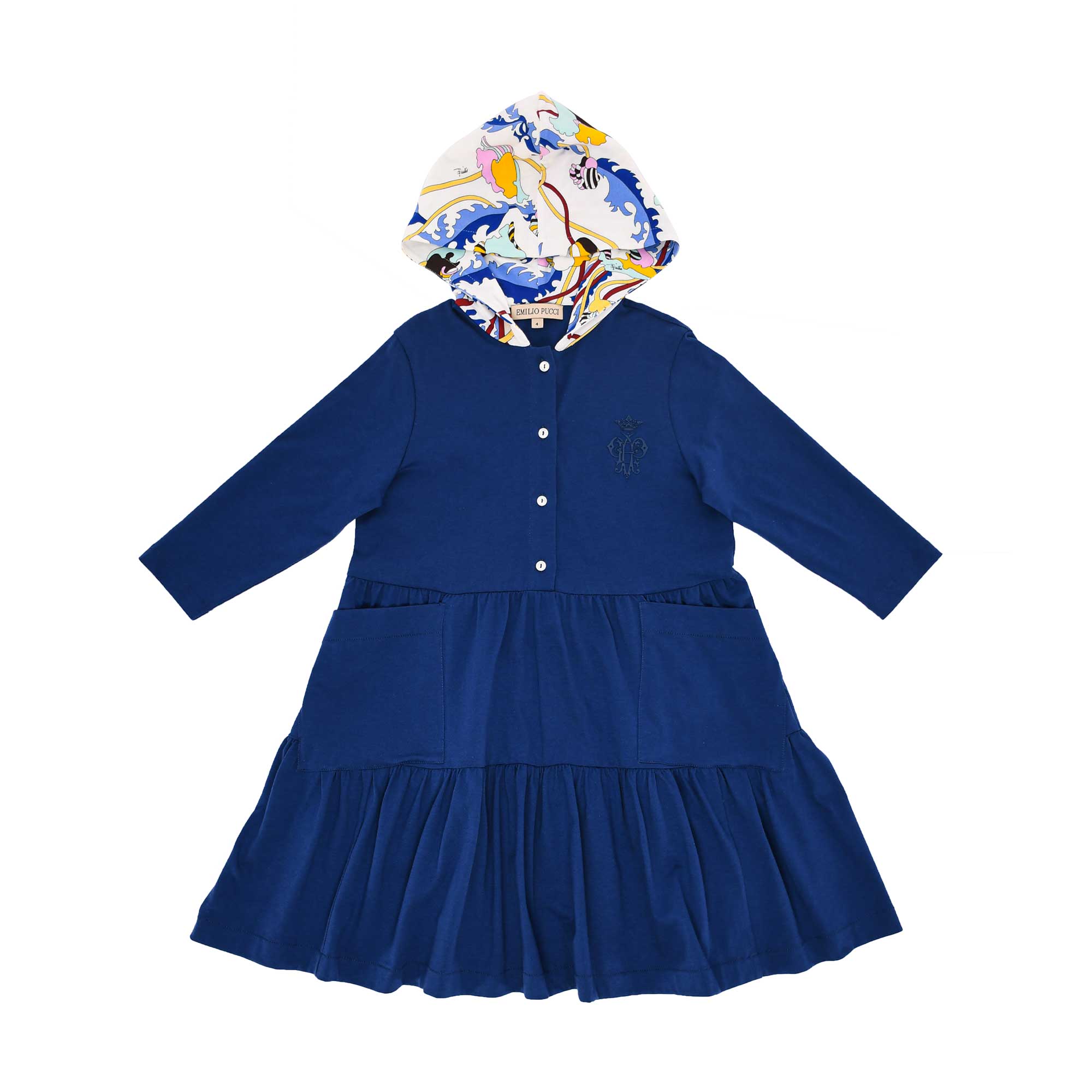 | This girl's blue dress is by the Italian fashion house of Emilio Pucci, and it's absolutely stunning. it's made out of comfy cotton jersey. The skirt has printed hood in bright blue , pink and yellow tones in the graphic print pattern , It has beautifully embelished with front logo and flared hem with long sleeves . It has front two pockets and fasten with front button . SPECIFICATION :