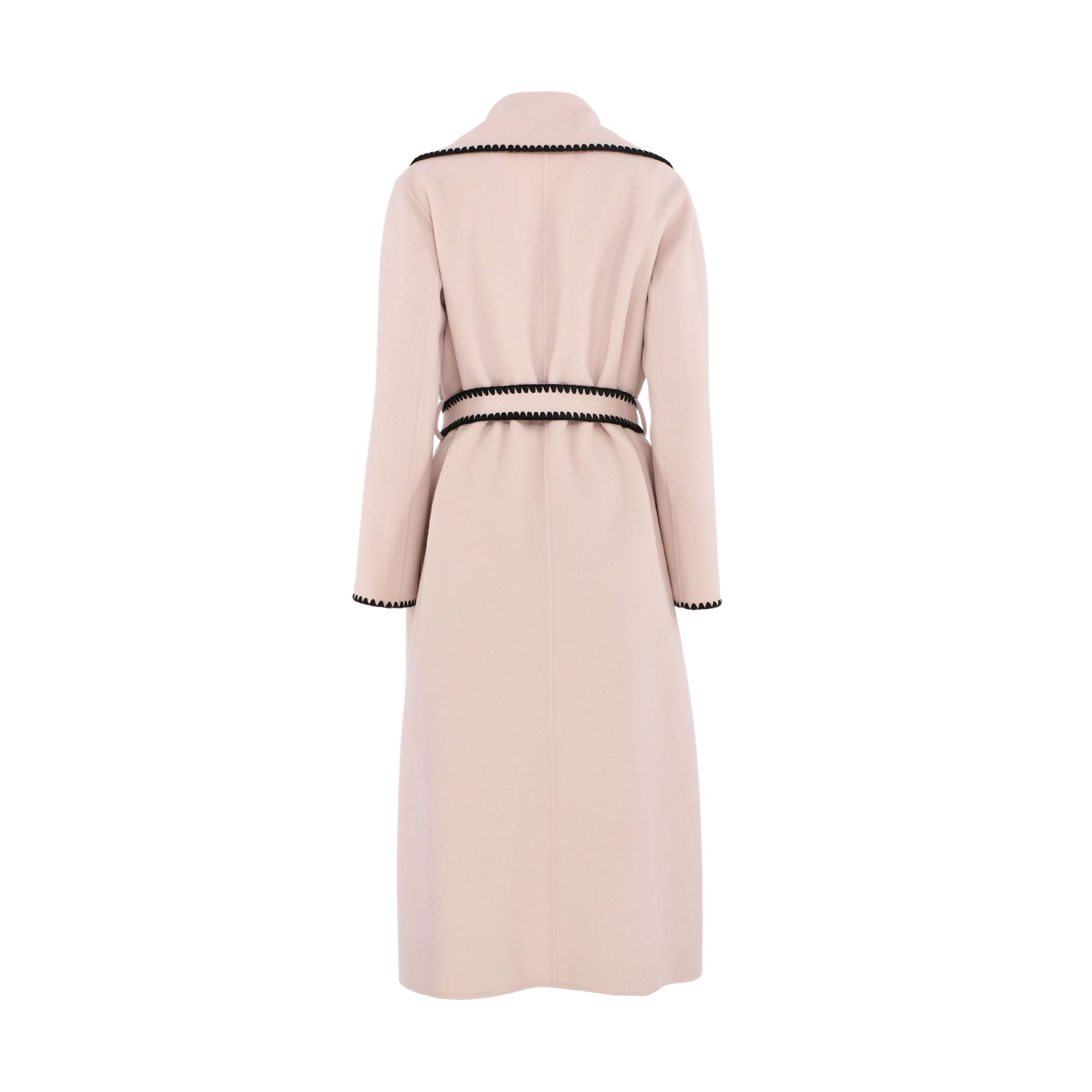 | Simona Corsellini's adorable Double wool cloth dressing gown coat in white . This full-sleeved style has lapel collar, belt at the waist, patch pockets, deep side slits and contrasting crochet stitch trim which gives a stylish look. It is the perfect combination of style and comfort for any girl who wants to express her own sense of fashion. SPECIFICATIONS :