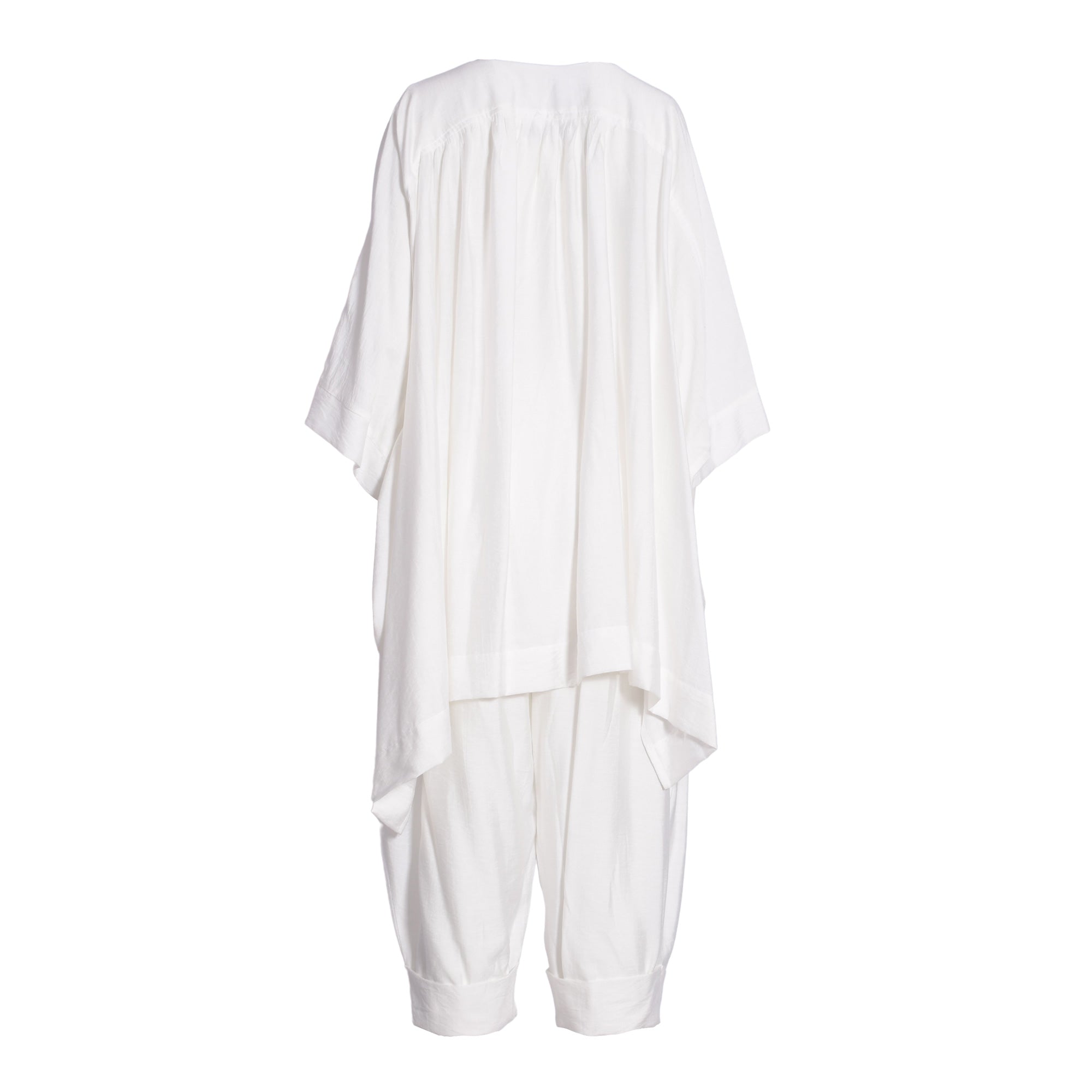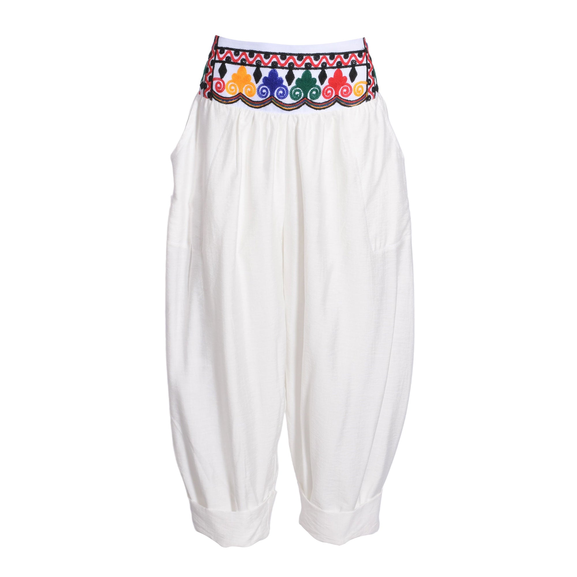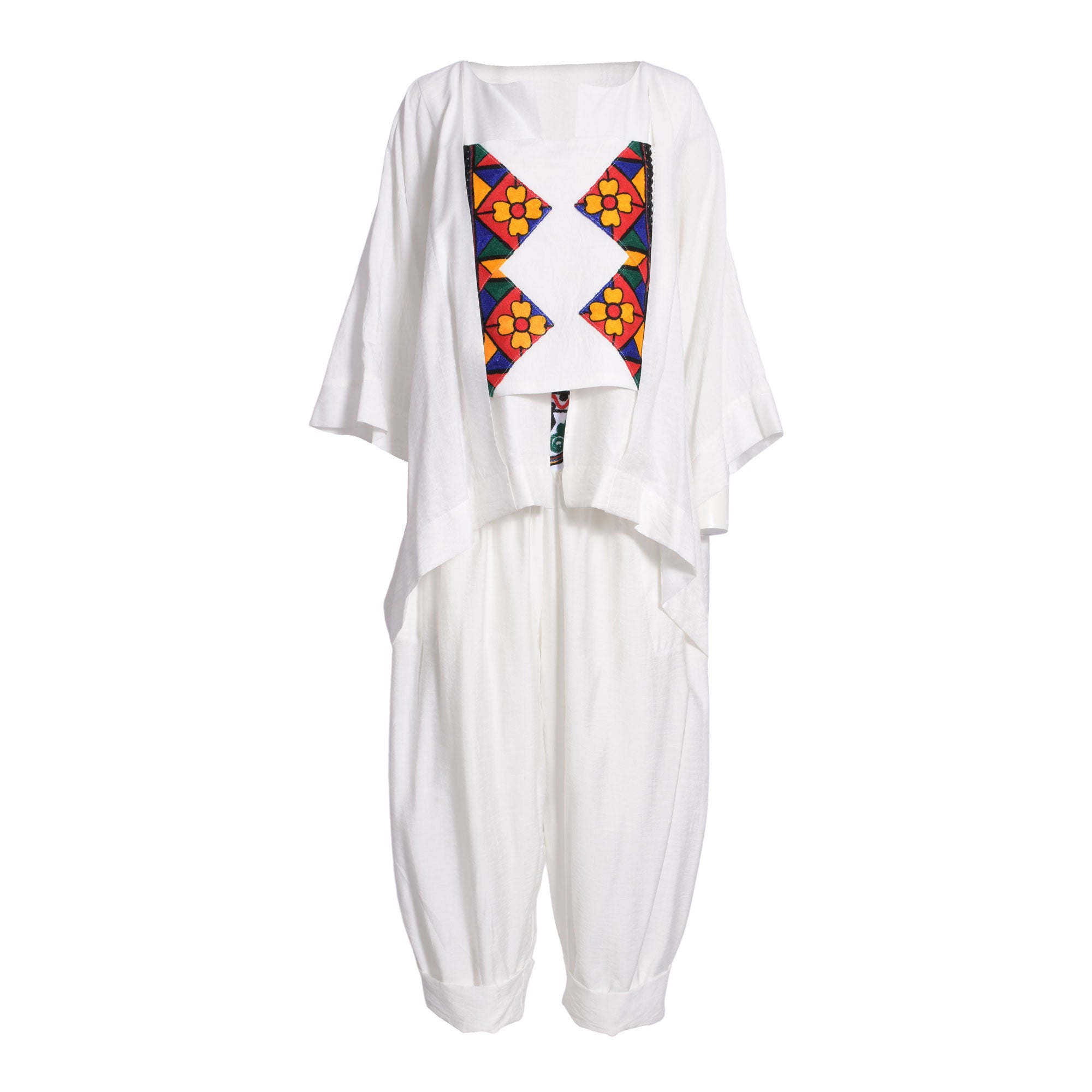 The Fahm Women's White Printed Set of Blouse & Pant set is a stylish and comfortable addition to any wardrobe. The multicolor graphic print patch to the blouse and floral multicolor embroidery on the waist of the pant adds an eye-catching touch to the otherwise classic design. The kaftan style blouse looks great with the harem pants, which feature turn up ankle and elasticated waist with two side pockets. This set is ideal for a casual day out or dressing up for a special occasion. The lightweight material is breathable and perfect for the hot summer days. With its versatile design, the Fahm Women's White Printed Set of Blouse & Pant set is sure to become a wardrobe staple. SPECIFICATIONS: