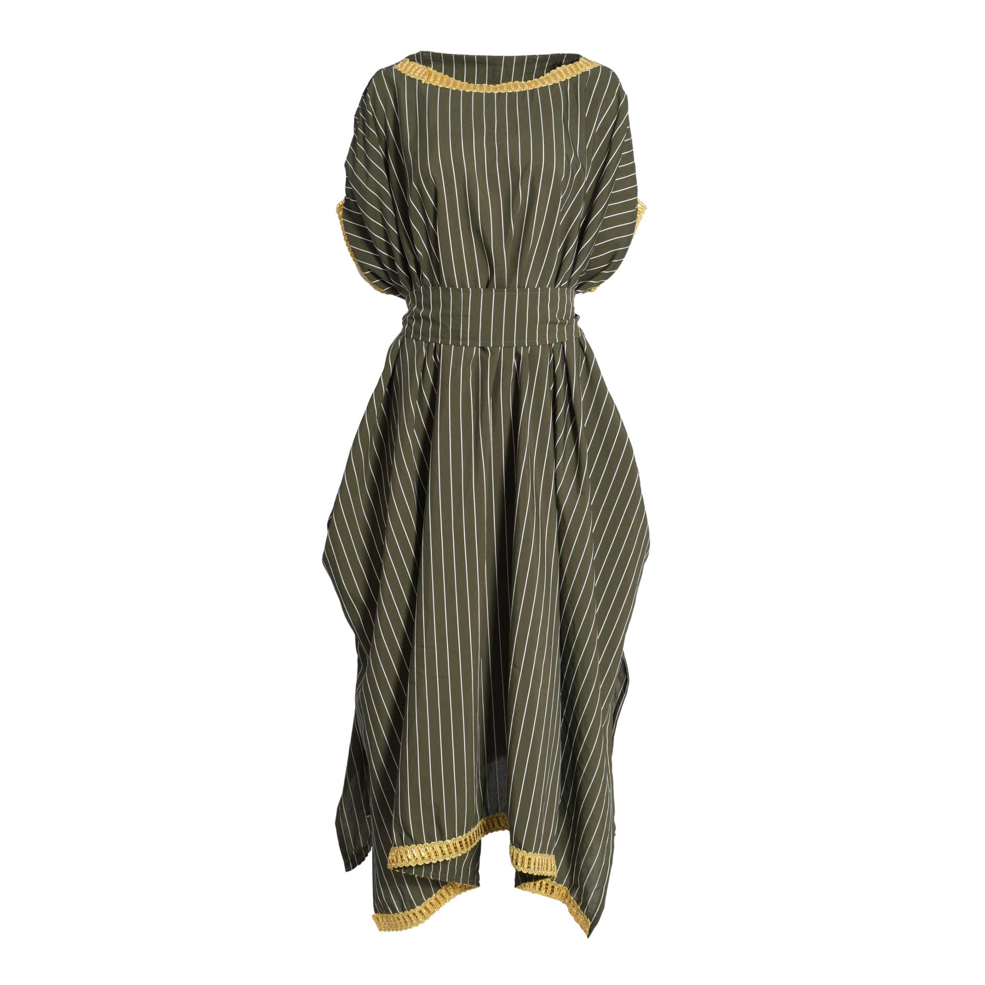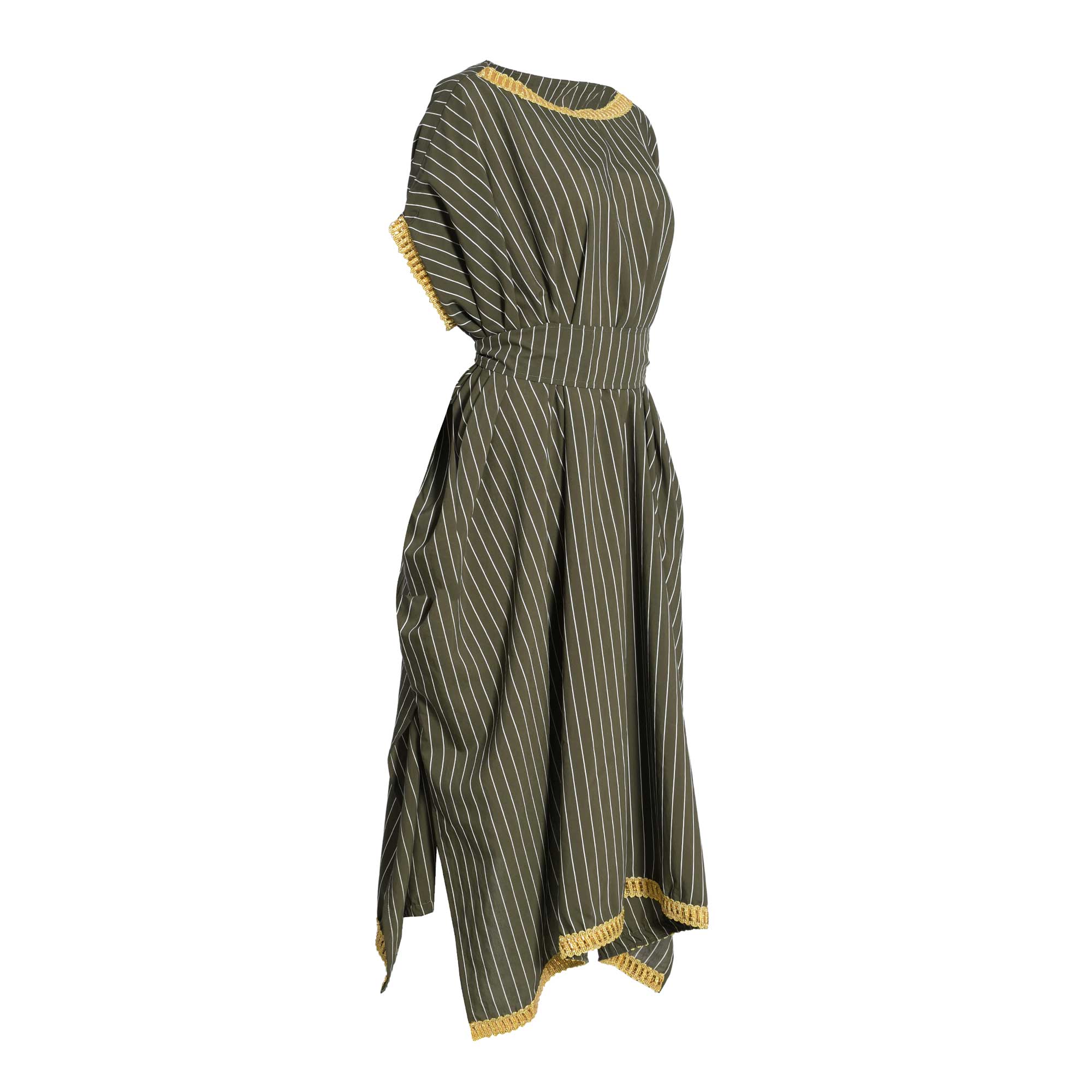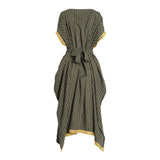 This Fahm Women's Dark Green Dress is ideal for a casual day or evening out. It features a free size, loose sleeves, round neck with contrast vertical lines all over. The dress is trim with with golden lace and side slits on both sides. It comes with matching belt to complete the look. The dress is made of fine fabric that is comfortable and provides a great fit. It is sure to give you a stylish and elegant look. This dress is perfect for any occasion and will definitely make a statement. Whether you pair it with flats or heels, you will be sure to stand out from the crowd.