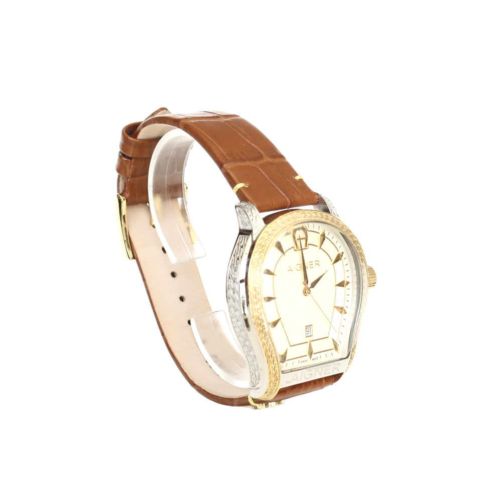Aigner Mens Watch Bergamo Silver Gold Plated Case & Dial with Light Brown Leather Strap