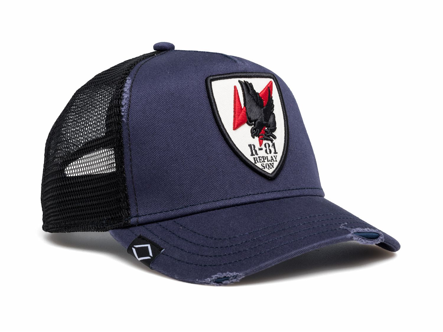 Cap with bill in nylon twill with back in contrasting-coloured mesh and inner lining in cotton blend fabric. The garment is characterized by the customized patch with eagle at the front. The cap is enhanced by the adjustable band at the back and the micro abrasions with used effect on the edges.