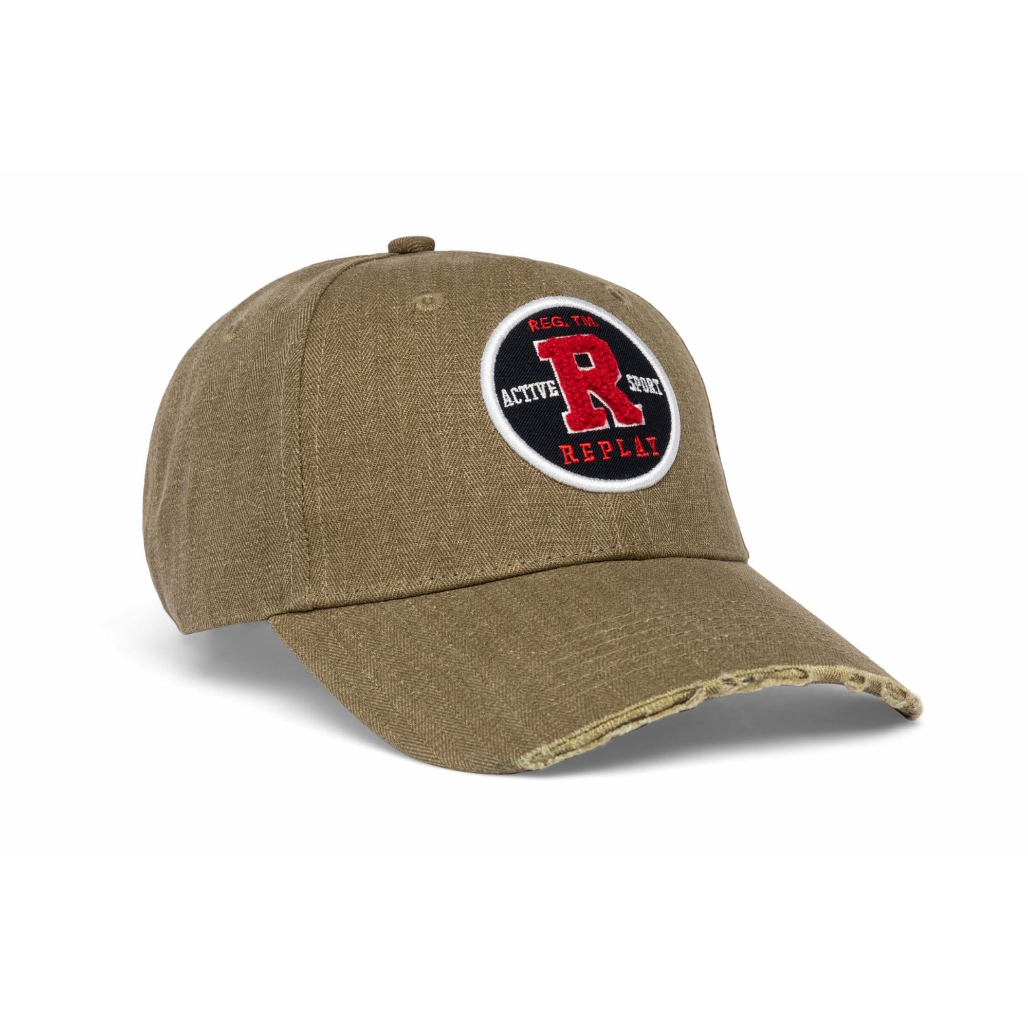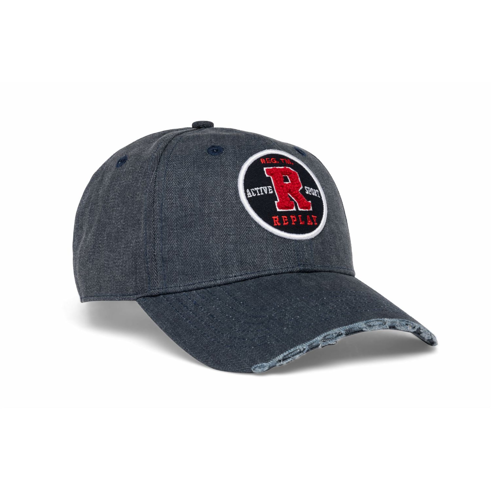 Cap with bill made of cotton with herringbone pattern and inner lining in cotton blend fabric. With customized patch embroidered at the front, the garment is refined by the micro abrasions with distressed look along the edges and at the front.