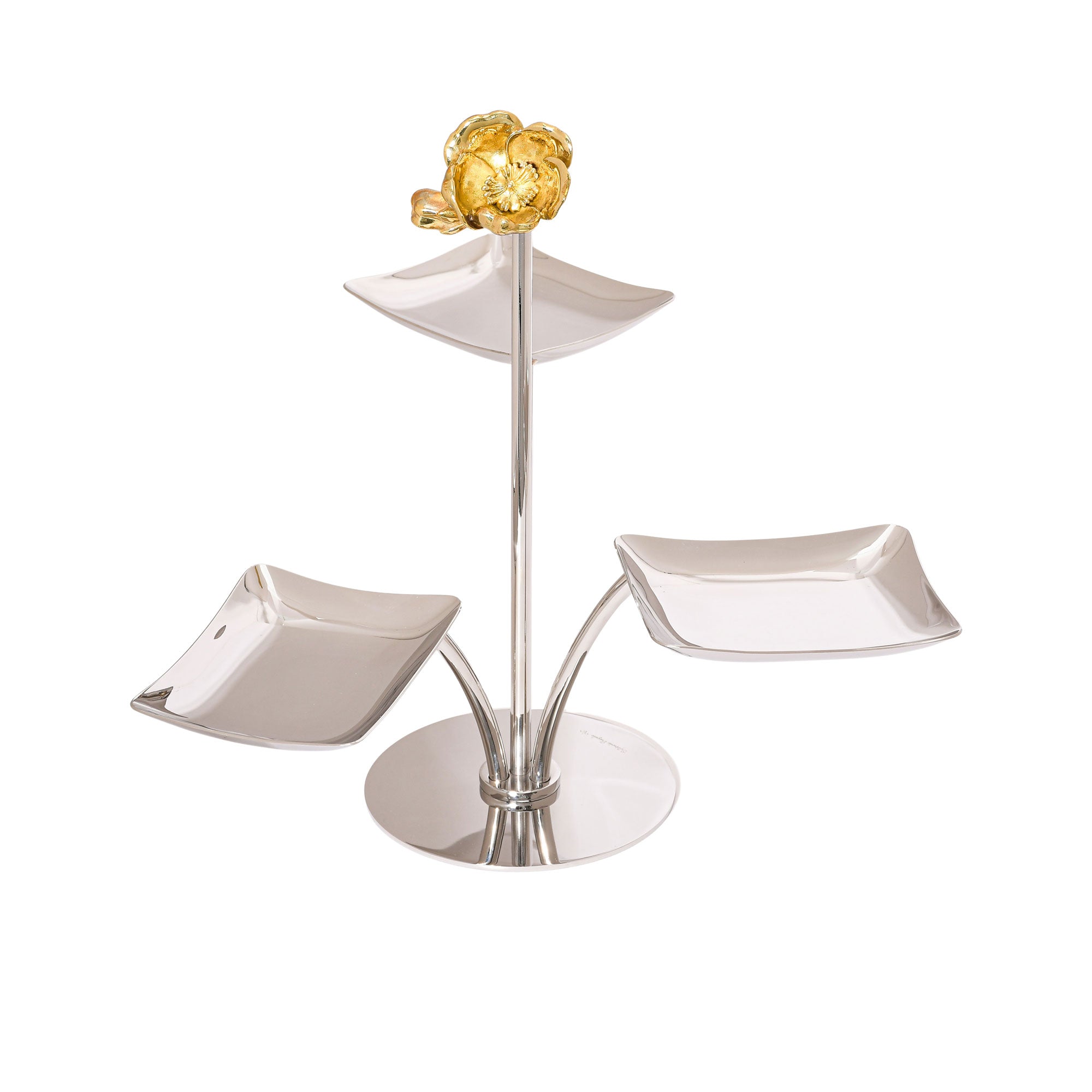 This elegant dip dish features a unique floral design with three interconnected square bowls. A delicate gold flower sits atop the central stem, adding a touch of luxury. The bowls are held in place by curved, metallic branches that rise from a circular base. The dish's polished silver finish complements the gold flower beautifully. It's perfect for serving a variety of dips, sauces, or small snacks at parties or gatherings. The dish's creative design makes it a conversation starter and a stylish addition to any table setting.