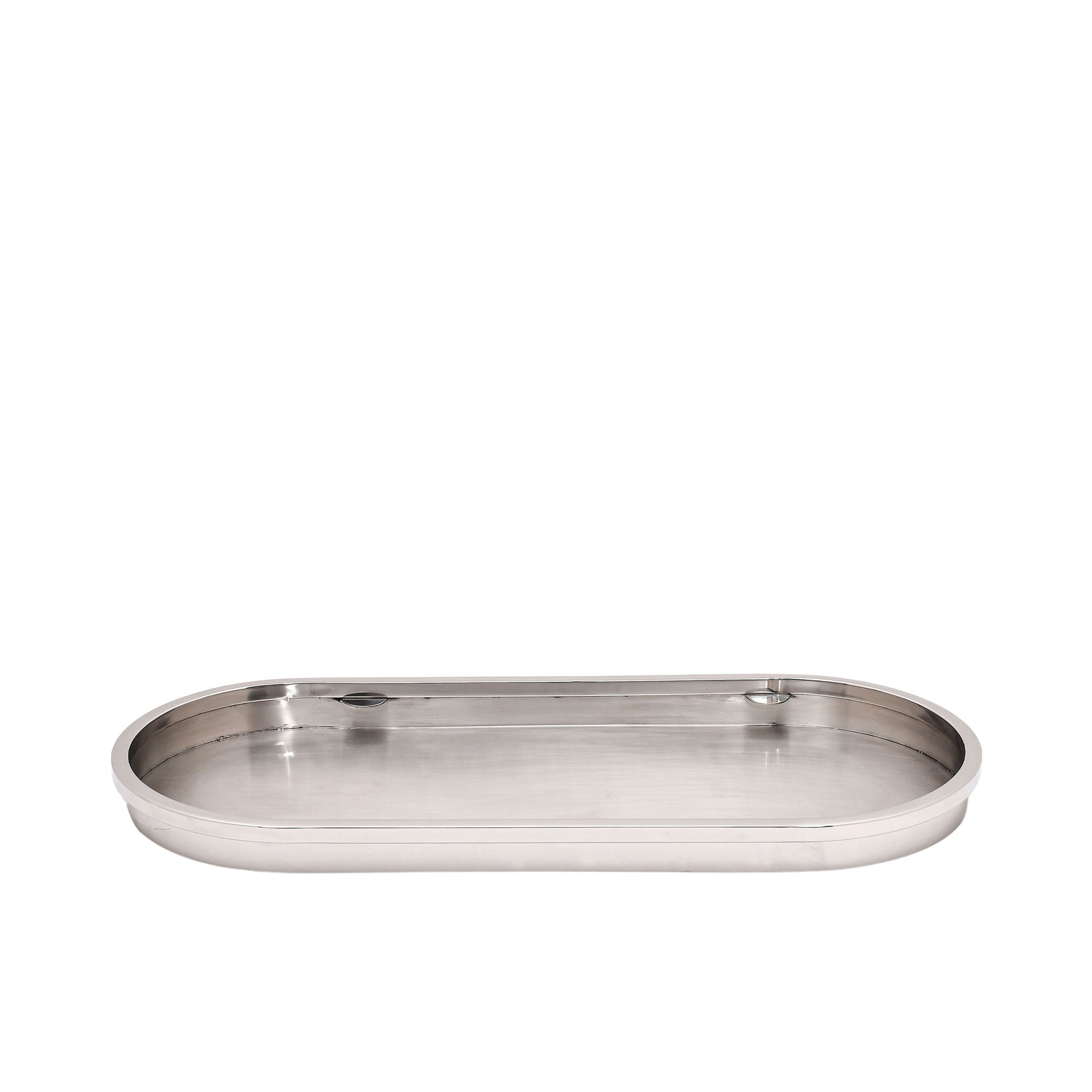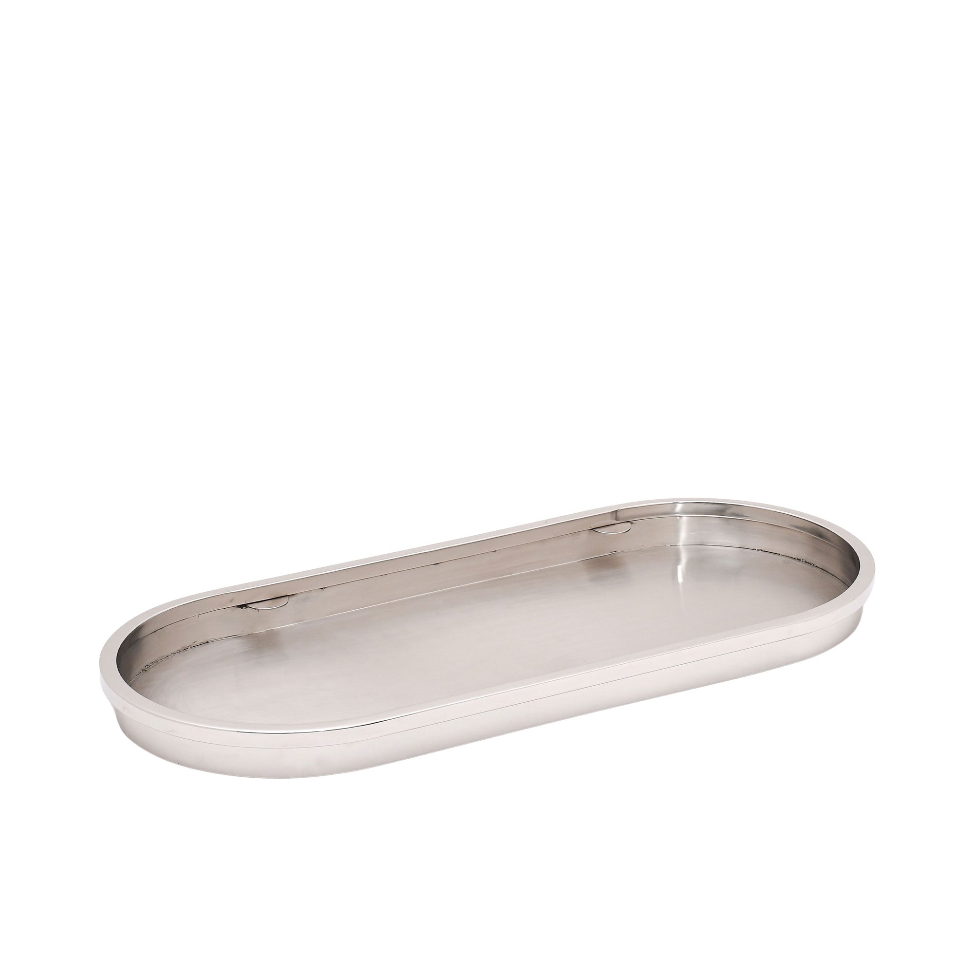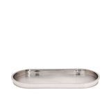 This sleek, oval tray is crafted from a polished metal, likely stainless steel or silver-plated. Its minimalist design features clean lines and a smooth, reflective surface. The tray's raised edges create a defined border, adding a touch of sophistication. Perfect for serving snacks, drinks, or organizing small items, this versatile piece complements modern and contemporary home decor styles.