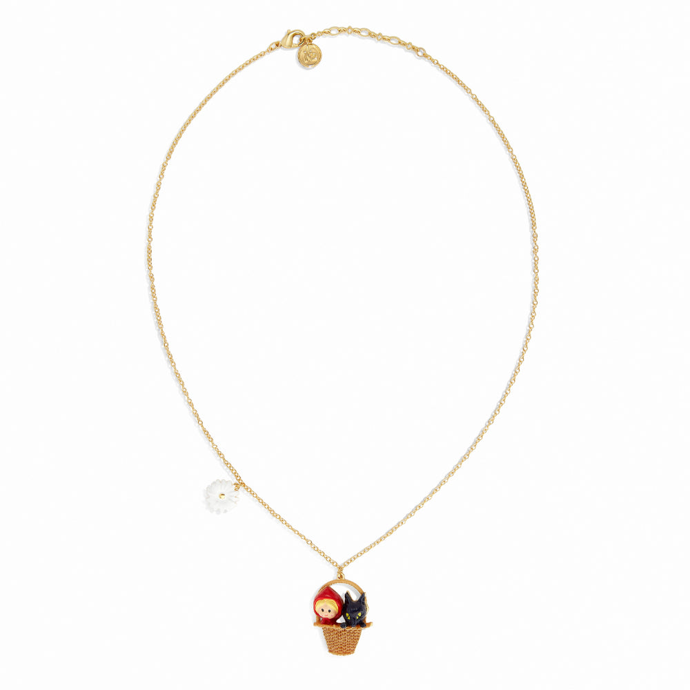 | Les Nereides Basket Little Red Riding Hood And Big Bad Wolf Pendant Necklace, Les Nereides' new twist on the traditional narrative of Little Red Riding Hood allows you to relive the beautiful tale of Little Red Riding Hood. The Basket, Little Red Riding Hood, And Big Bad Wolf Pendant Necklace has playful lines and detailed embellishments, such as daisies in miniature baskets. This one-of-a-kind item is part of the A Walk in the Woods series and is made of 18k gold plated and hand enamelled brass. With a length of 50cm and a 5cm extension, this necklace is suitable for any occasion. Its 3.1cm width and 1cm depth make it a subtle accent to any outfit. This pendant necklace is lightweight and robust, weighing only 10g. Les Nereides jewellery will add a whimsical twist to your jewellery collection. SPECIFICATIONS