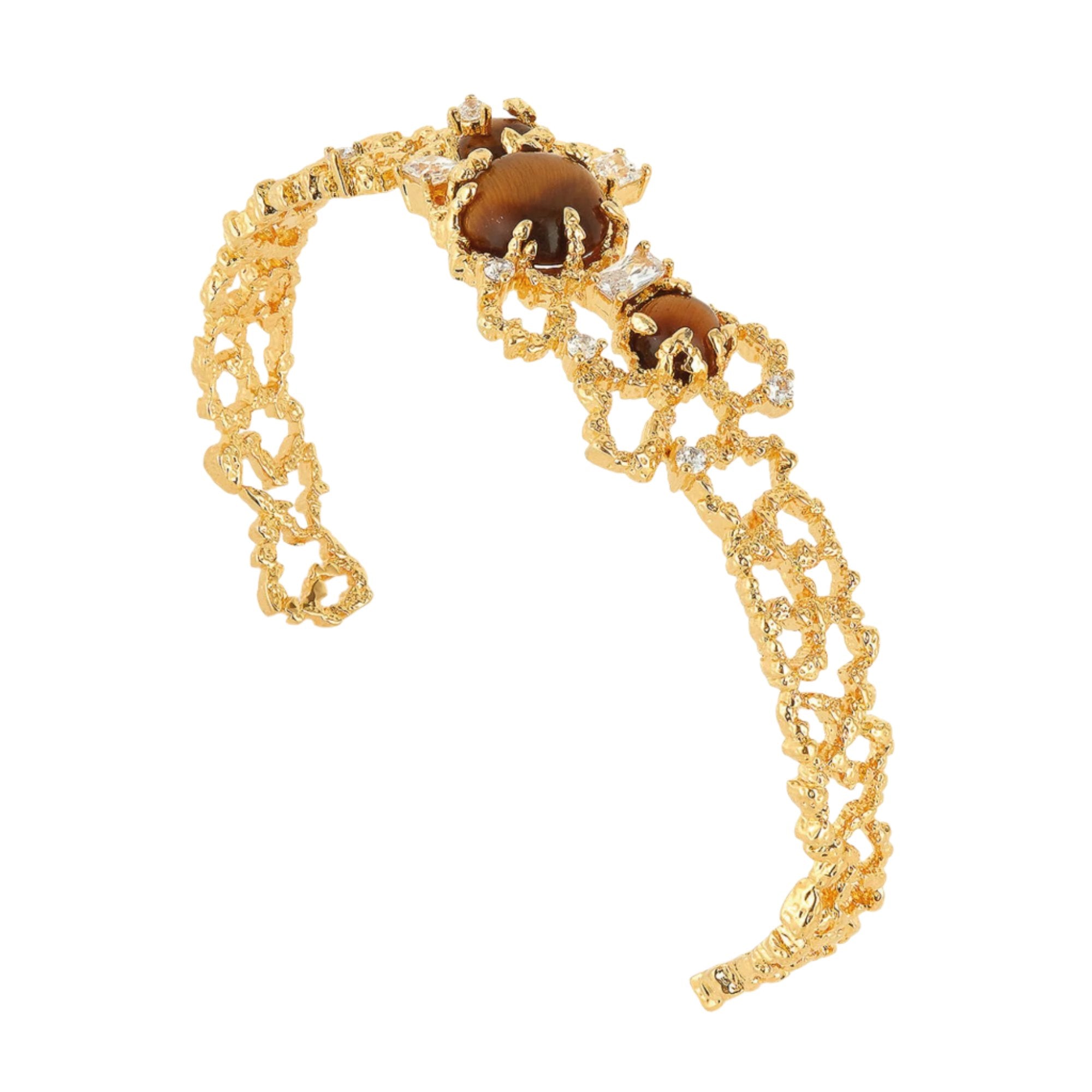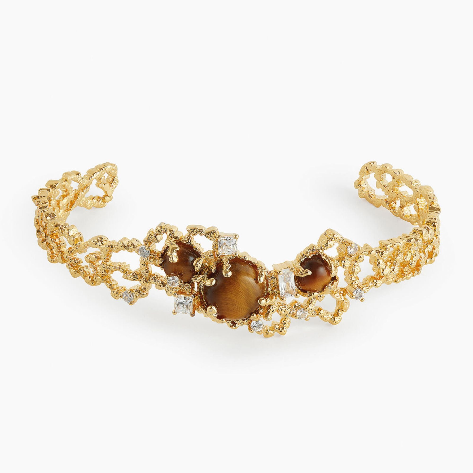 The Mineral Treasure collection includes this gold bangle bracelet with a rock wall design woven into it like a rope. This high-end costume jewellery bracelet features three tiger eye stones for an elegant finish, making it the perfect accessory for a low-key look. Crafted from gilded brass braided with jasper and cubic zirconia.