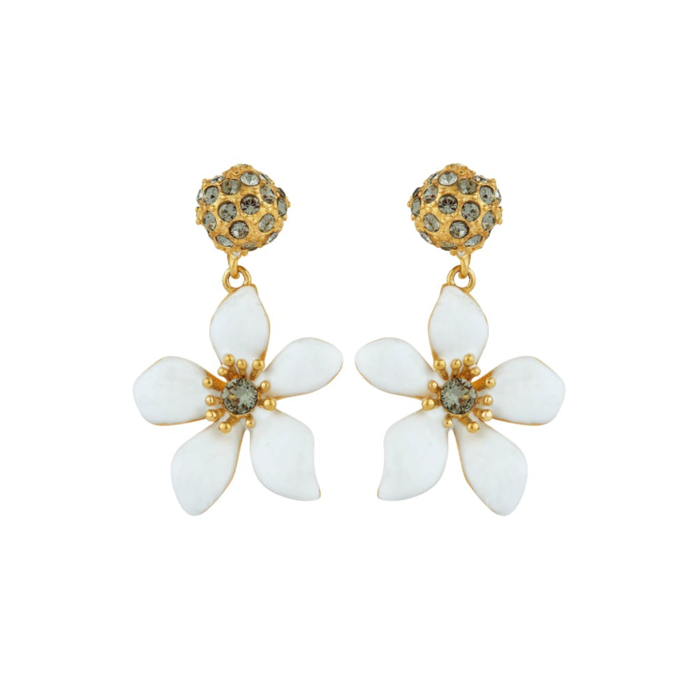 The inspiration for the new Night Flowers collection came from a vision of timeless French grace. These post earrings by Les Nereides feature a beautiful white ranunculus flower, a sphere covered in faceted crystals, and a heart-shaped crystal with diamond-cut facets. Give in to the temptation of this collection of costume jewellery that is sure to turn heads and will look great with a simple black dress this holiday season. Hand-gilded and enameled stud earrings with a faceted crystal-paved spherical.
