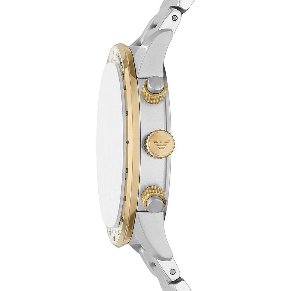 Elevate your style with this sleek and sophisticated Emporio Armani Mario Chrono AR11454 men's watch. The watch features a 43 mm silver case with a green dial and rose gold geometric indexes, providing a stylish contrast. The watch also includes a stainless steel strap with pin links and a deployment clasp for a secure and comfortable fit. With a 3 atm water resistance and quartz movement, this watch is both practical and stylish.