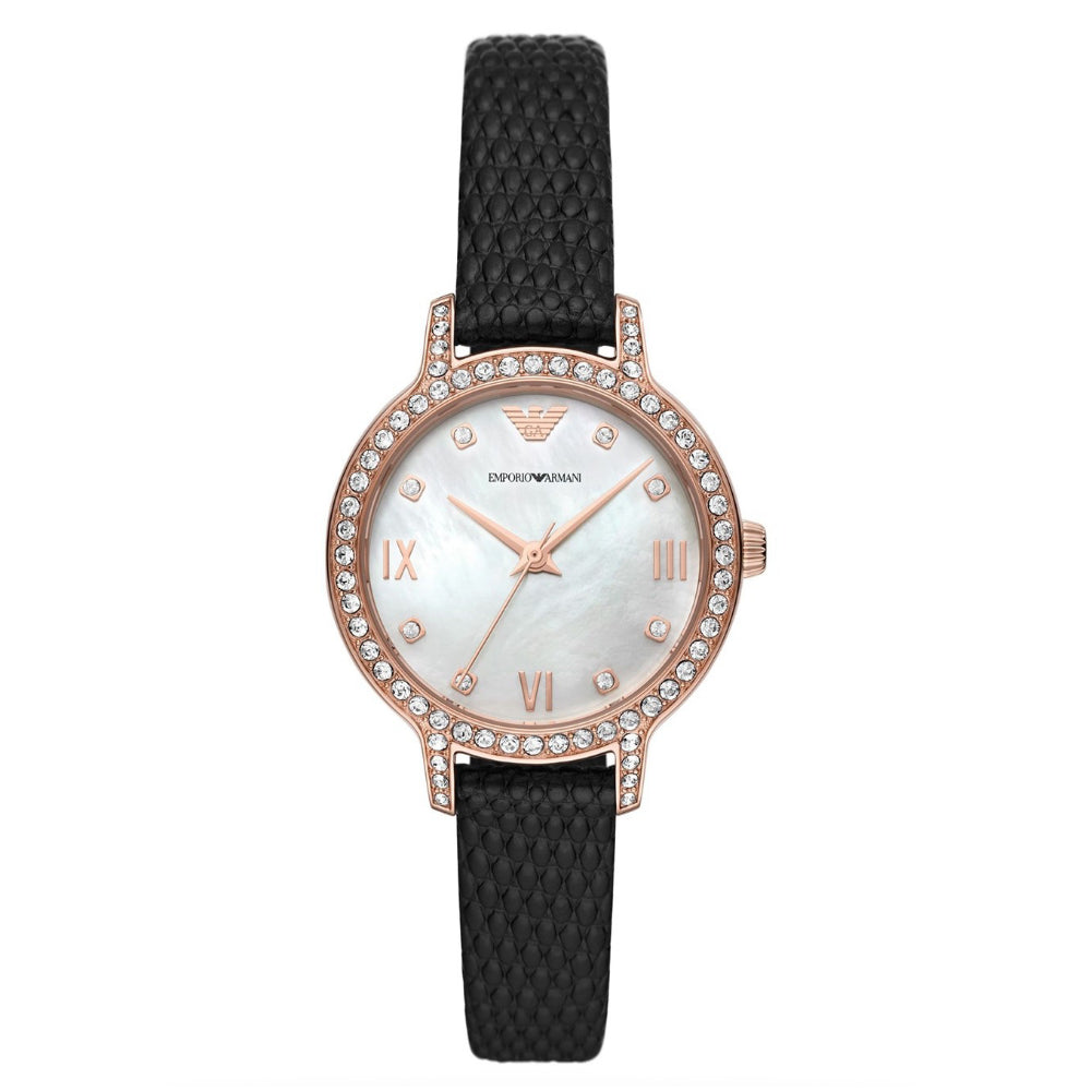 Emporio Armani Cleo Rose Gold Case Black Leather Strap Women's Watch