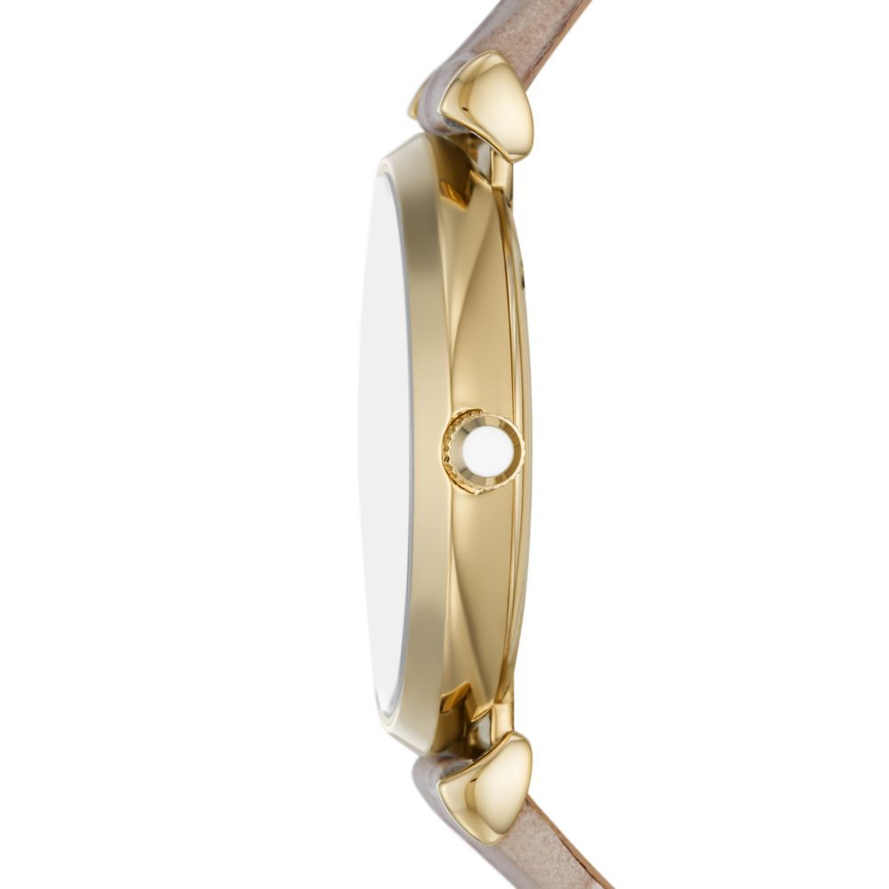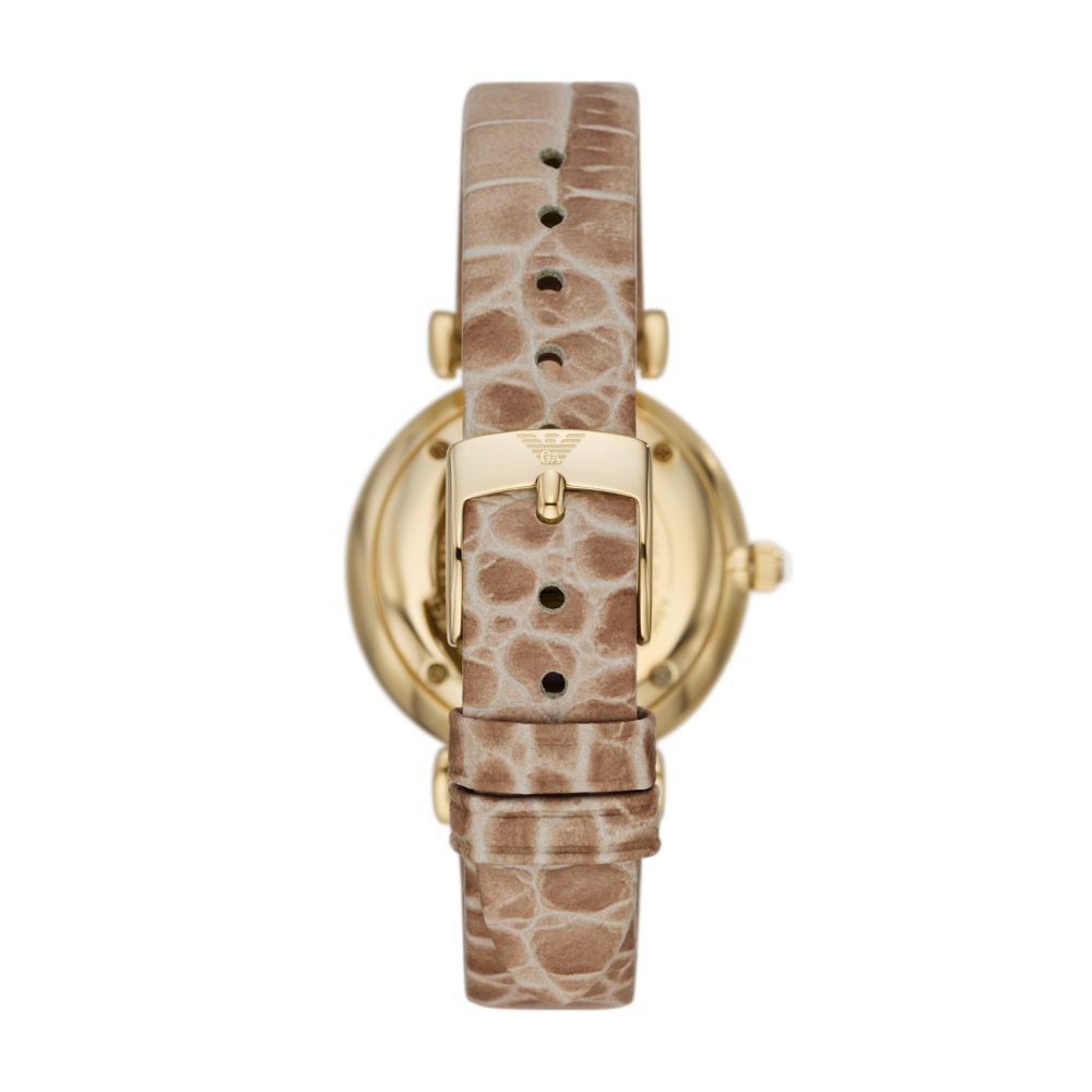 Emporio Armani's 32mm watch features a silver glossy sunray dial, two-hand movement, pale gold-tone at least 50% recycled stainless steel case and taupe leather strap.