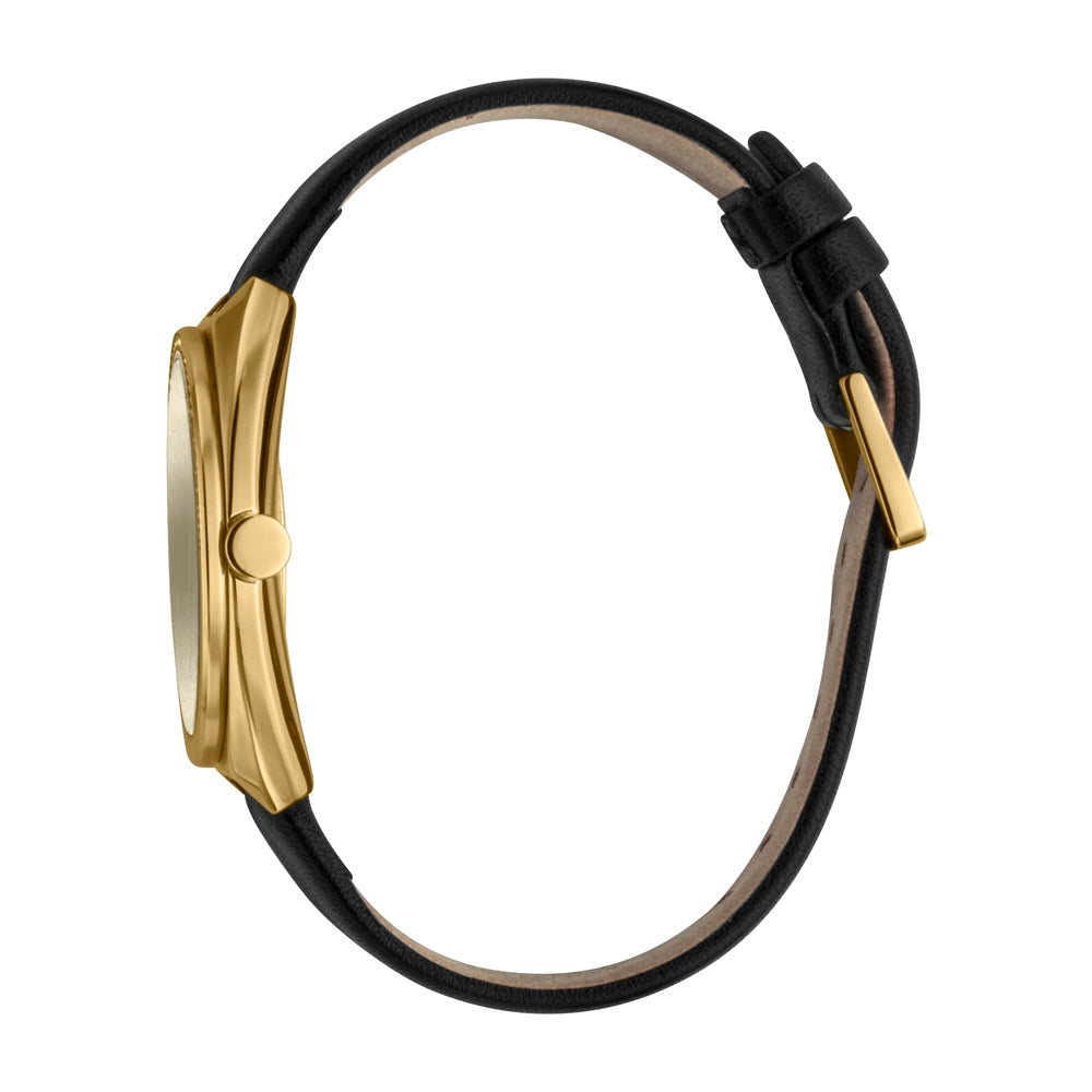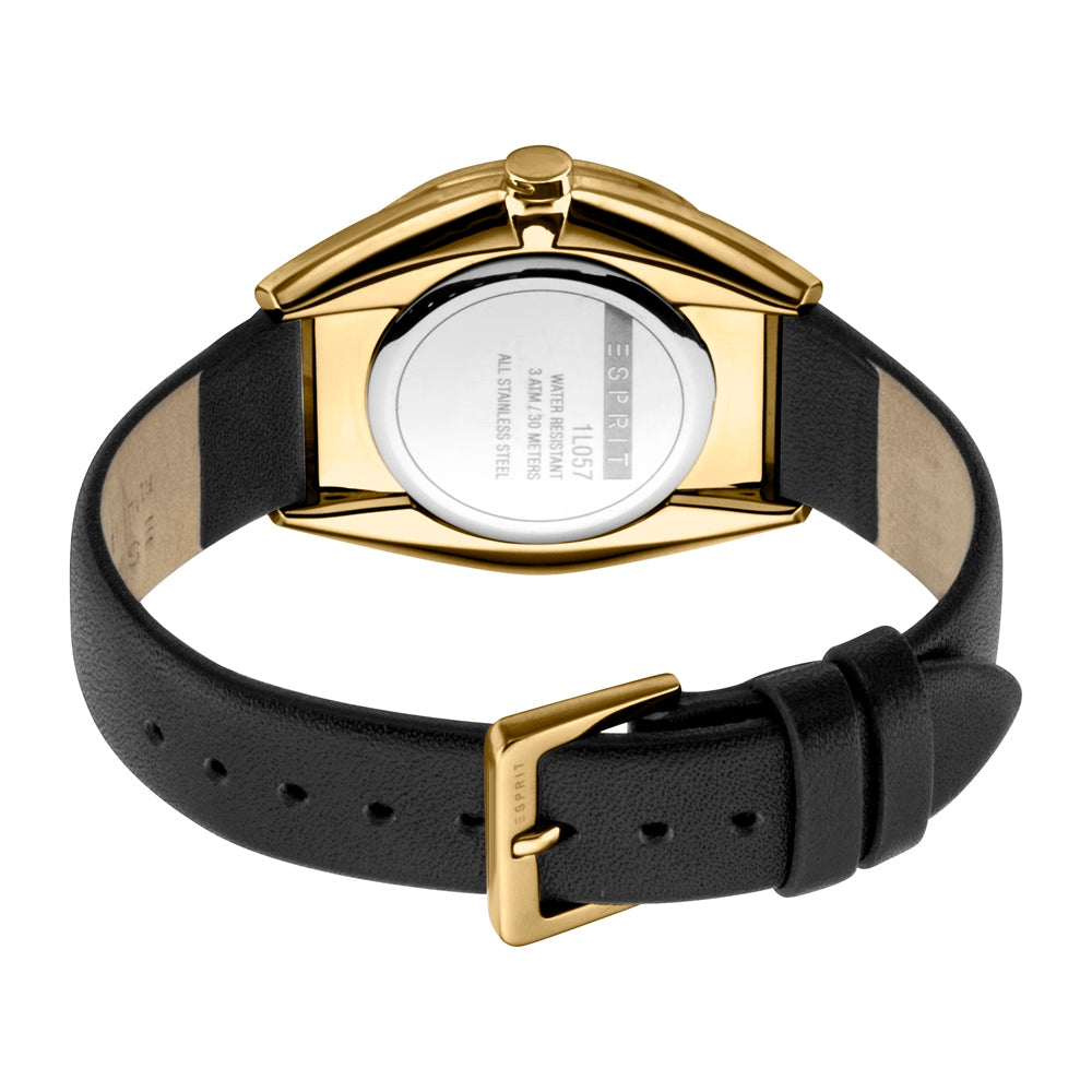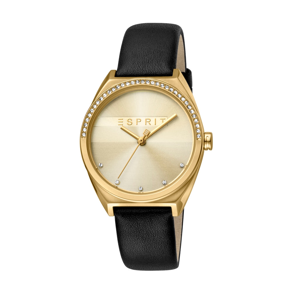 Esprit Ladies IP Gold Stainless Steel Watch Stones on Bezel Golden Dial & Black Strap