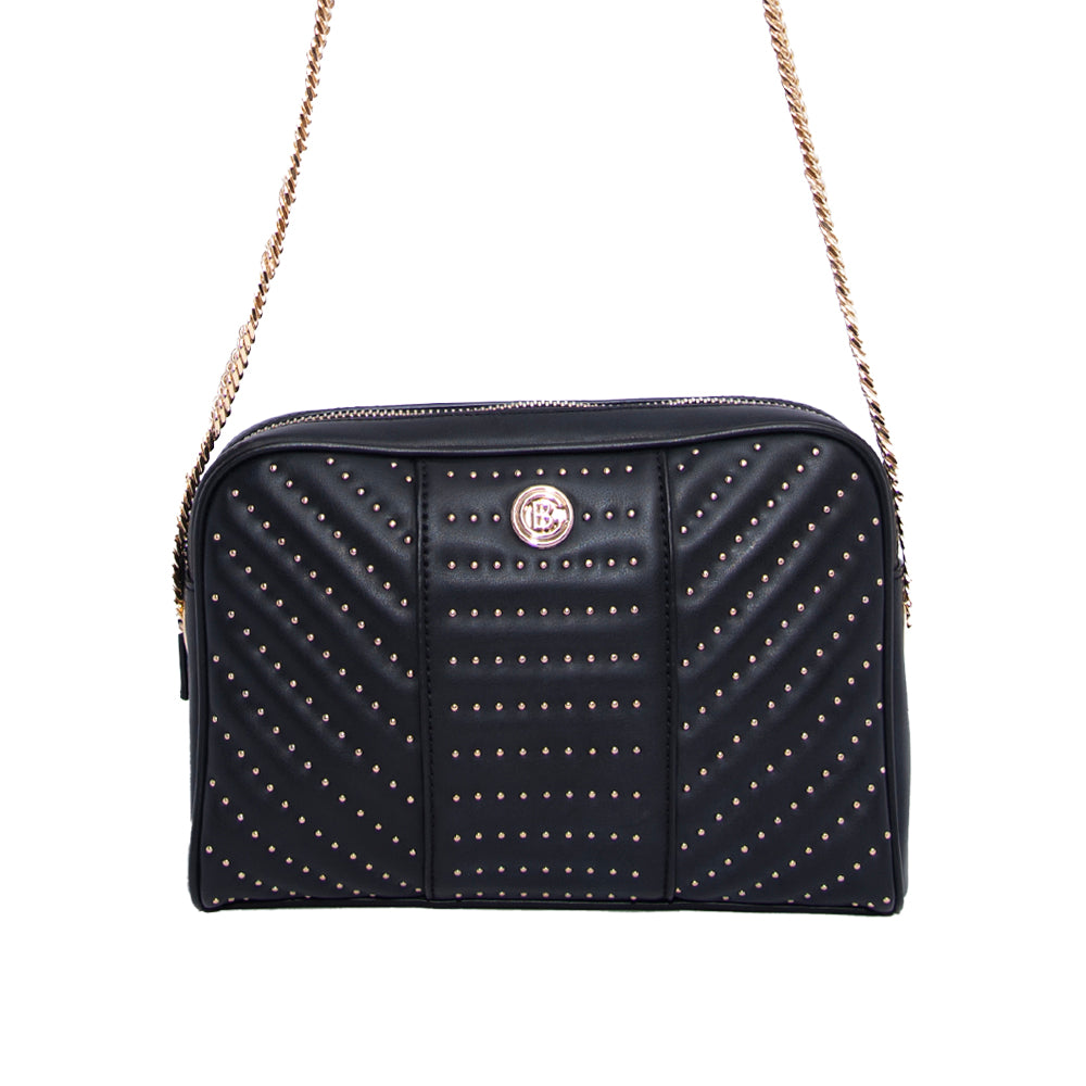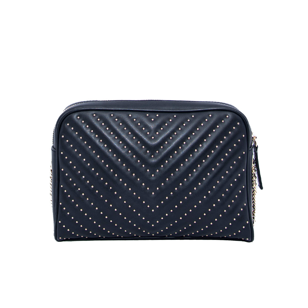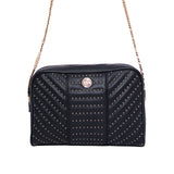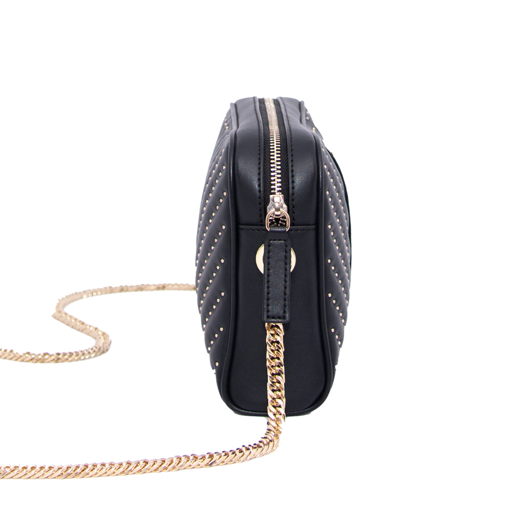 This crossbody shoulder bag with full golden chain is convertible as clutch that goes in your day and night outfit.The verical pattern with the small studs makes it more stylish .