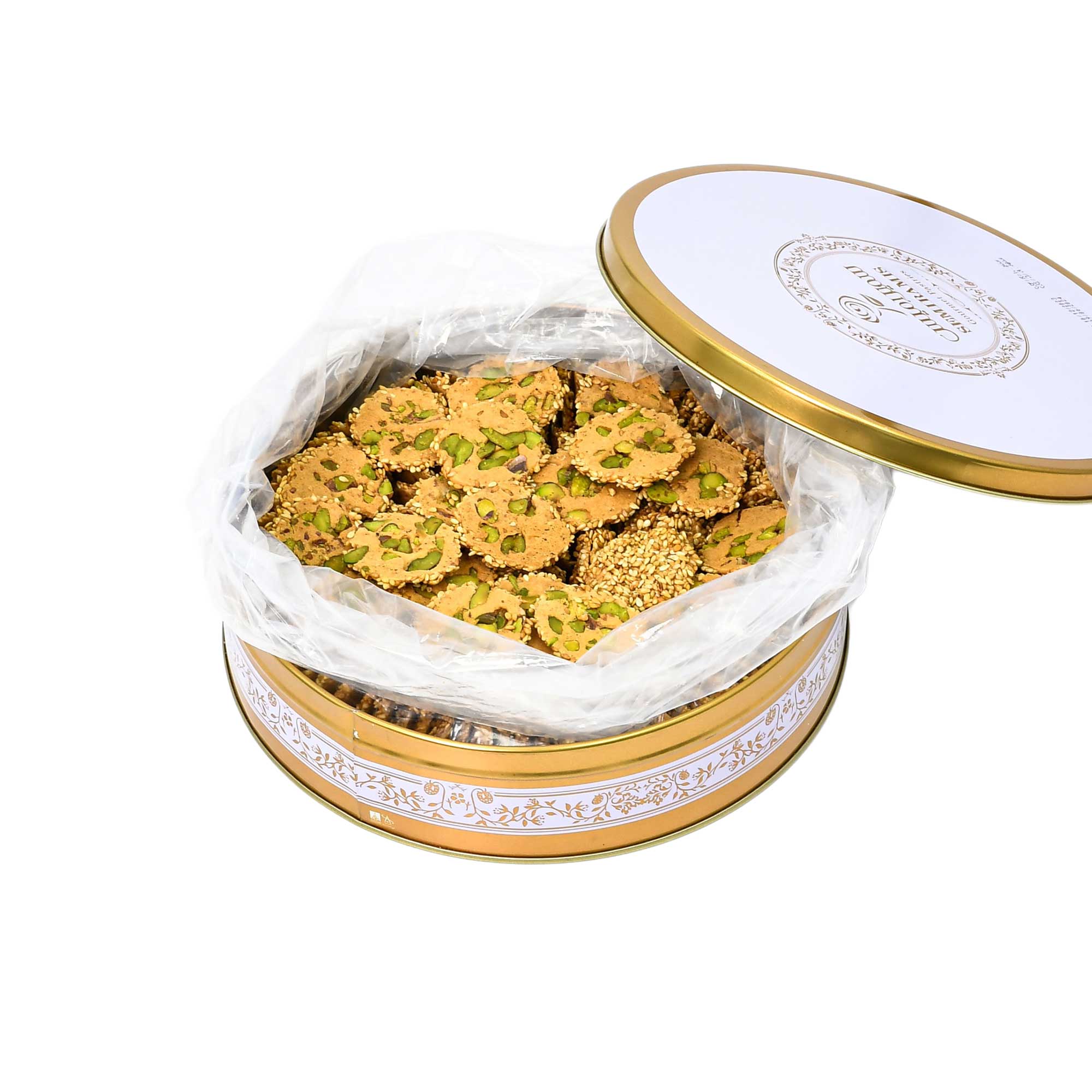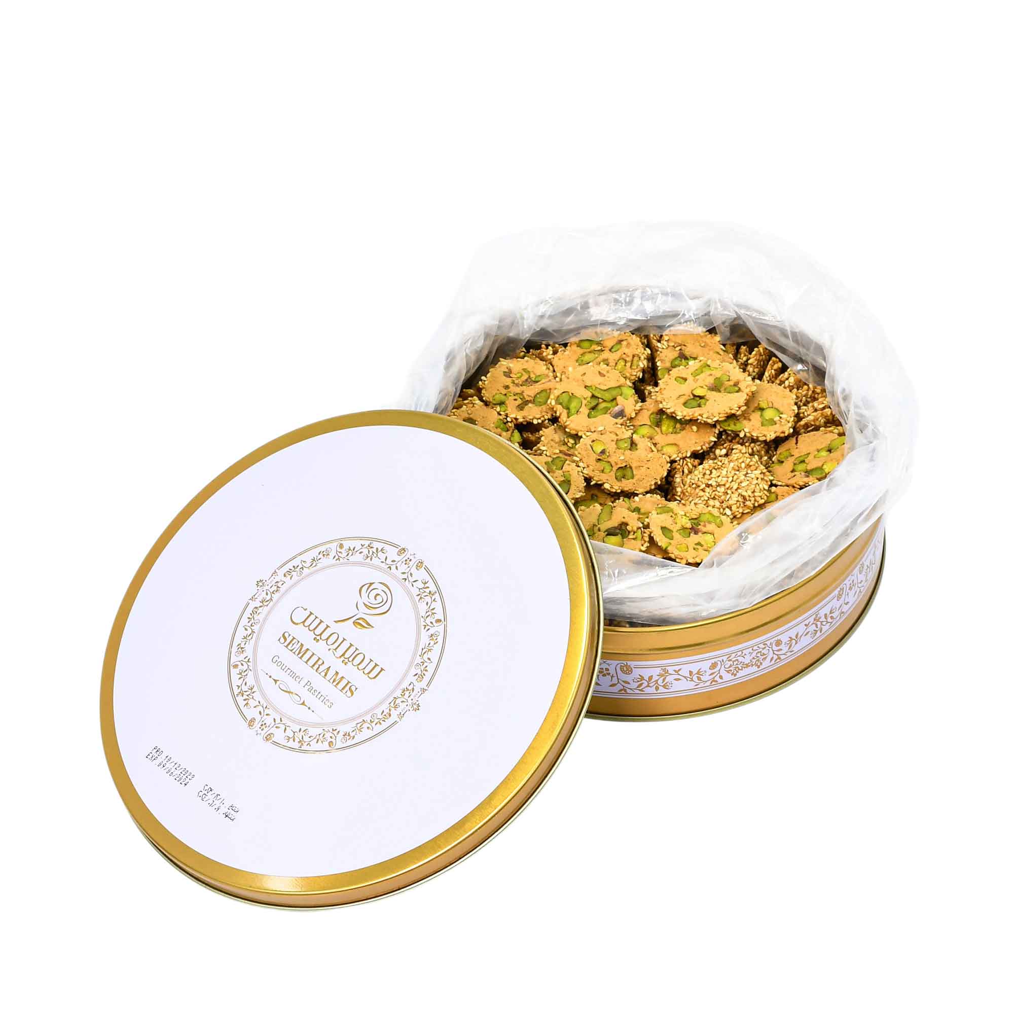 Semiramis Barazek is a type of traditional Middle Eastern cookie that is known for its thin and delicate texture, as well as its distinct flavor and nutty crunch. The cookie is made by combining wheat flour with animal ghee, which gives it a rich and buttery taste. The dough is then cut into petite circles and coated with a mix of roasted sesame seeds, crushed pistachios, sugar, and yeast. This gives the cookie its unique topping of crunchy sesame and nutty flavors. Barazek cookies are often served during special occasions and celebrations, and are particularly popular during the festive season in the Middle East. They are enjoyed as a sweet and indulgent treat, often paired with a cup of Arabic coffee or tea. With its combination of different flavors and textures, Semiramis Barazek remains a beloved and sought-after delicacy in many Middle Eastern countries. SPECIFICATIONS