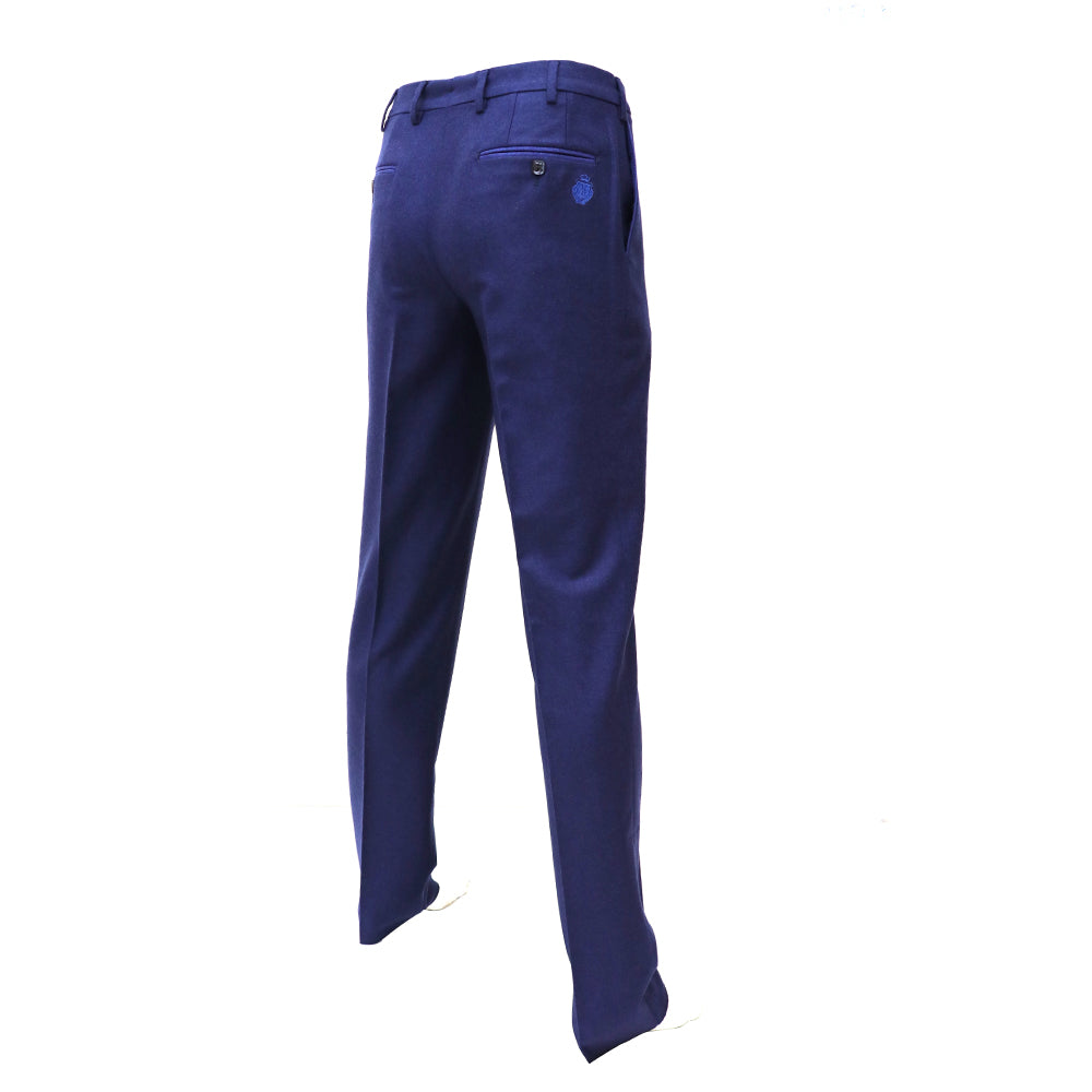 Billionaire navy blue color formal trouser, featuring a classic cut, made up of a comfortable fabric such as 100% wool. pleated model features 2 slant pockets on the front and 2 slits with button at the back. with the brand crest embroidered at the right back pocket. square logoed buttons made up of mother of pearl.