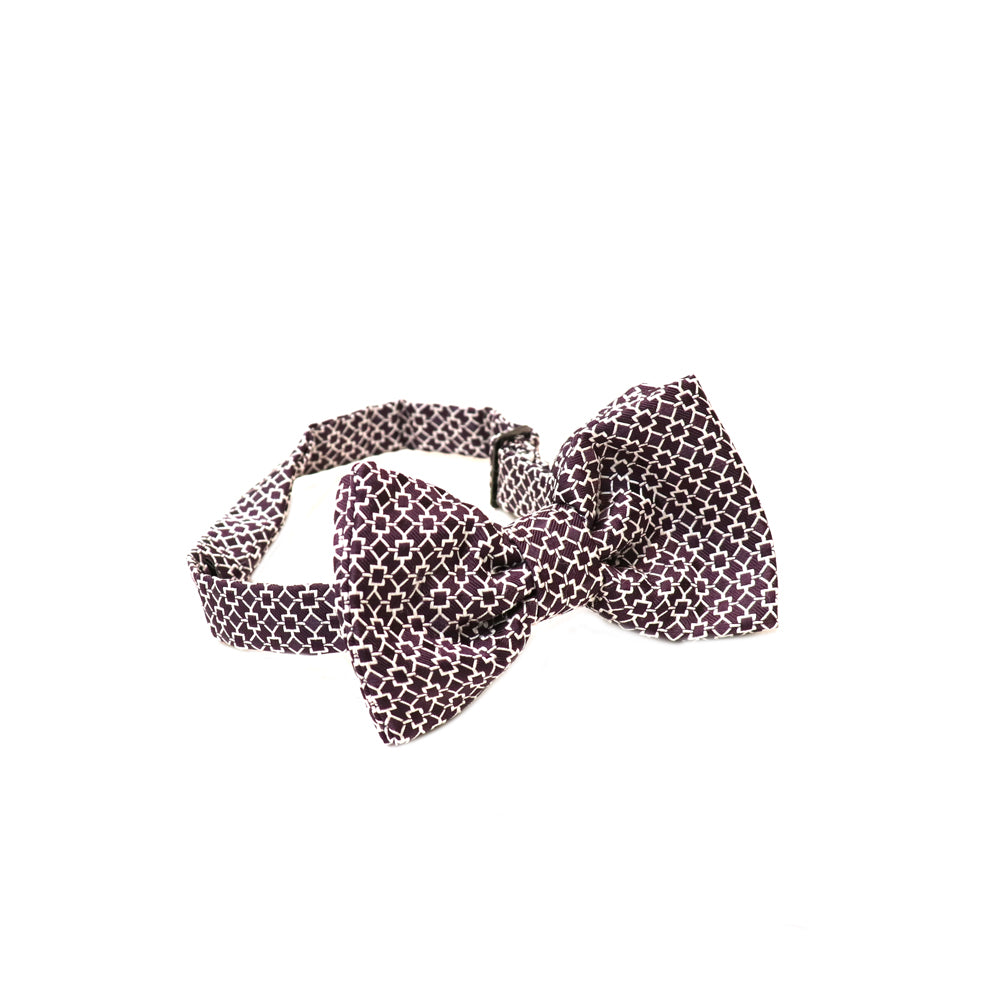 Billionaire maroon and white color accessory, featuring a blend silk bow tie with jacquared geometric patterns, made up of a combination of 57% silk and 43% polyester.