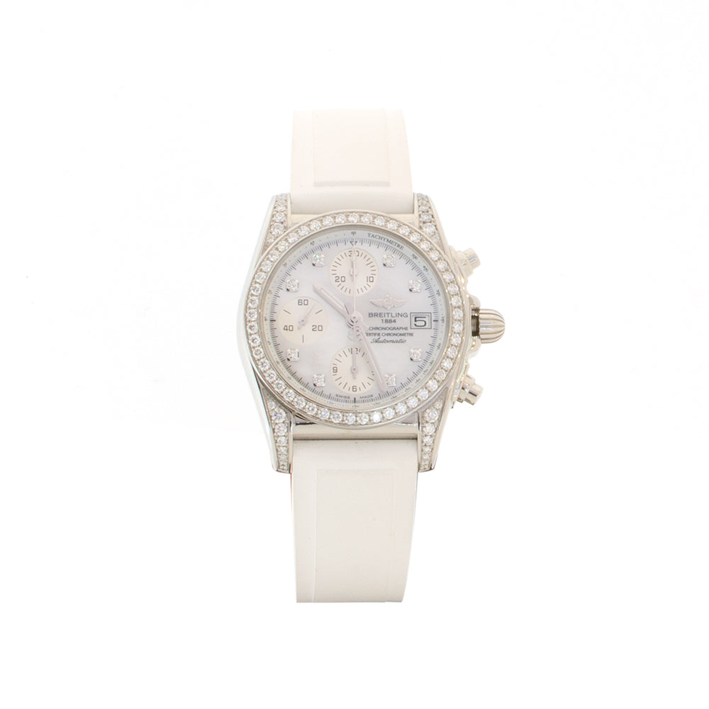 Chronomat 38 autom chronograph steel case with diamonds diamonds bezel mother of pearl diamond silver subdials diamonds di