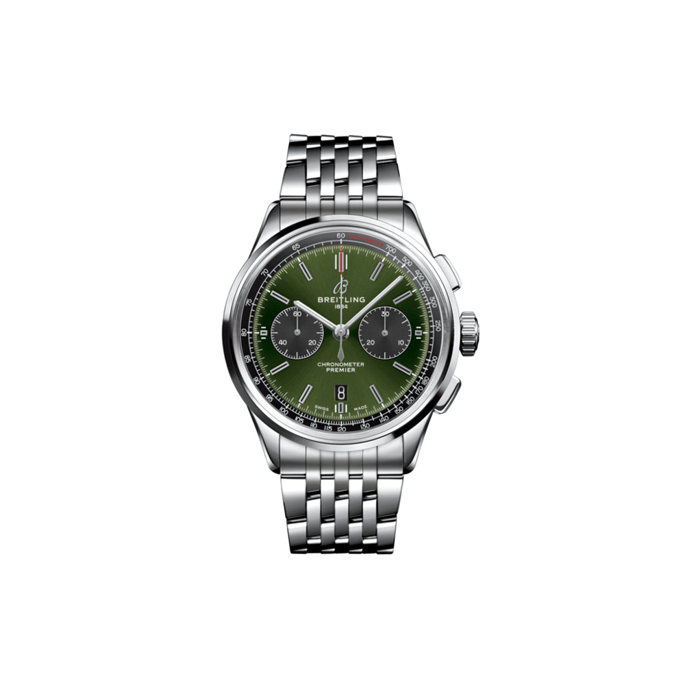 The Breitling Premier B01 Bentley British Racing Green is a stunning luxury watch that pays homage to the partnership between Breitling and Bentley. The watch features a 42mm stainless steel case with a British racing green dial, which is a nod to the iconic color of Bentley's racing cars. The dial also features silver sub-dials and a date window at 6 o'clock. The watch is powered by a reliable and accurate automatic movement, the Breitling Caliber 01. This movement is known for its precision and has a power reserve of 70 hours. Made with high-quality materials, the Breitling Premier B01 Bentley British Racing Green is both stylish and durable. The steel case and bracelet give the watch a sleek and sporty look, perfect for any occasion. The watch also has a 10 ATM water resistance, making it suitable for everyday wear. To protect the dial from scratches and damage, the watch is equipped with a scratch-resistant sapphire crystal. The bezel is also made of steel, adding to the overall toughness of the watch. The and functional timepiece that represents the collaboration between two iconic brands. Its combination of British racing green, steel, and sleek design make it a coveted addition to any watch collection.