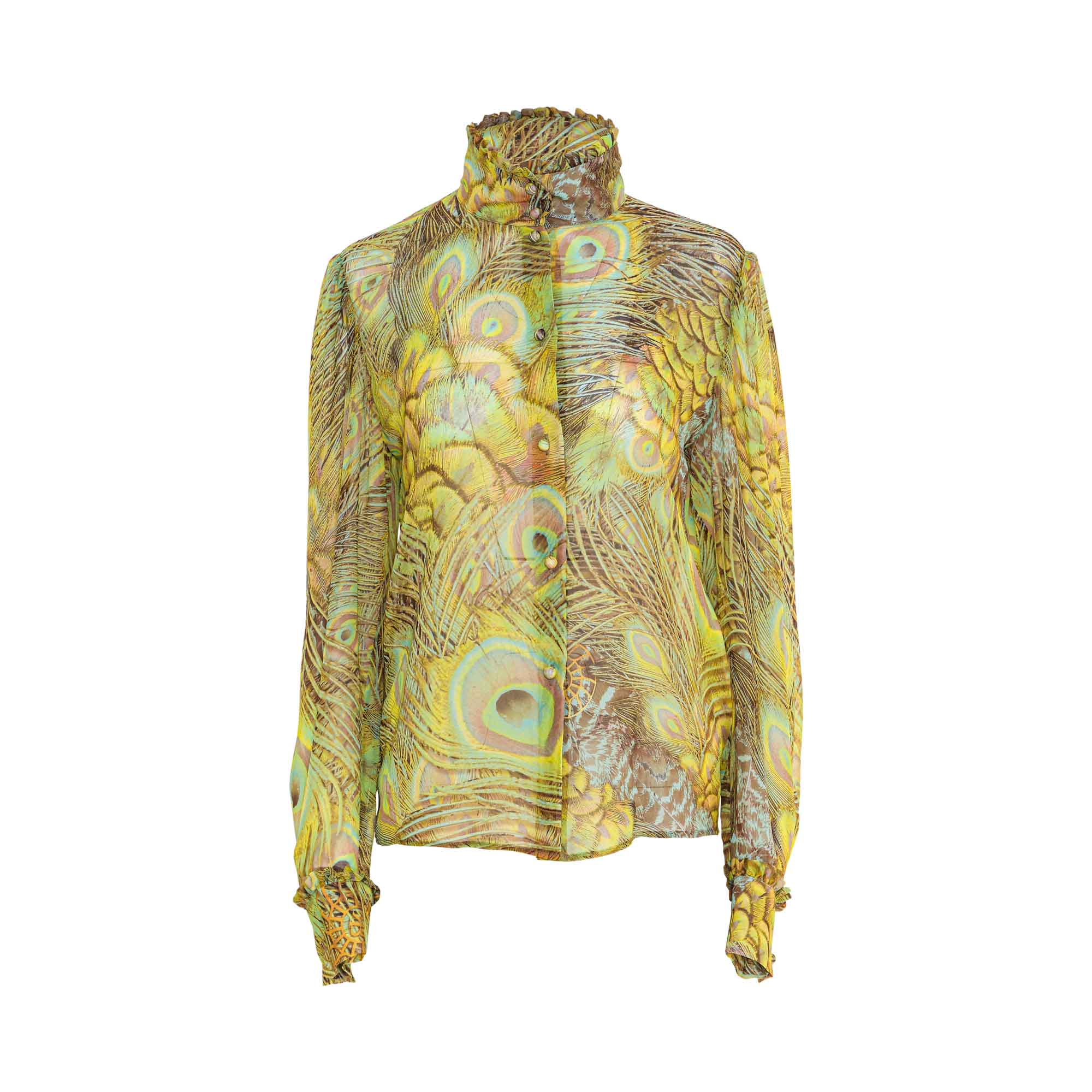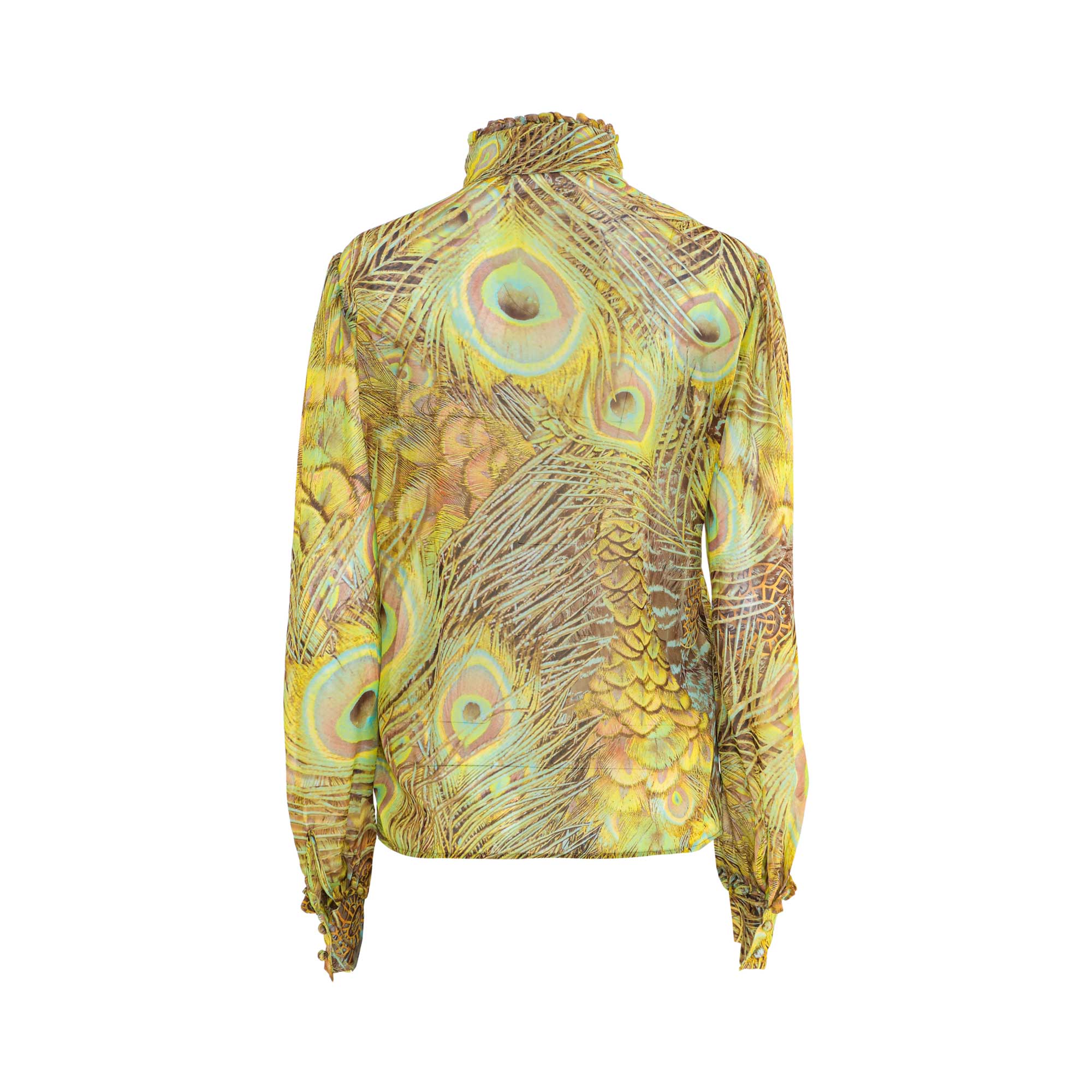The Barbara Rizzi Atelier Rania Long Sleeve Yellow Shirt is a must-have staple for your wardrobe. This gorgeous printed georgette shirt is crafted with the highest quality materials and designed with a flattering silhouette and feminine detail on the collar and cuffs. The limited edition bespoke Peacock design with an eye-catching hue of yellow is a unique and vibrant addition to your wardrobe that will easily add spice and style to any outfit. The perfect complement to a dressy pant or a pair of jeans- you'll instantly look chic with this powerful shirt. Furthermore, this Italian-made shirt is locally produced with the utmost attention to detail. Its cut is tailored beautifully to fit the modern woman with elegance and grace. Don't hesitate to spice up your wardrobe today with the stunning Barbara Rizzi Atelier Rania Long Sleeve Yellow Shirt. SPECIFICATIONS