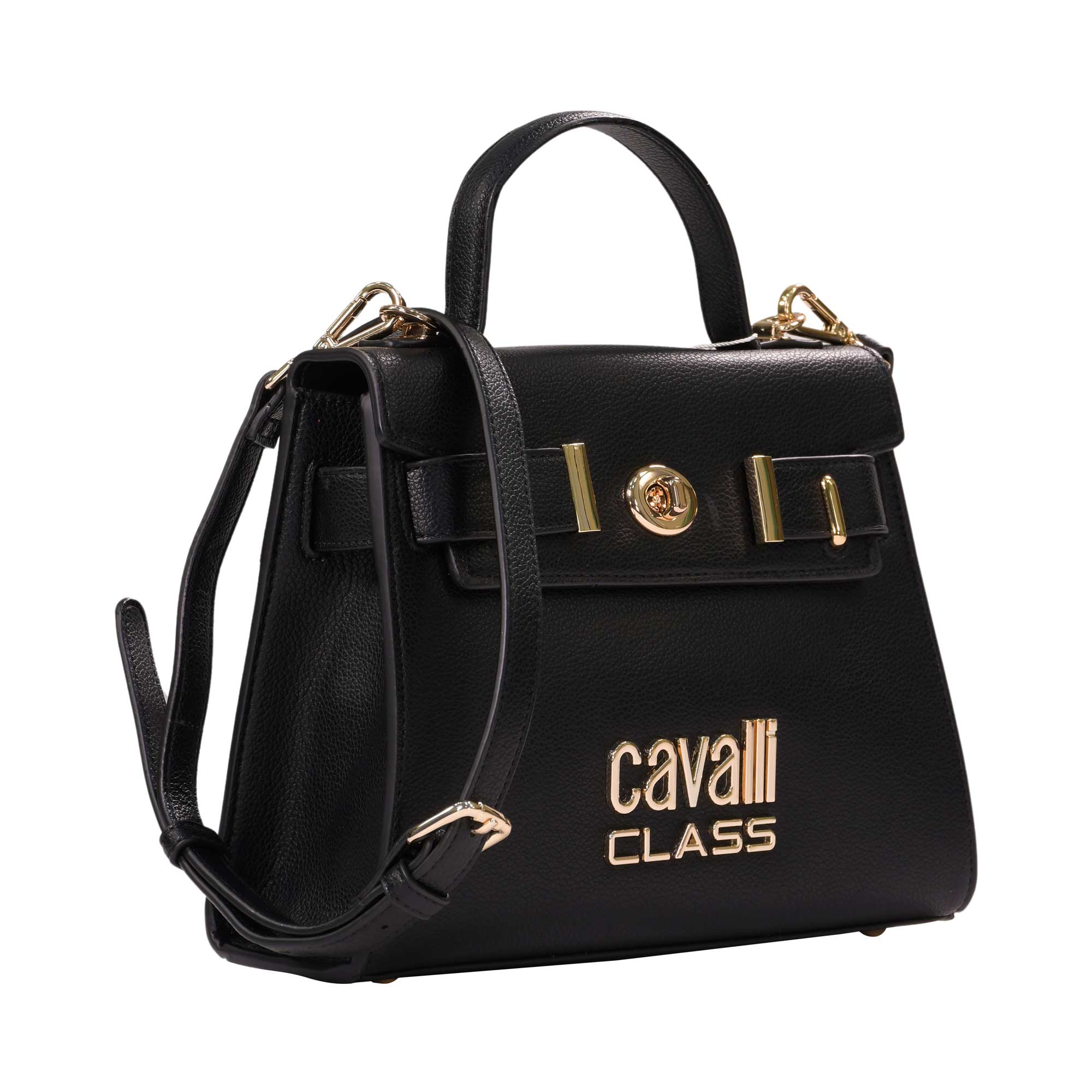 | The Cavalli Class Women's Black Top Handle Handbag is the perfect accessory for those who want to keep up with the latest fashion trends. This satchel is designed to meet all your needs, whether you are carrying essentials, cash, or cards. It is made from durable material and features spacious pockets, compartments, and card slots to keep all your belongings organized. The intelligent closure of this handbag ensures the safe storage of your valuables, giving you peace of mind while on the go. The stylish color not only adds a touch of elegance to your outfit but also showcases Cavalli Class's commitment to excellence. The blend of style and utility makes this handbag a must-have for any fashion-forward woman. The bag type is a classic satchel. The twist lock closure adds a unique and stylish touch, making it stand out from other handbags. Additionally, the strap is removable, allowing you to switch between carrying it by the top handle or wearing it over your shoulder or cross-body. With the Cavalli Class Women's Black Top Handle Handbag, you can experience the latest fashion trends while staying organized and stylish. Its versatility, durability, and unique design make it a must-have accessory for any woman looking to make a bold fashion statement. SPECIFICATIONS