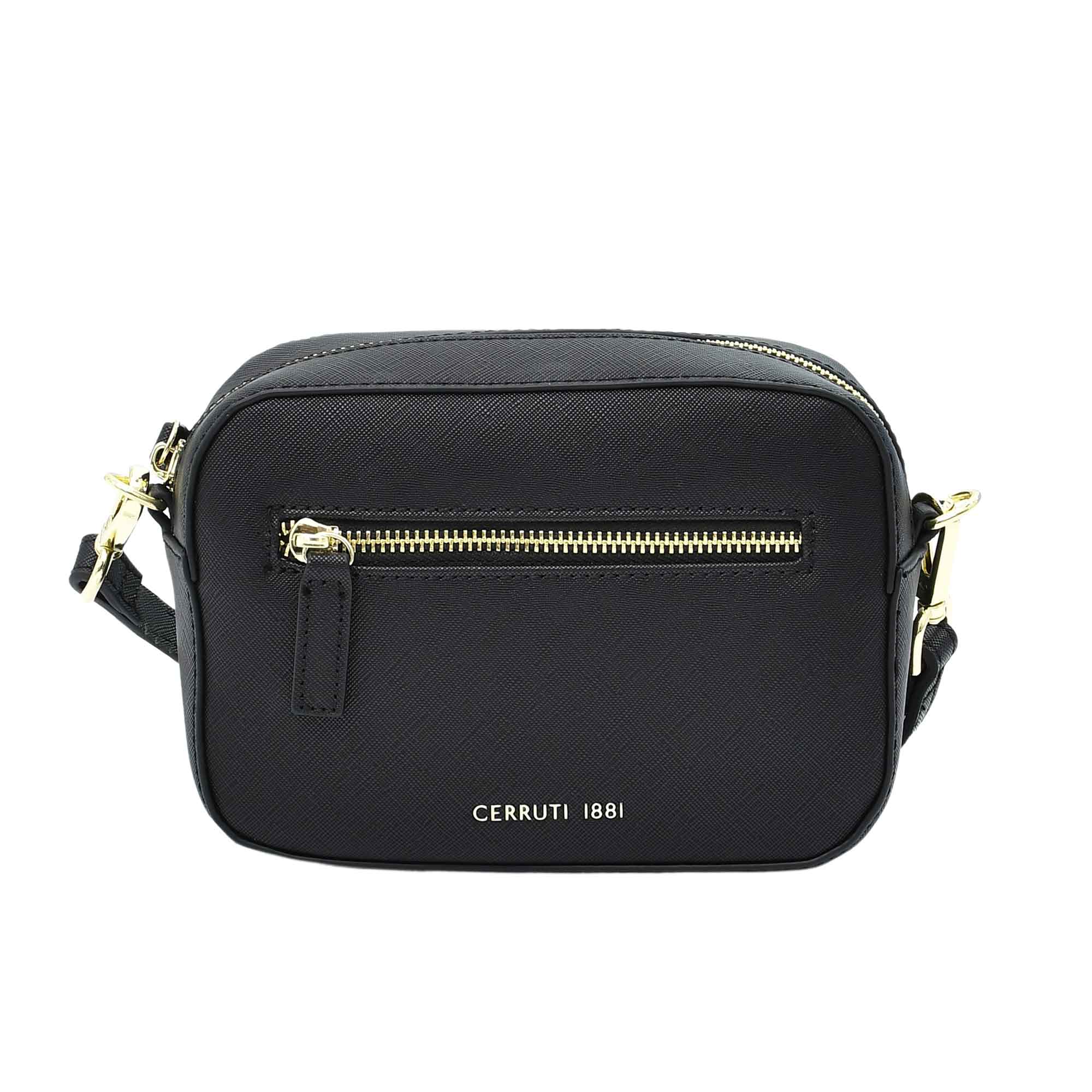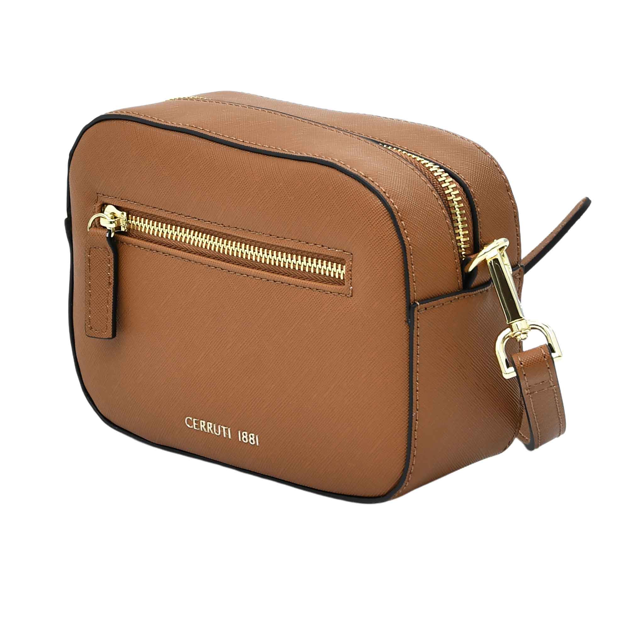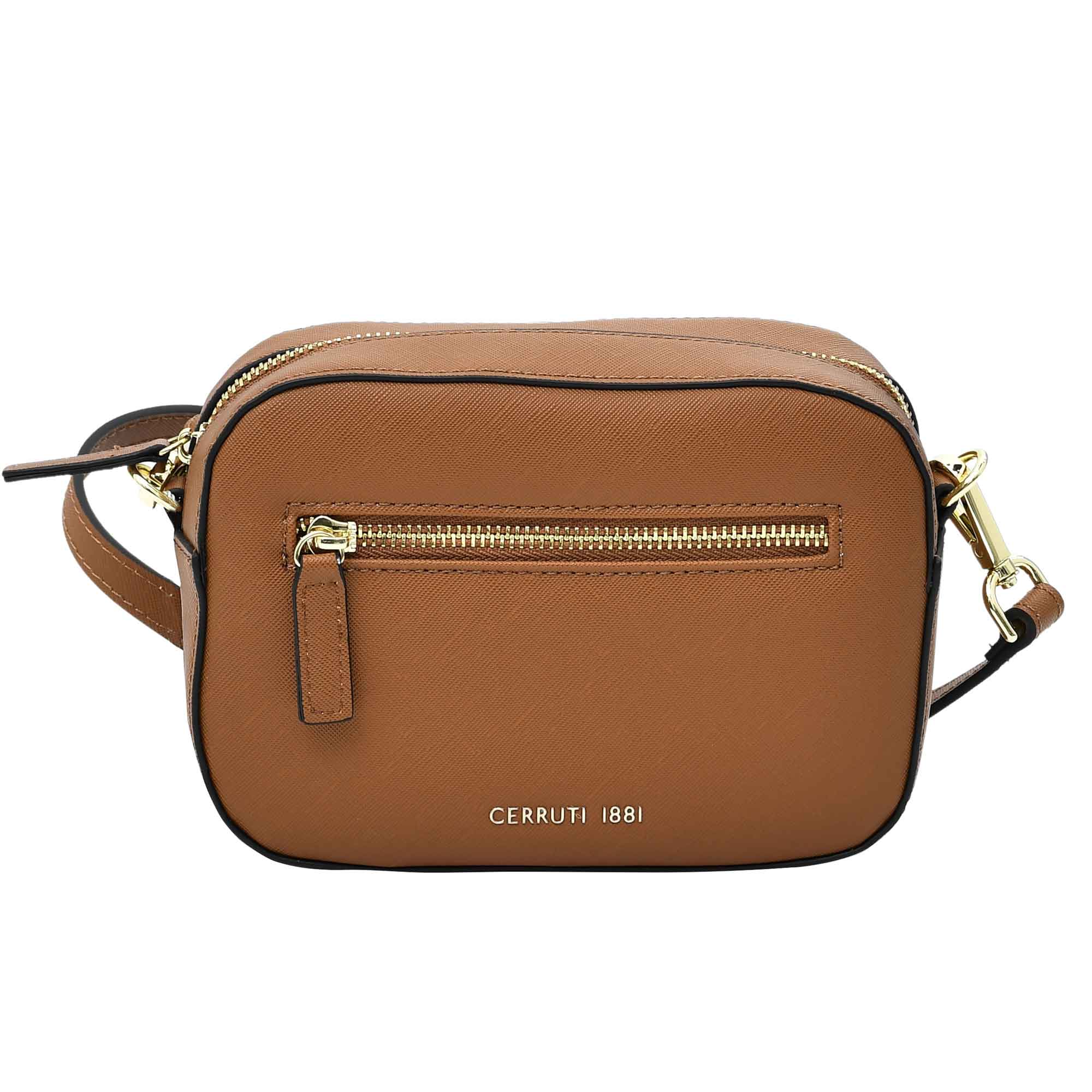 The Cerruti Women's Leather Cross-Body Bag is a stylish and practical accessory crafted from a textured material that closely resembles Saffiano leather, renowned for its durability and scratch-resistant qualities. The bag features a warm, rich brown hue, often described as camel or cognac, which gives it a sophisticated and versatile appeal. Its design is enhanced by contrasting black piping along the edges, providing a defined and polished look. For added convenience, the bag includes a detachable and adjustable strap, allowing it to be worn comfortably across the body or carried as a shoulder bag, making it an ideal choice for everyday use or special occasions.