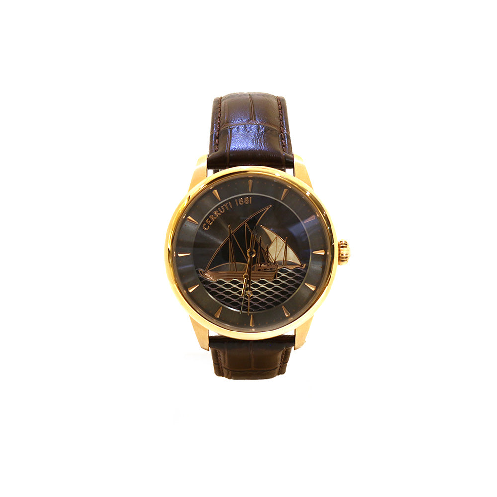 Cerruti Men's Watch Albiano Collection Rosegold Case/ Gray Dial with Two Layer Dial & Yacht Design/ Brown Leather Strap