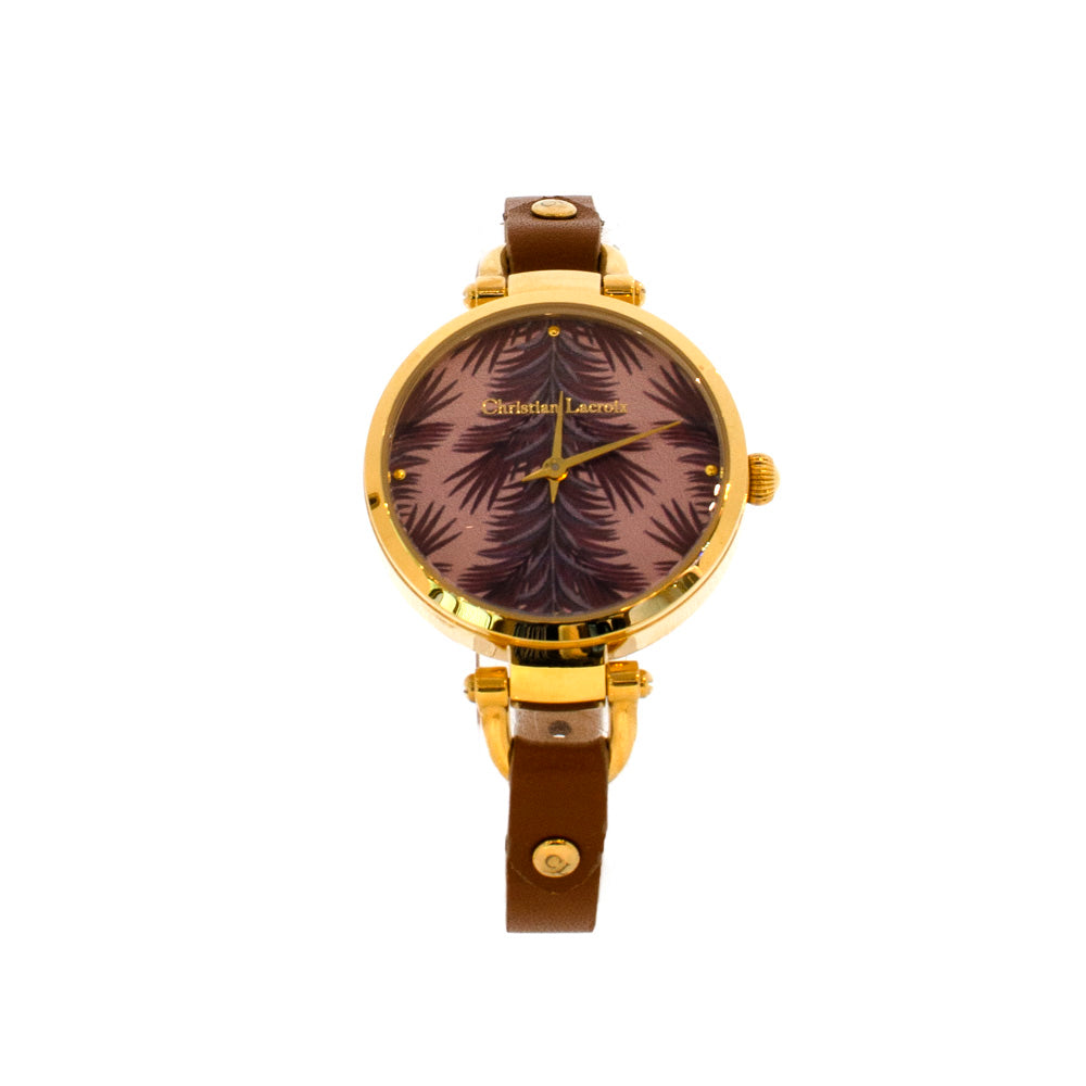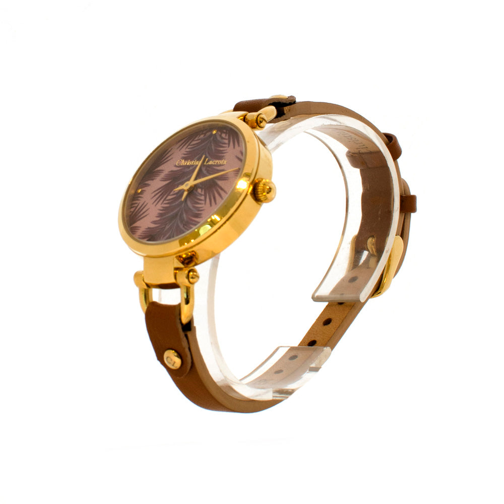 Christian lacroix ladies watch goya collection, gold plated case, brown leather strap, dial with printed leaf